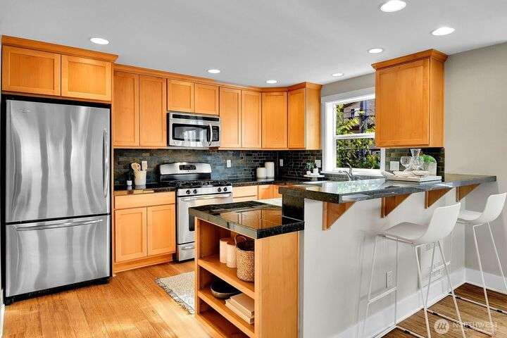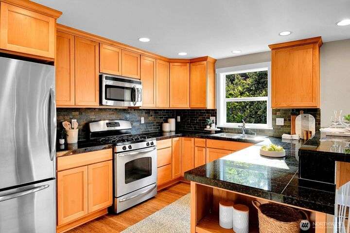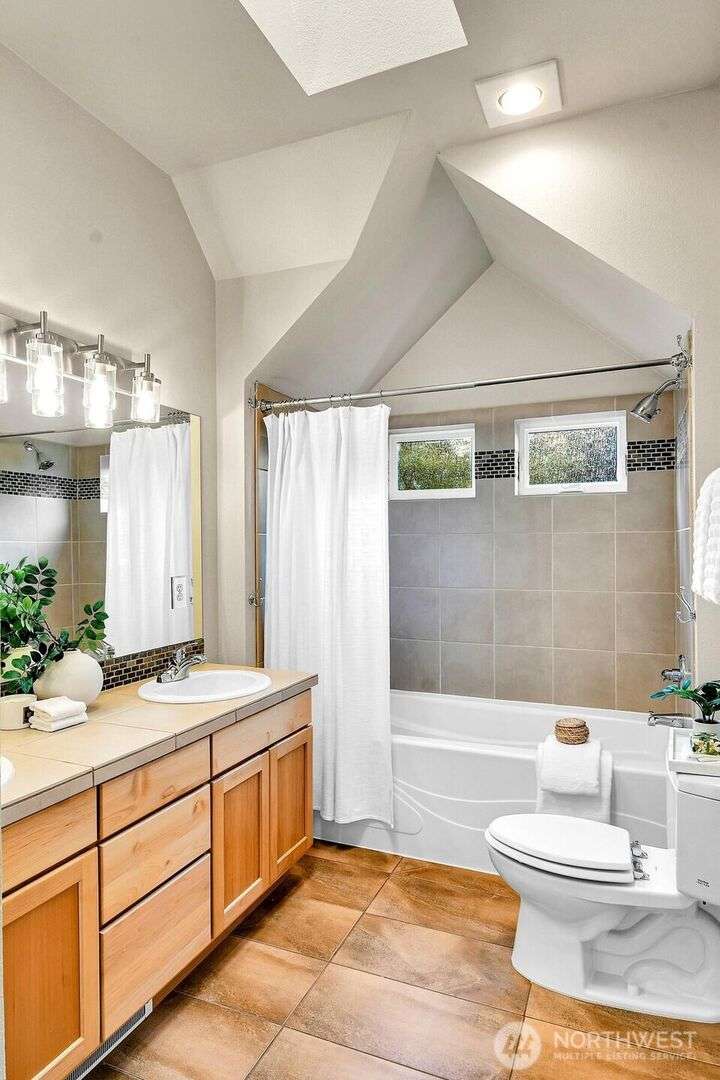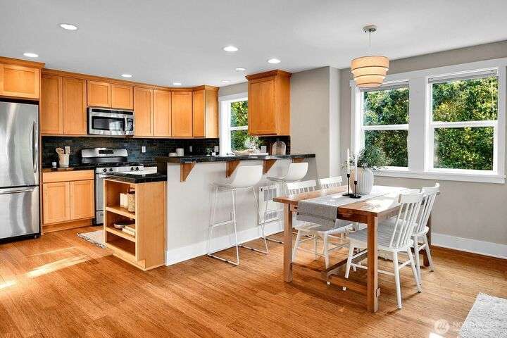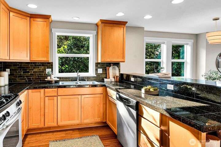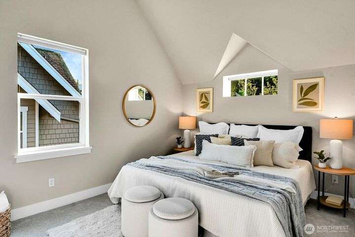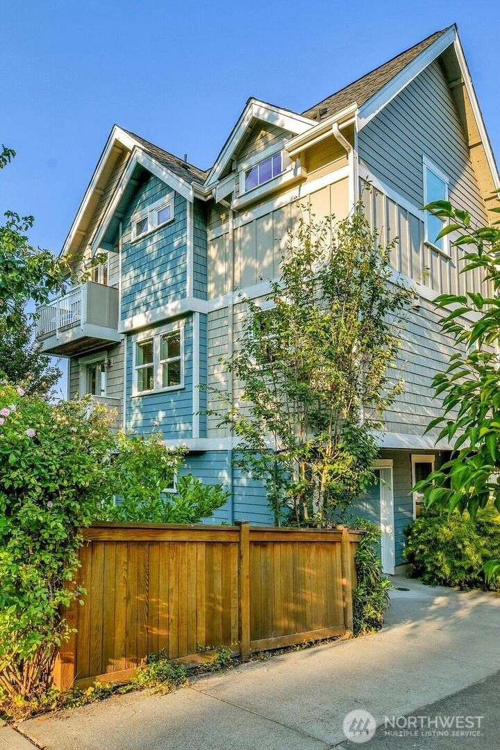 Remember when townhomes felt spacious and had nice views? This like-new gem has fresh paint inside & out, updated lighting, abundant windows, a spacious foyer, 2 balconies, a sunny west-facing patio, and a garage you can actually fit a car in! A chef’s kitchen features pristine maple cabinets, granite counters, and gleaming hardwoods. One bedroom/office is on the main level, with 2 vaulted-ceiling bedrooms up—all this a short stroll from cafes, retail & the PCC coming soon in Madison Valley.