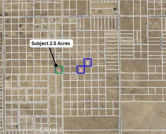 Explore the possibilities with this 2.5-acre parcel, ideally flat and usable for a range of projects. Perfectly suited for building a private ranch, this property is conveniently located just off Rosamond Blvd. It offers expansive panoramic views of the valley and mountains, enhancing its serene rural appeal. A great investment opportunity, enjoy proximity to Willow Springs Racetrack and easy access to the nearby towns of Rosamond, Lancaster, and Tehachapi, CA.