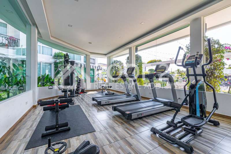 * Fully equipped gym, sauna, and rooftop jogging track