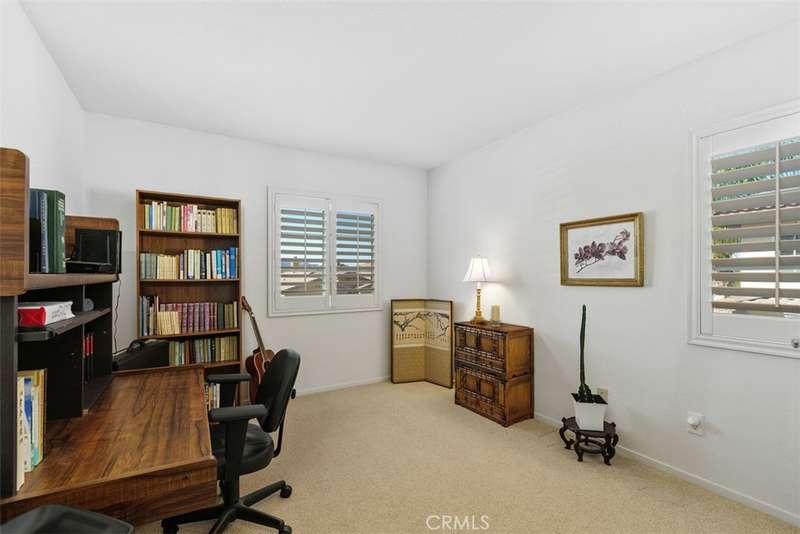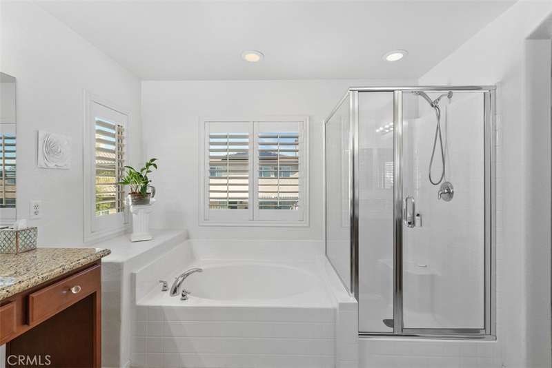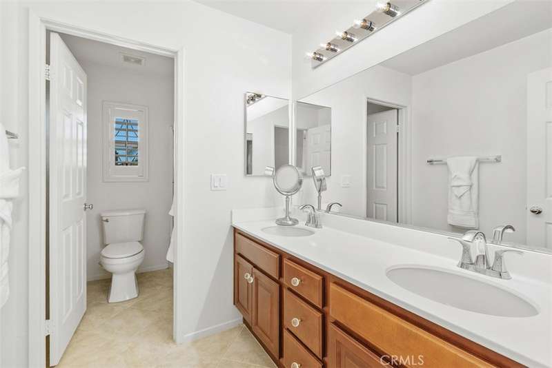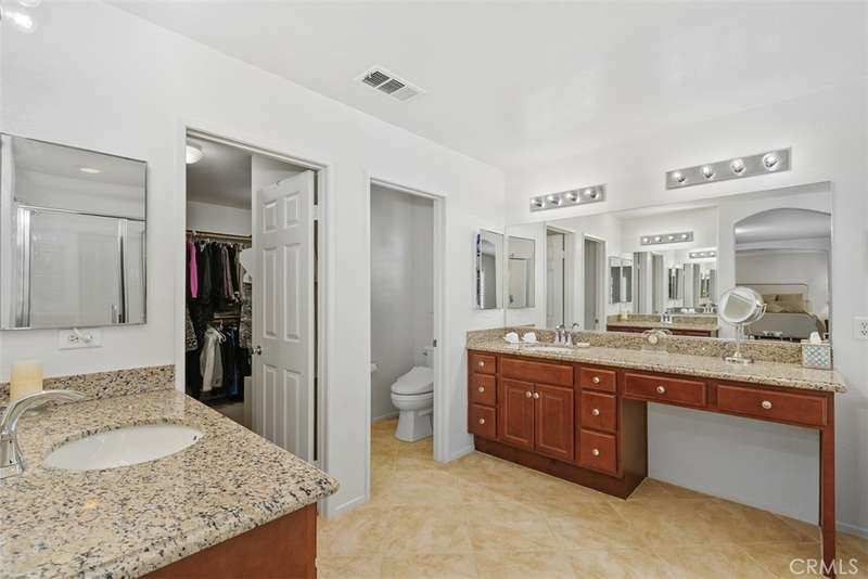 Upstairs, the primary suite offers a private retreat with double-door entry, a sitting area leading to a balcony, and a luxurious bath with dual vanities, a soaking tub, separate shower, bidet, and a large walk-in closet. Two additional bedrooms, each with walk-in closets, share a hallway bath with dual sinks. A built-in workstation provides the perfect spot for study or remote work.