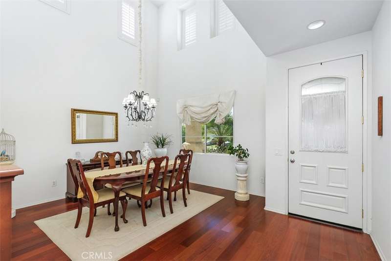 Inside, soaring ceilings in the formal dining area and rich hardwood floors throughout the main level create a warm, inviting atmosphere. Plantation shutters, a cozy living room fireplace, and abundant natural light add to the home's comfort and style.
