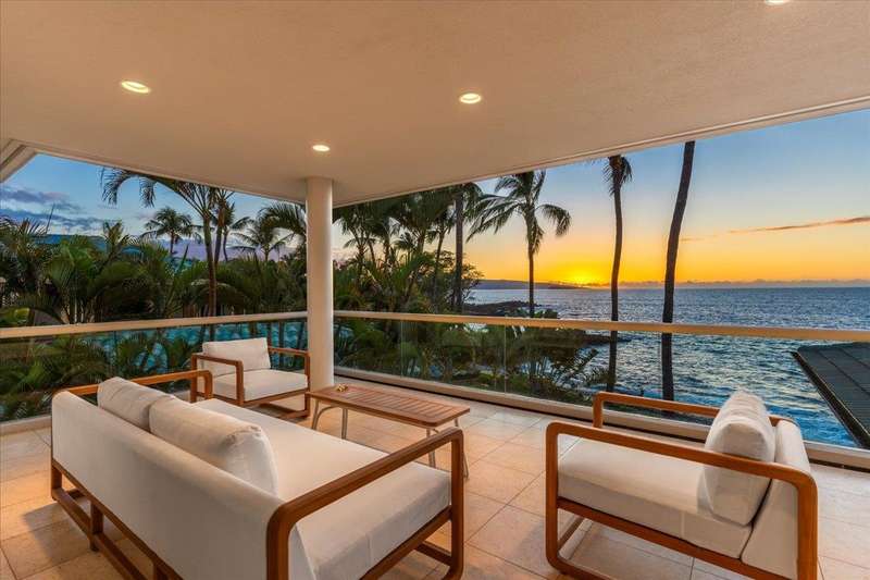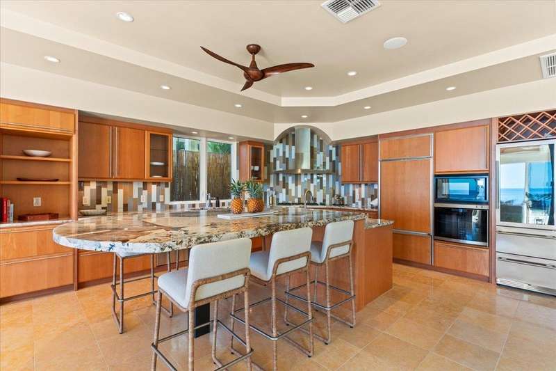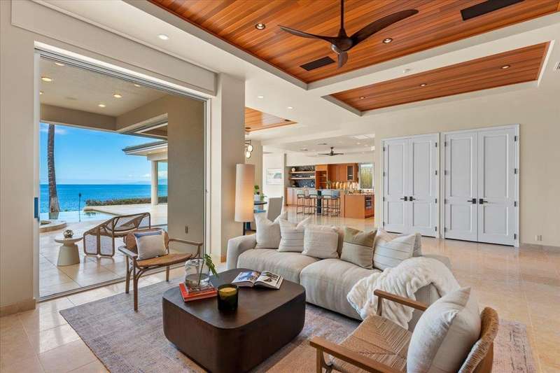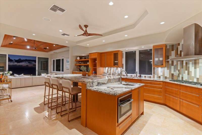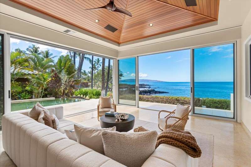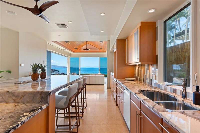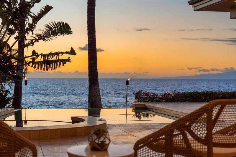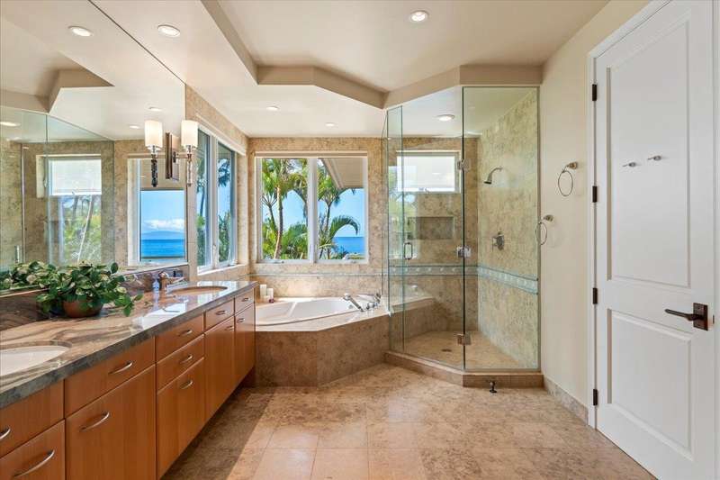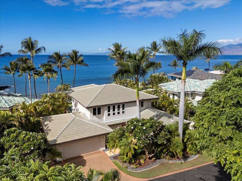 Nestled into a gated residential condominium community on Maui’s sun-drenched south shore, this 4-bedroom, 4.5-bath home provides over 4,300 sq.ft of interior space, beautifully renovated in 2024. This home offers stunning sunset views year-round. The updated kitchen has a substantial two-level island with Patagonia quartzite countertops and bar seating for six, with Leicht cabinetry, tile backsplash and amenities like a wine fridge and coolers. Two distinct living spaces and dining area open to the lanai, pool and spa creating an ideal setting for entertaining. In the winter months, enjoy whale watching with views of Molokini, Kahoolawe, Lanai, and Molokai. Enjoy snorkeling at one of the most premier snorkeling spots “Turtle Town”. On the ground floor there are two en suite bedrooms. Upstairs, the primary suite features a private ocean-view lanai, a wet bar and a bathroom with a soaking tub and large walk-in shower. The upper floor also contains the fourth bedroom and sitting area. Additional features include new 4-zone air conditioning, central vacuum system, recessed lighting, Jerusalem gold tile throughout, carpeted stairs and bedrooms, fresh paint inside and out, and wine cellar. New tile around the pool and spa. Just a short drive away you will find world-class dining, shopping and three exceptional golf courses.