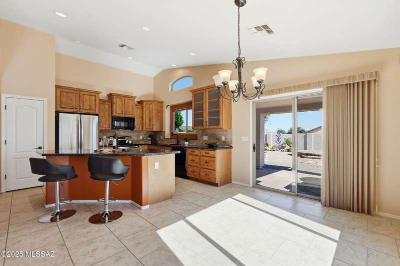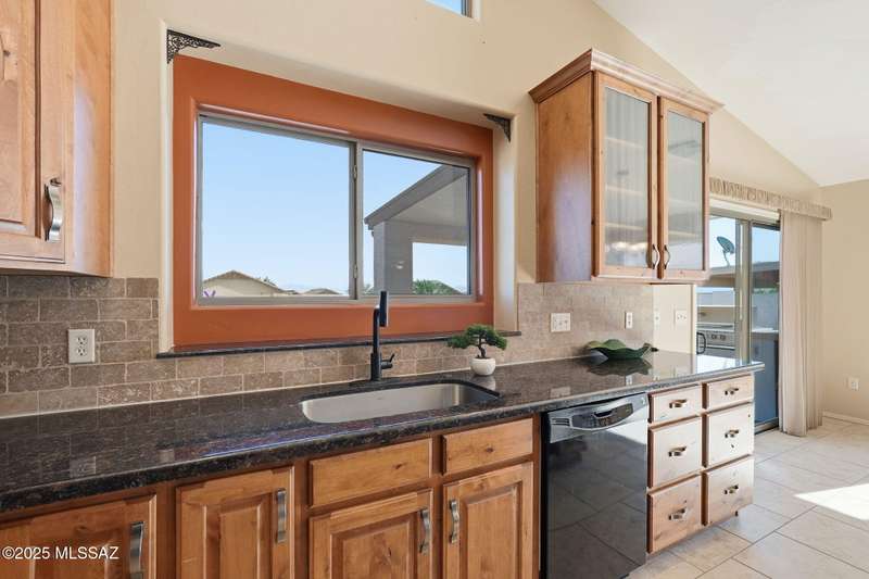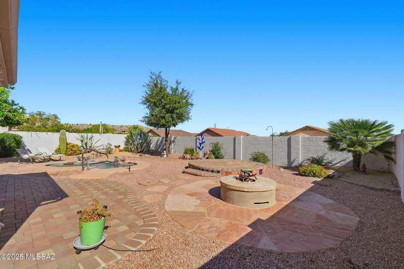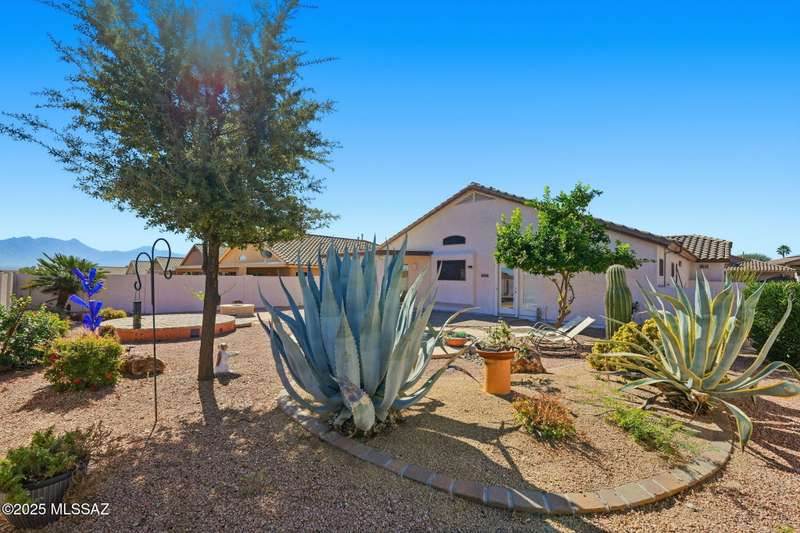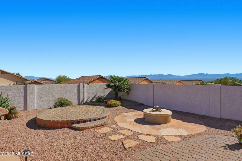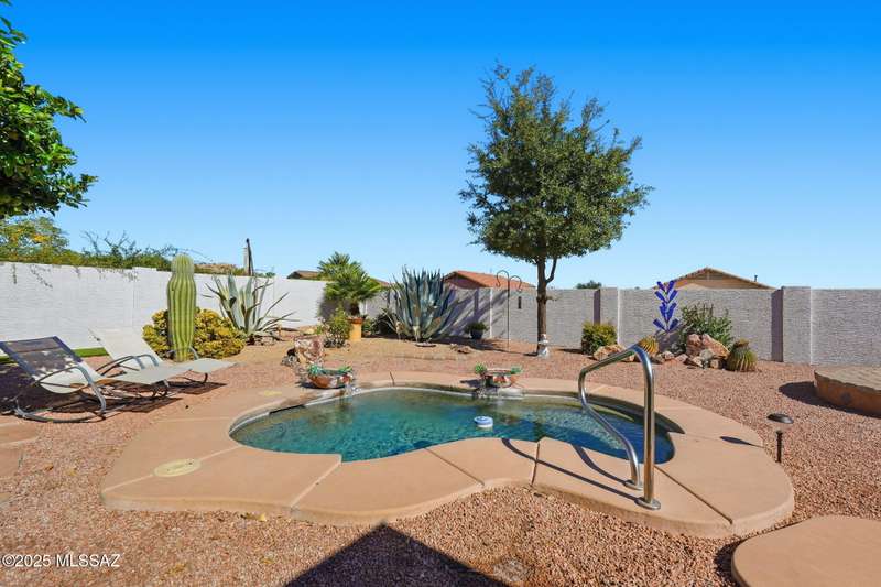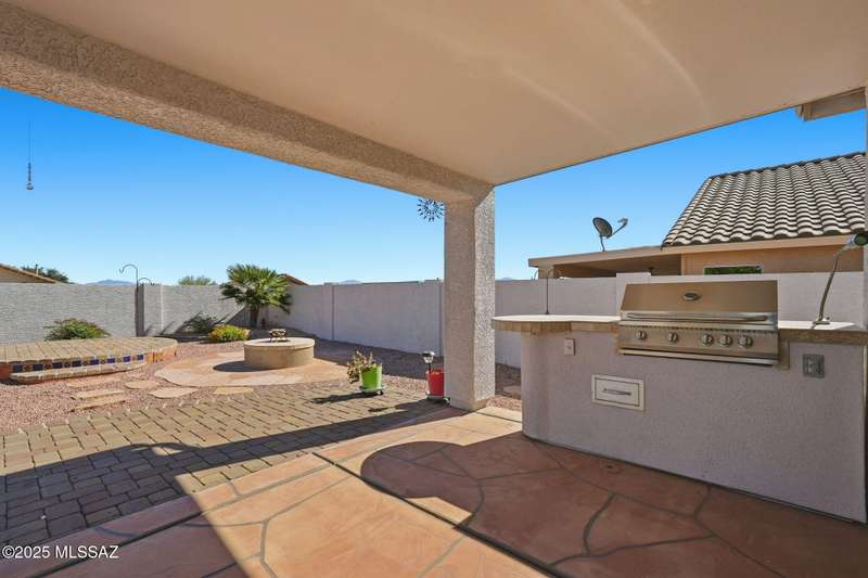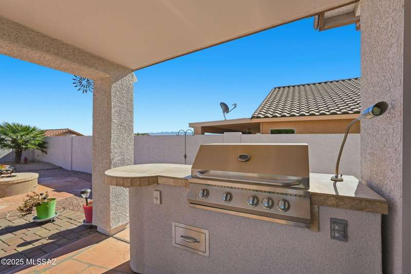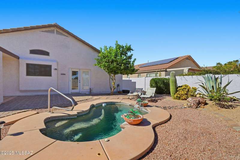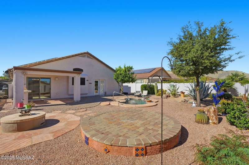 OWNED SOLAR, water softner, vaulted ceilings, knotty alder cabinets w/deep pot drawers,& a stunning backyard make this Desert Creek home a standout! This 2BR, 2BA + den layout features a remodeled kitchen w/granite counters, large island, travertine backsplash, stainless/black appliances, & a spacious pantry closet. Tile flooring throughout, except in the primary, w/the primary suite offering a walk-in closet & French doors to the patio. Enjoy outdoor living w/a built-in grill, gas fire pit, extended paver patio, elevated dining area w/mountain views, & a delicious producing lemon tree. Relax in the SPOOL--cool by day or heated for a soothing soak at night. Expanded 2-car garage with 4' bump-out for extra storage or workbench.OWNED SOLAR ensures comfort & efficiency year round!WELCOME HOME