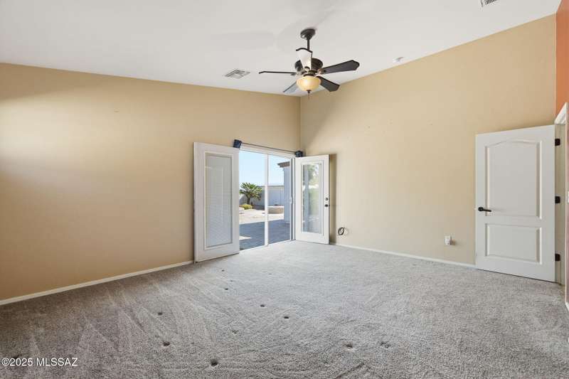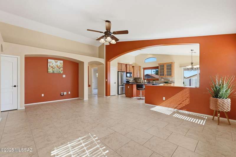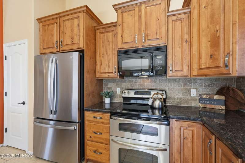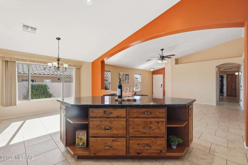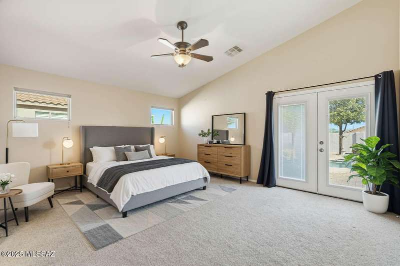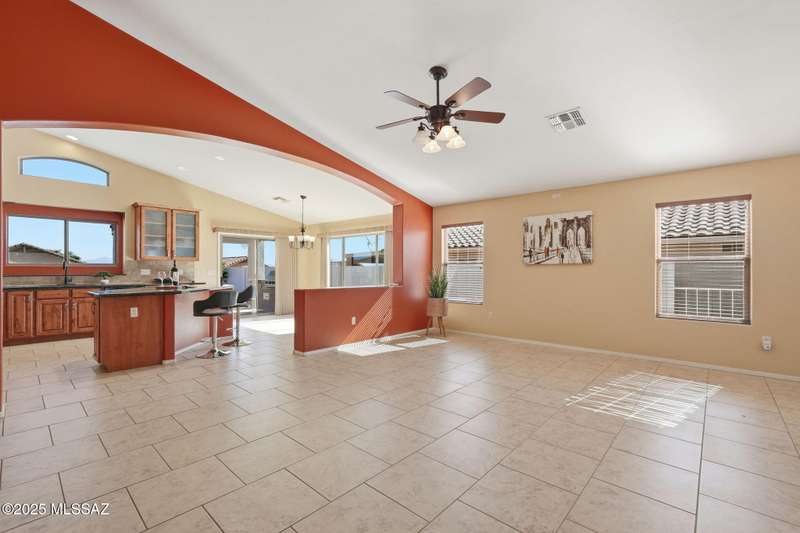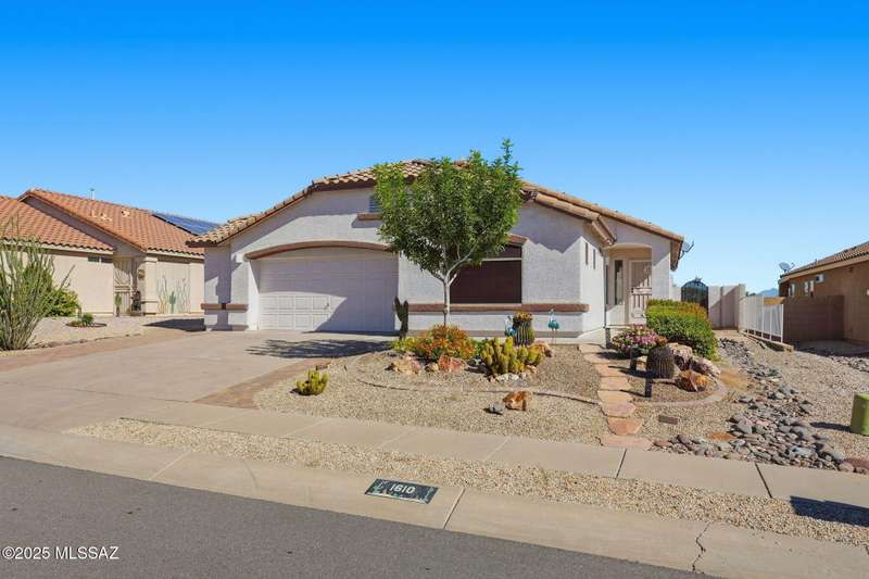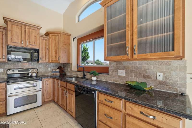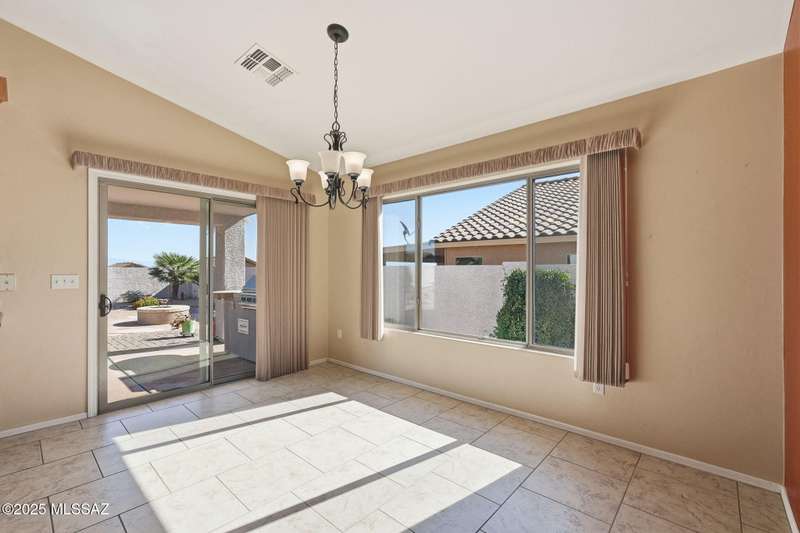 OWNED SOLAR, water softner, vaulted ceilings, knotty alder cabinets w/deep pot drawers,& a stunning backyard make this Desert Creek home a standout! This 2BR, 2BA + den layout features a remodeled kitchen w/granite counters, large island, travertine backsplash, stainless/black appliances, & a spacious pantry closet. Tile flooring throughout, except in the primary, w/the primary suite offering a walk-in closet & French doors to the patio. Enjoy outdoor living w/a built-in grill, gas fire pit, extended paver patio, elevated dining area w/mountain views, & a delicious producing lemon tree. Relax in the SPOOL--cool by day or heated for a soothing soak at night. Expanded 2-car garage with 4' bump-out for extra storage or workbench.OWNED SOLAR ensures comfort & efficiency year round!WELCOME HOME