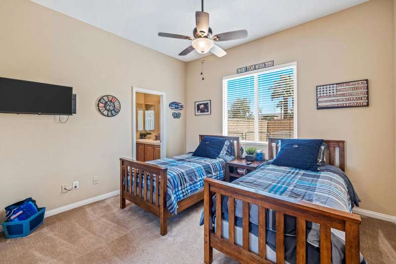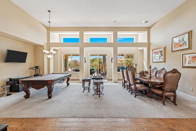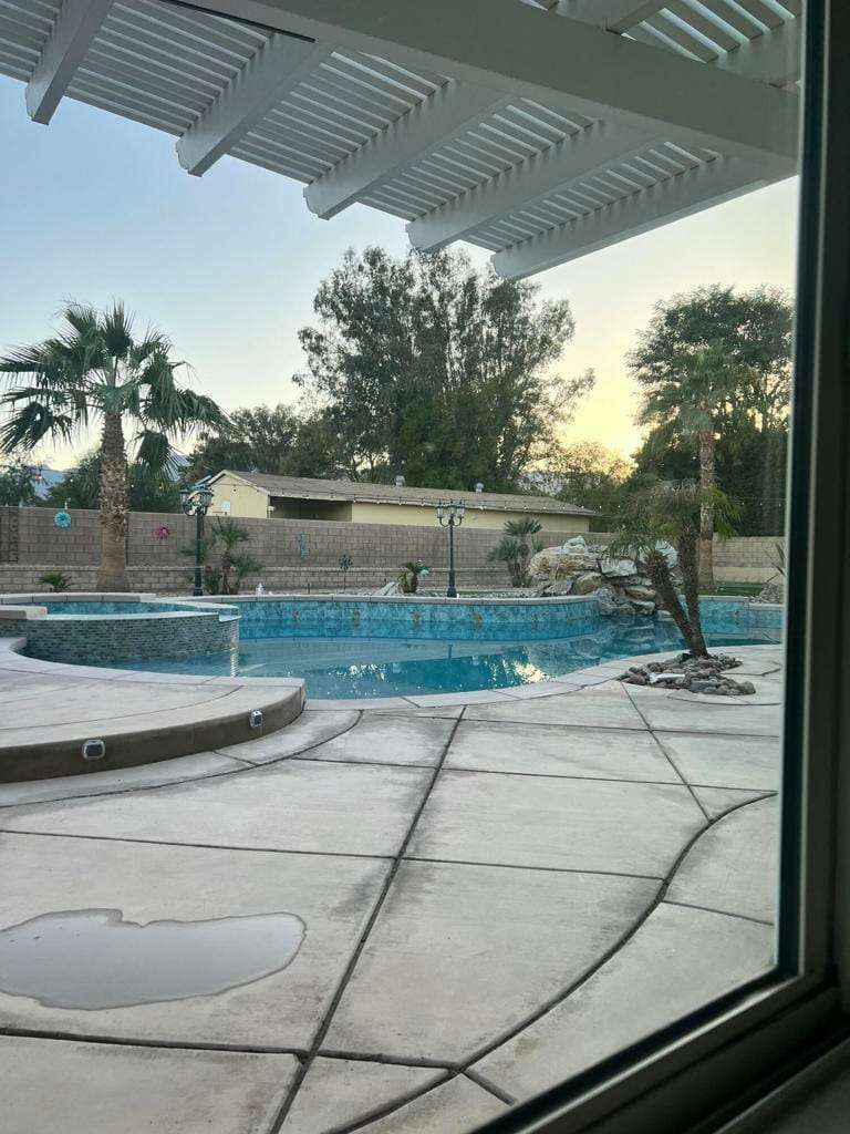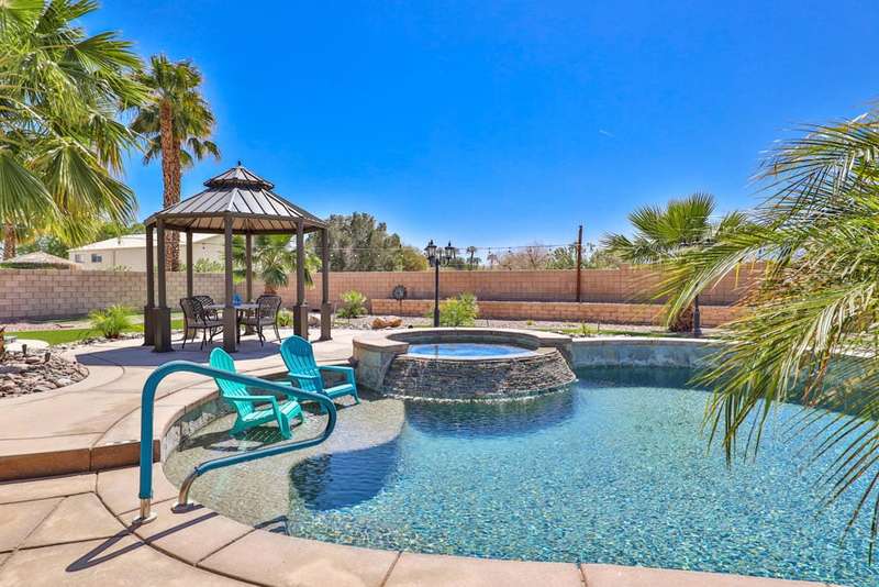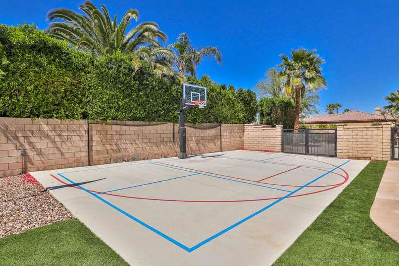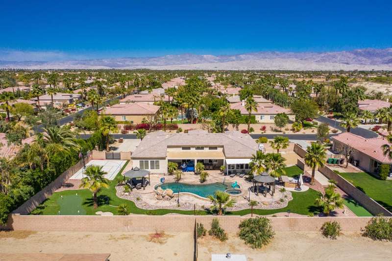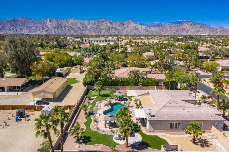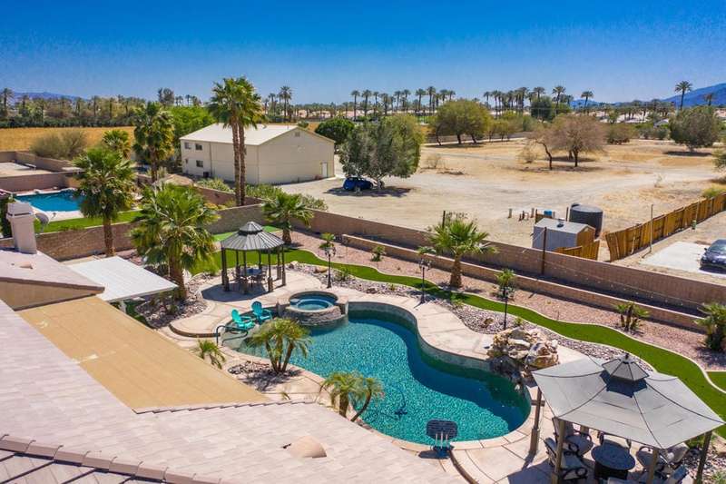 AVAILABLE ALL MONTHS!! Located in Desert River Estates located near the Polo Grounds where Coachella, and Stagecoach music festivals take place. It is spacious inside and has a great pool and outdoor relaxing area with mountain views. The great room has plenty of seating for your guests, the 65 inch flat screen TV or a quiet evening enjoying a roaring fire or glorious mornings allowing the natural beauty and sunlight to come in through the vast glass windows and doors. This home is set up perfect for entertaining with the seamless flow from the living area to the gourmet kitchen hosting stainless steel appliances including double ovens, granite countertops and a large island. The island comes equipped with 4 barstools for quick dining, adjacent to the kitchen table for 6. For more elegant dinners, the dining room offers seating for 8. The master suite offers a king bed, flat screen and private exit to the back patio. The master bath offers his and her sinks, a vanity area, soaking tub with a separate walk in shower. The second suite offers a queen bed, flat screen and a private full bath. The third bedroom hosts a queen bed and fourth bedroom hosts two twin beds, flat screens with a Jack and Jill bath. The fifth room doubles as an office and an extra bedroom with a daybed with a trundle below. The back patio oversized pebble-tec pool with a tanning shelf, pool umbrella and pool lounge chairs. Built in BBQ & Basketball court. Pack your bags..