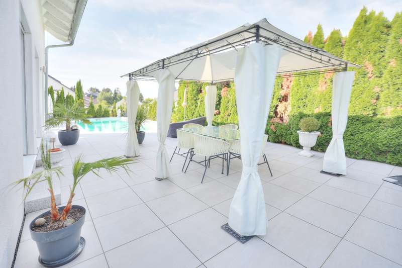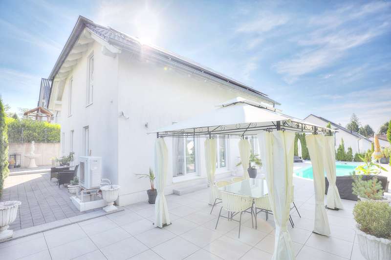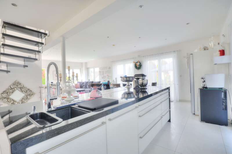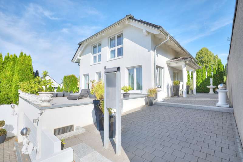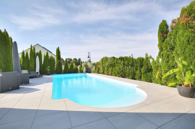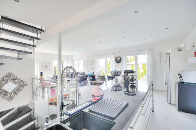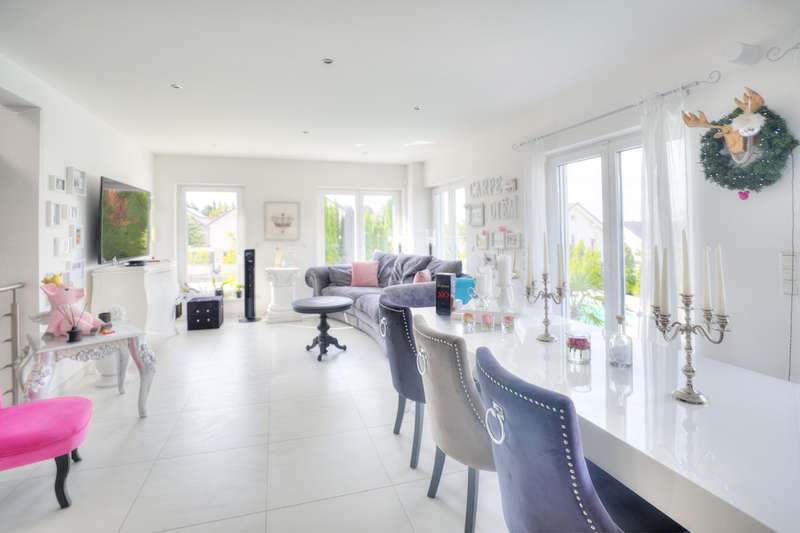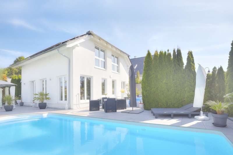 Modern detached house with pool, double garage and high-quality furnishings is looking for a new homeowner. This stylish property from 2012 extends over two living levels plus basement and is situated on a low-maintenance plot. Thoughtfully designed, it impresses with modern living comfort in a sought-after location. High-quality fittings, light-flooded rooms and an intelligent room layout make this feel-good oasis the perfect home for discerning buyers. The open-plan living and dining area impresses with generous space and floor-to-ceiling windows that create a bright, inviting atmosphere. The modern kitchen is equipped with high-quality built-in appliances and a cooking island - ideal for culinary experiences. Directly adjacent is the spacious terrace, which flows seamlessly into the well-kept outdoor area and invites you to relax. With a total of five rooms, including three comfortable bedrooms, the house offers plenty of space for the whole family. Two stylish bathrooms ensure a high level of living comfort, while the underfloor heating creates a cozy warmth in all rooms. A special highlight is the low-maintenance outdoor area with an exclusive outdoor pool, equipped with a counter-current system - ideal for sports enthusiasts. The leisure facilities are complemented by an in-house fitness room. Two outdoor parking spaces and a spacious double garage are available for vehicles. The property is in excellent condition and combines modern living with the highest quality of life. Come and view this exceptional home and see for yourself!