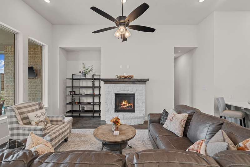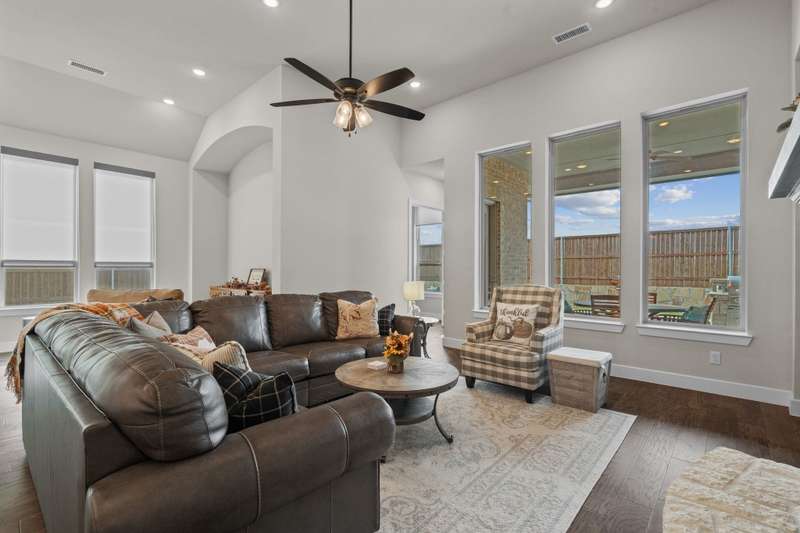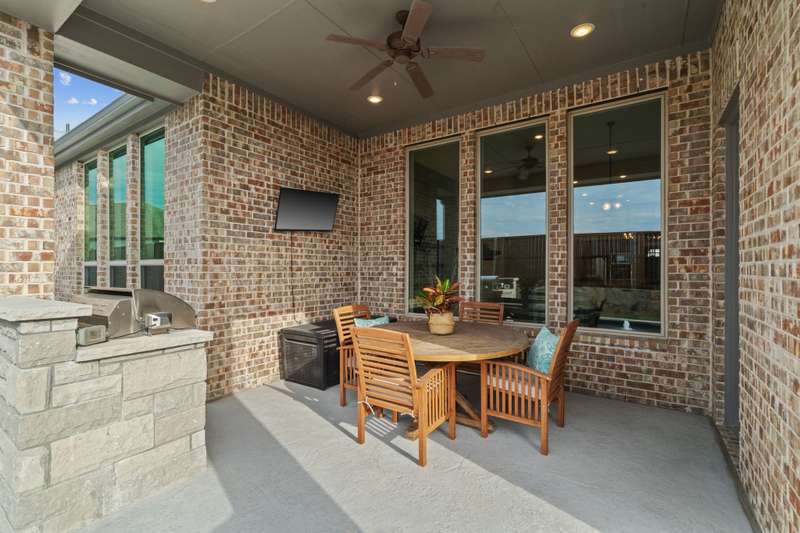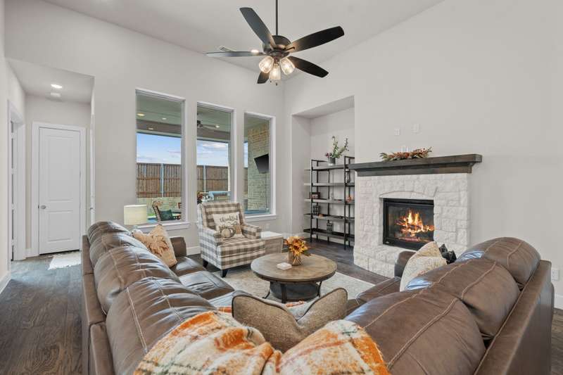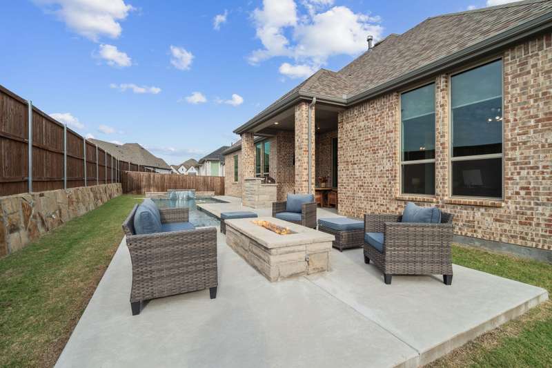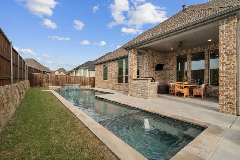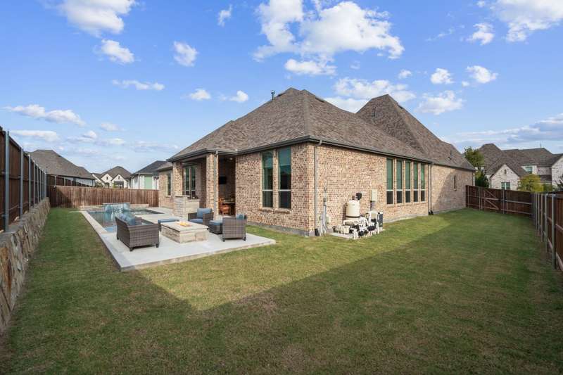 WELCOME HOME to Resort-Style Living in Award-Winning Sandbrock Ranch! This single-story Highland Homes 283 Plan masterpiece blends luxury, comfort, and thoughtful upgrades. Featuring 4 bedrooms, 3 full baths, and a rare 3-car side-by-side garage, its designed for both style and function. Inside, youll find designer finishes at every turn: 8-ft doors, expansive wood flooring, quartz countertops, a raised stone-hearth fireplace, and remote-controlled shades in the primary suite and living area. A wall of windows showcases your private backyard paradise. Step outside to your Texas-sized covered patio with built-in BBQ, an adjoining fire pit, and a sparkling pool + spa with waterfall, fountain, and sun shelfperfect for relaxing or entertaining. The gourmet kitchen is a chefs dream with stainless steel appliances, 5-burner gas cooktop, double ovens, oversized island, built-in microwave, butlers-style cabinet peninsula, walk-in pantry, plus under-over-cabinet lighting. Unwind in the Owners Retreat, featuring a soaking tub, separate shower, dual vanities, and a spacious walk-in closet. For movie nights, the home theater comes fully equipped with a projector and massive screen. Sandbrock Ranch residents enjoy top-tier amenities: the Carriage House Amenity Center with fitness facility, resort pool & splash pad, playgrounds, Scouts Corner Dog Park, and the whimsical Treehouse Adventure Park. A private K12 school is nearby for ultimate convenience. Luxury. Comfort. Recreation. This home has it all. Check out our REEL for a closer look!