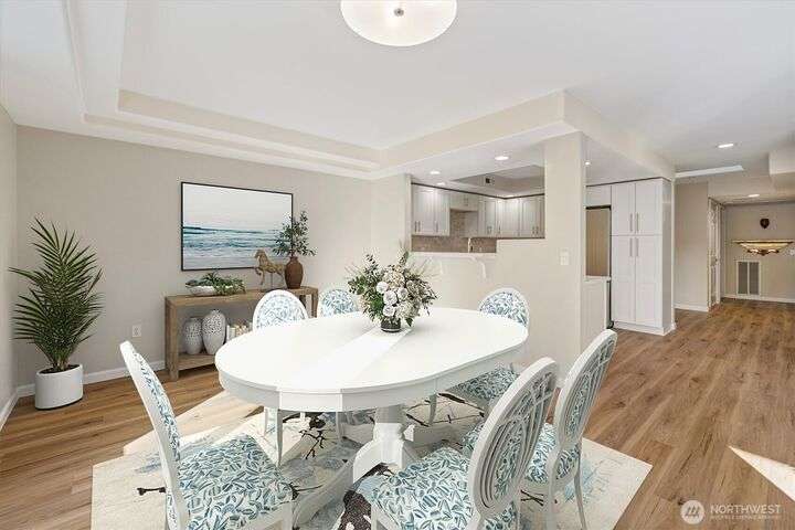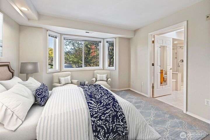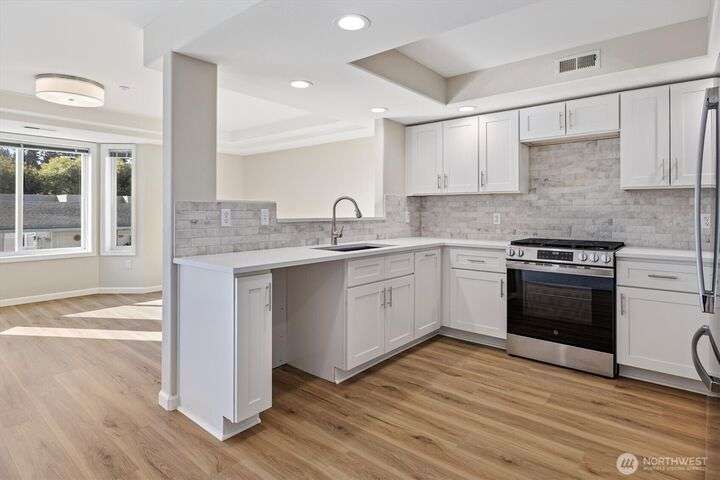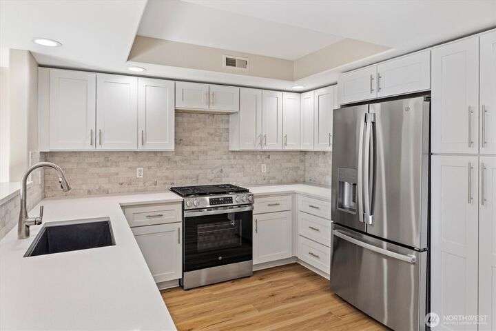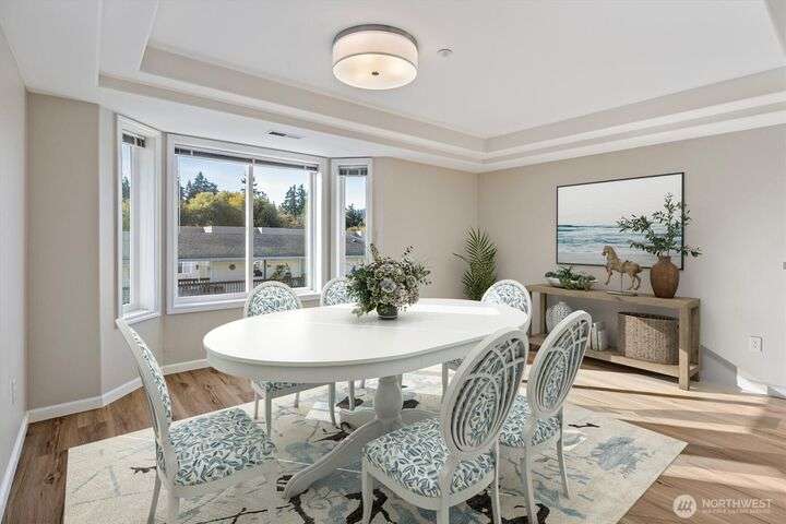 Stella’s Landing! Beautiful top-floor end-unit condo w/balcony located in the heart of downtown Edmonds. Enjoy lrg windows, natural lighting from the southern exposure w/mtns, water and marsh views– great for bird watching! Fully remodeled kit: new cabinets, quartz countrtp, SS appl. and luxury flooring. The open floor pln connects the living rm(w/gas frplc), dining rms and kitchen. Spacious primary-suite w/walk-in closet, 5-pc bth w/jetted tub. New elevators, social/community rm w/kitchen, exercise rm sauna and BBQ area. Secured garage w/2 dedicated parking spaces, guest prkg, extra storage rm & easy access to park, beaches, ferry, galleries, bistros & shopping. Well managed HOA. You’ll love the vibrant energy of downtown Edmonds!