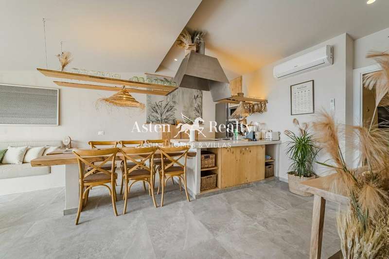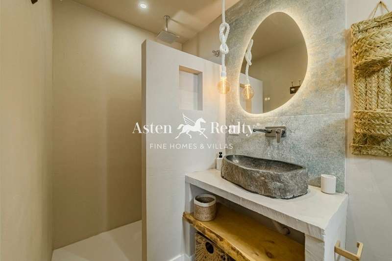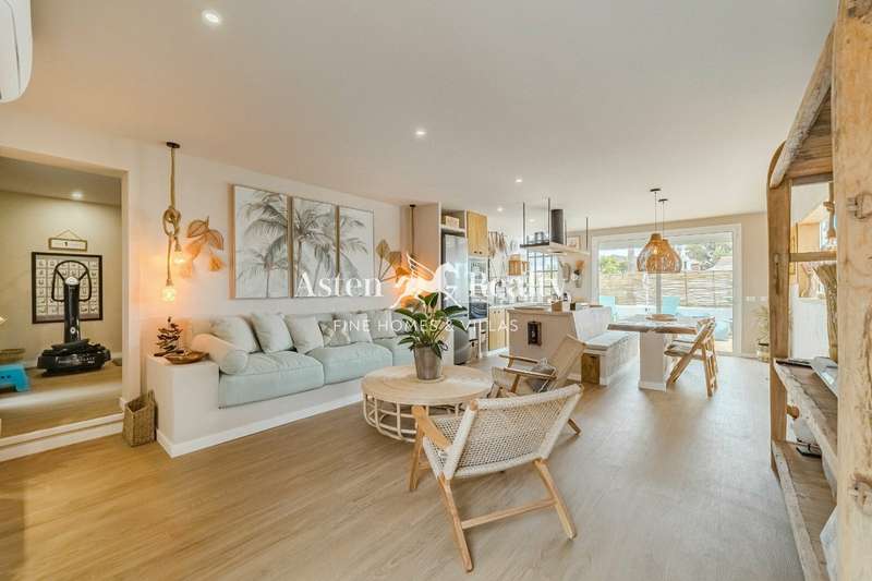 The first home, with 95 m² built, offers a spacious and bright living room with an open-plan kitchen, two double bedrooms with en-suite bathrooms, and an elegant main terrace with an outdoor dining area under a pergola. The private garden includes a heated jacuzzi, solarium, and outdoor furniture, inviting relaxation and enjoyment in a privileged setting.