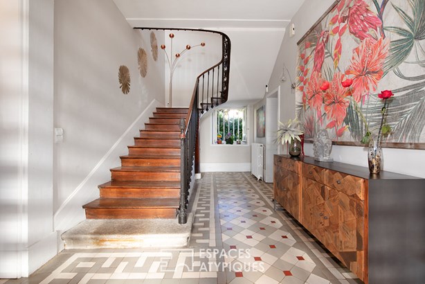 The entrance hall leads to a vast living room where large openings bathe the space in natural light. The staircase, a true work of art in marble and wrought iron, represents the backbone of this beautiful house. The noble materials and refined finishes highlight the unique architecture of the place. Upstairs, the kitchen, both modern and welcoming, fits perfectly into this resolutely warm ensemble.