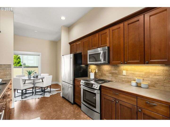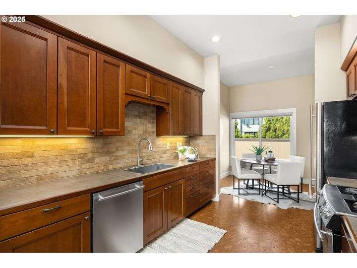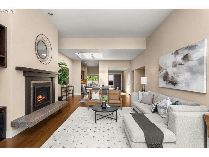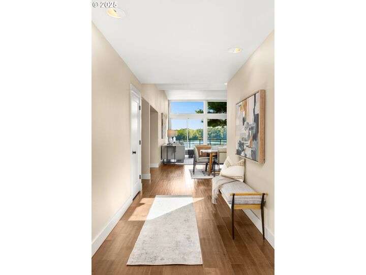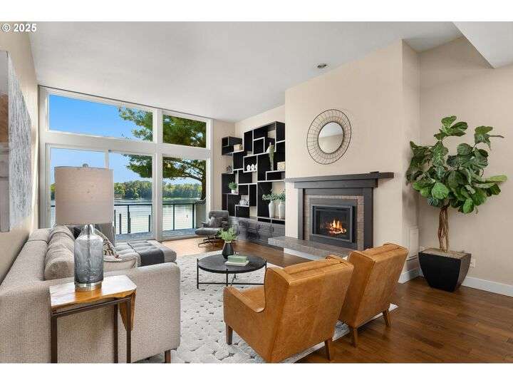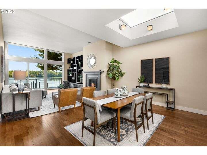 An incredible opportunity to live on the water! This luxurious single-level condo in Portland’s John’s Landing showcases sweeping views of the Willamette River, city skyline, and surrounding mountains. Floor-to-ceiling windows, soaring ceilings, skylights, and high-end finishes create a light-filled space that blends elegance with comfort. Inside, the living room centers around a cozy gas fireplace with doors opening directly to the private, east-facing deck—perfect for morning coffee or evening unwinding. The flowing layout connects the living room to the dining area and then to the kitchen, complete with a charming breakfast nook. With two bedrooms and two bathrooms, including a primary suite featuring panoramic river views and sliding doors to the deck, every corner of this home is designed for relaxation and style. Beyond your walls, the lifestyle is unmatched. Wander along nearby riverfront trails by foot or bike, explore the local shops and farmer’s market, or enjoy the convenience of being just minutes from downtown Portland. With two parking garages and generous storage for all your Pacific Northwest gear, this condo offers the perfect blend of luxury, convenience, and adventure.