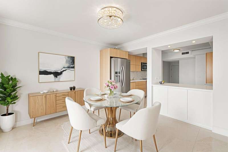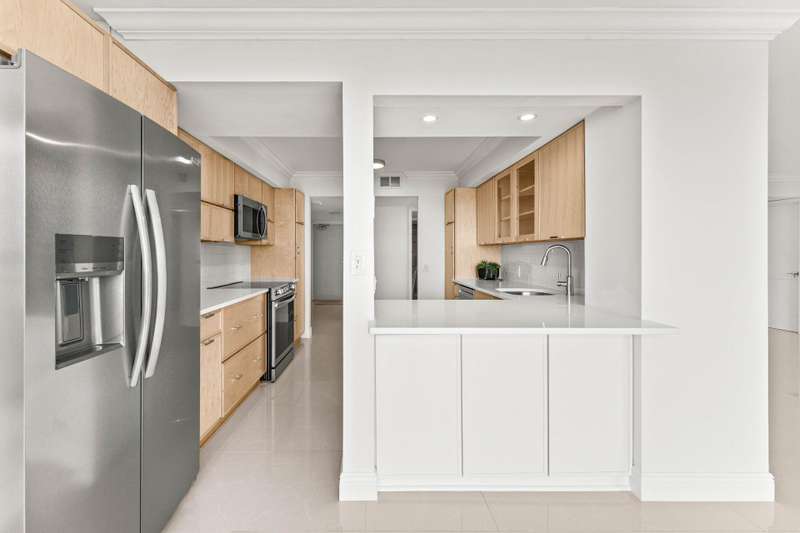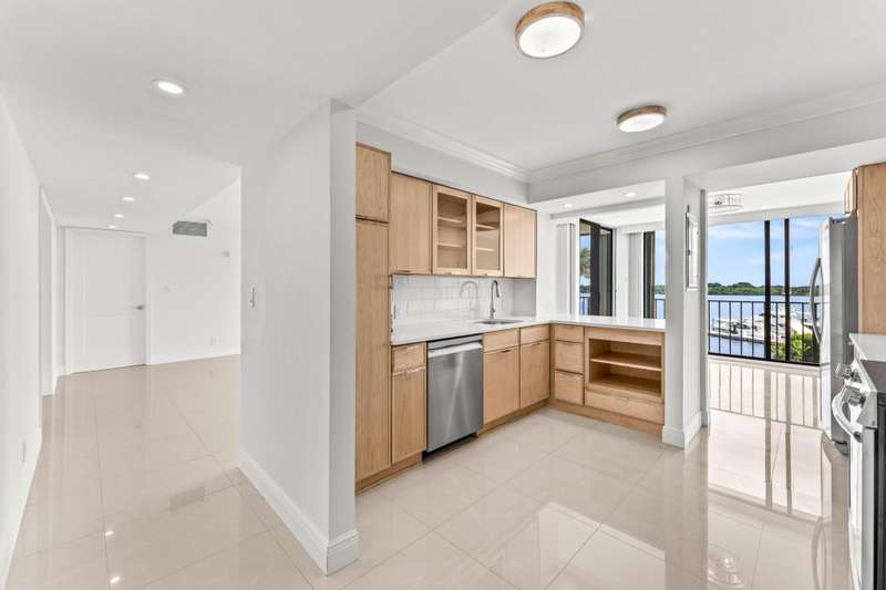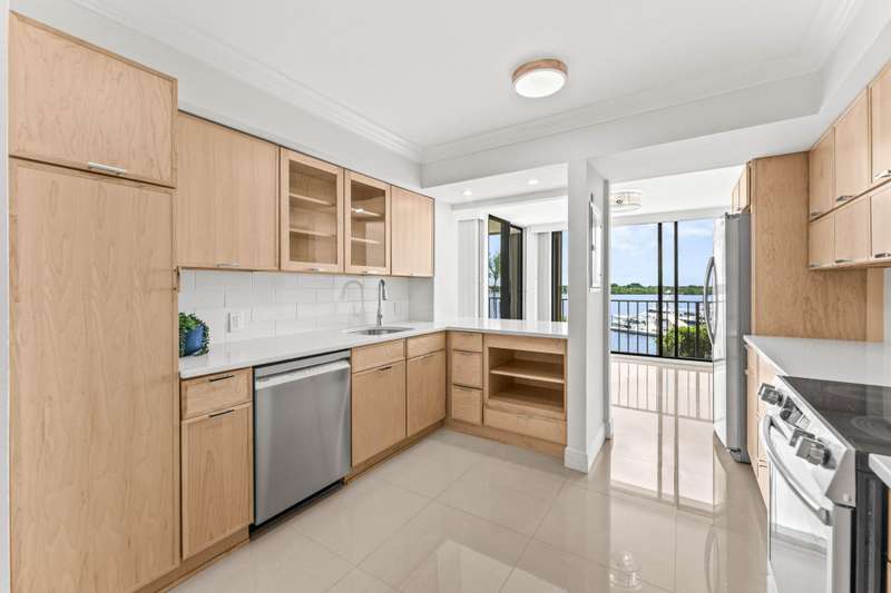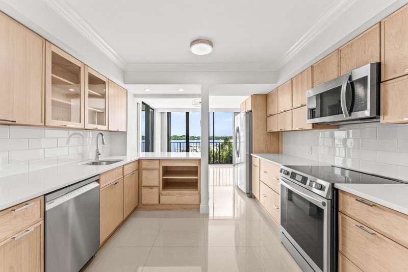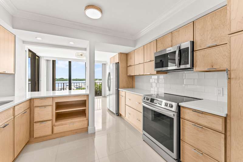 Dont miss this exciting all-newly remodeled GEM at Old Port Cove, (Quay South), with its 48 linear ft of waterfront for amazing sunrises, expansive daytime views and spectacular sunsets! Its tall ceilings, crown moulding, gleaming tiled floors and special lighting throughout its open flow of rooms are only waiting for your choices of furnishings to call it home. Designed and renovated with details beyond the norm, all of its former interior wiring has been replaced, all new-to-code, along with all new plumbing. Included is a state-of-the art Hydroviv water filtration system in both kitchen and bathrooms. The condo has all new solid-core custom-made interior doors by Jenn-Weld. The kitchen boasts custom grade contemporary natural maple cabinets and two pantries for additiona