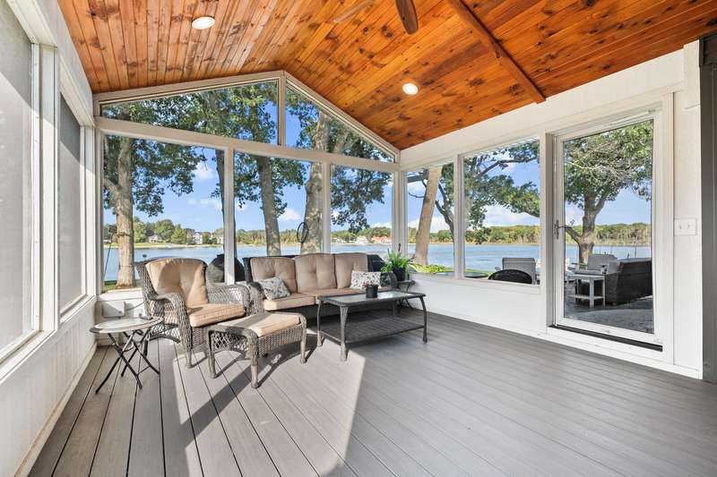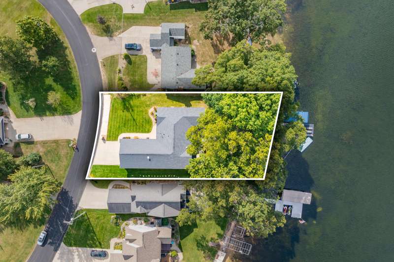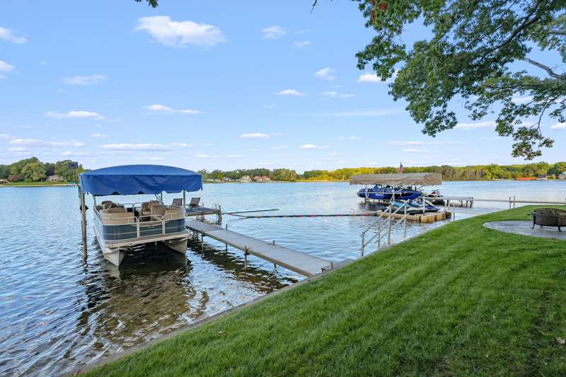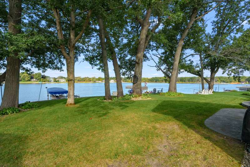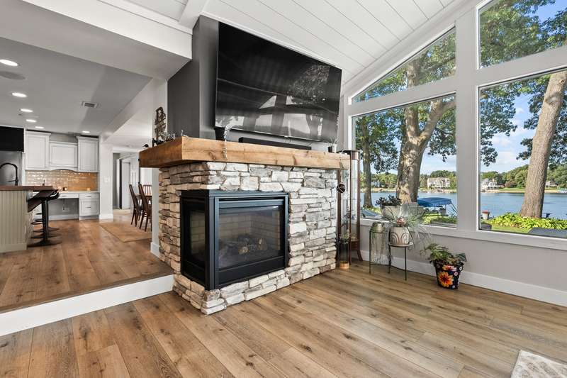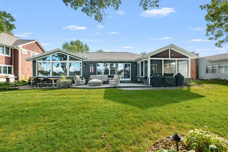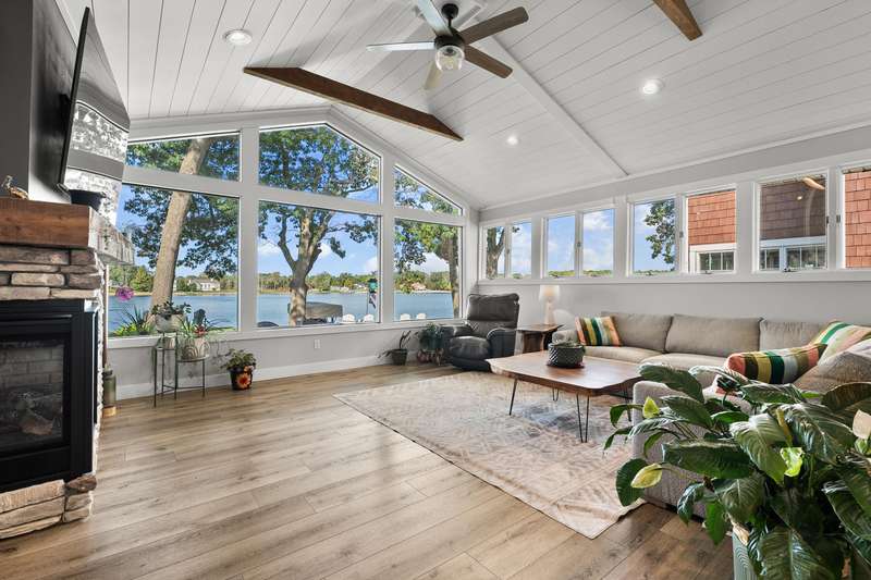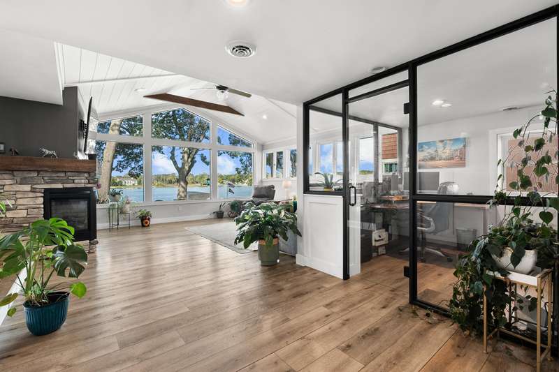 Experience elevated waterfront living in this exceptional Eagle Lake home! Perfectly positioned to capture the most breathtaking sunsets, with 80 feet of prime lake frontage and impeccably landscaped surroundings, this property offers a rare combination of privacy, beauty, and modern comfort. Inside, the home showcases stylish updates throughout, designed for effortless main-floor living. The open-concept great room centers around a refined fireplace and a wall of picture windows that frame endless water views. A glass-walled office brings in natural light and architectural interest, while two serene bedrooms provide restful escapes. (the owner is a builder and can convert the office back into a 3rd bedroom if desired) Step into the 3-seasons room, an extension of the home with the surround sound system throughout, to enjoy the generous indoor/outdoor living spaces. Built into the luxury patio is a gas-log firepit, and beautiful landscape lighting. The second-tier patio offers more lounge spaces before the newly added $80k seawall and tranquil shoreline. A large garage and extensive storage complete this luxury lakeside haven where every day feels like a getaway on Eagle Lake! Ask for details about the approved second story addition if interested.