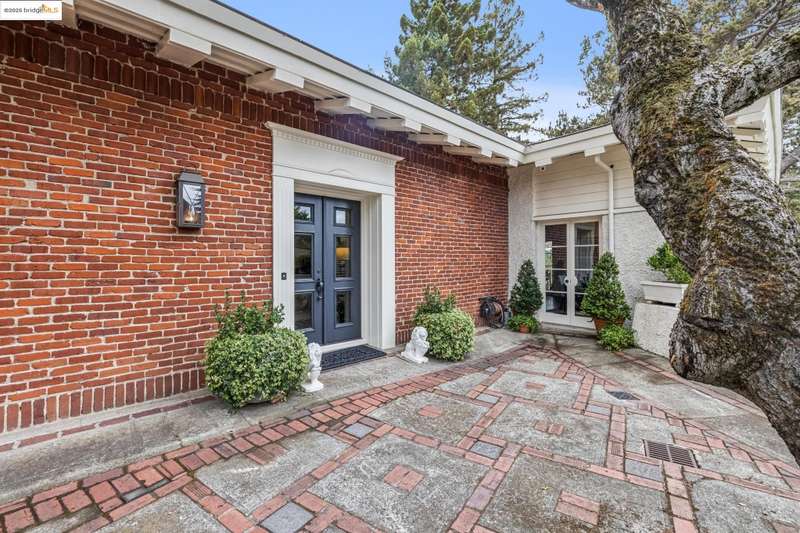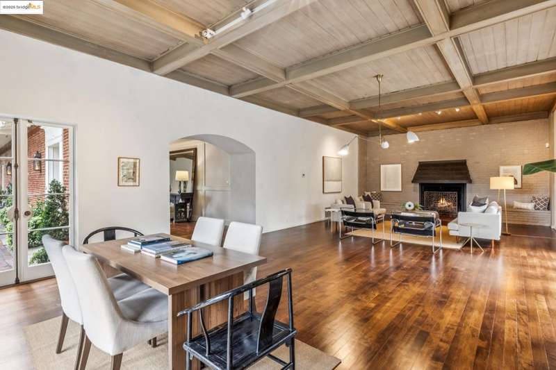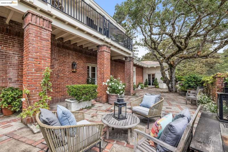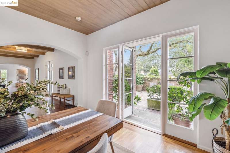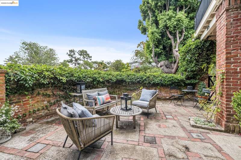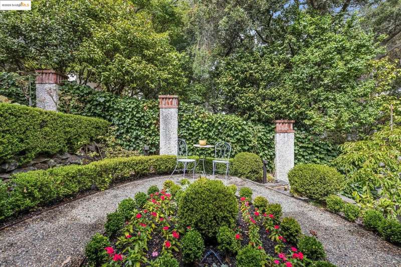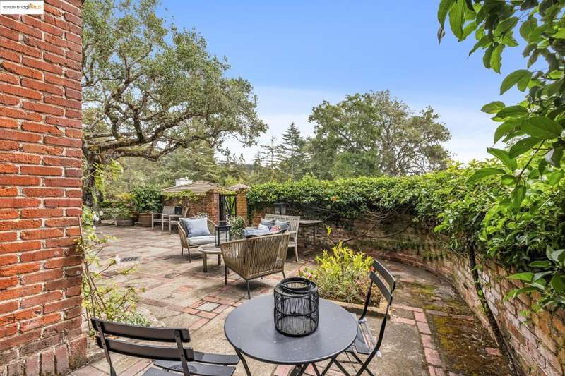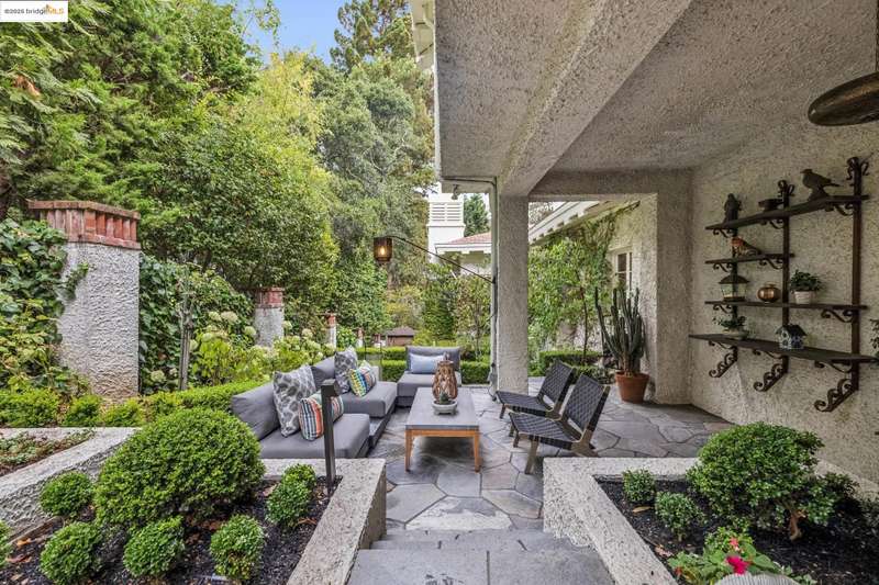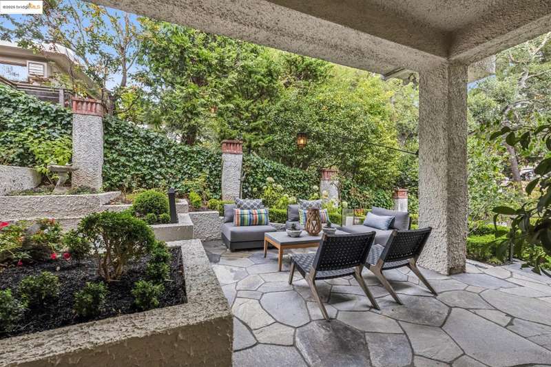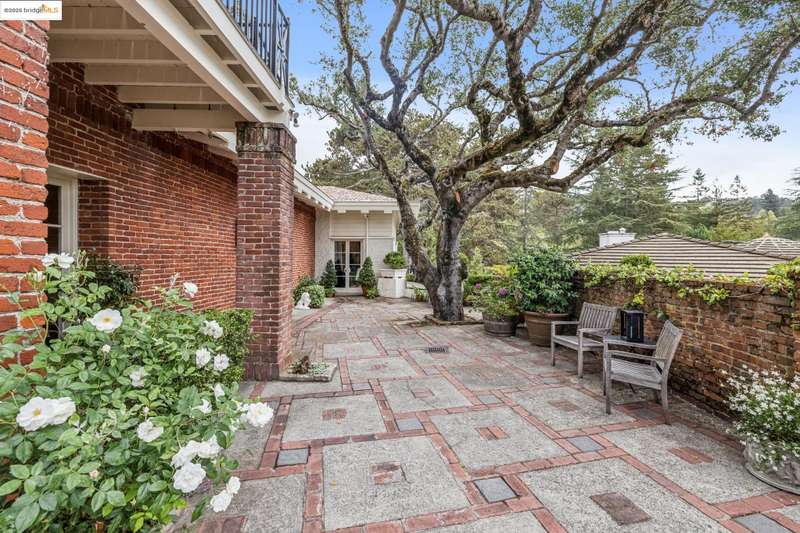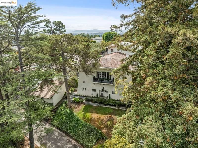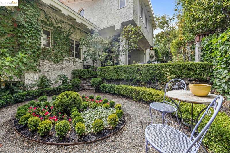 Extraordinary in so many ways...305 is part of the original Taylor Estate, which occupied this entire hillside. What you have is an amazing location at the top of the cul-de-sac, ample parking for guests in a shared Motorcourt, south facing balconies and a large courtyard, incredible spaces for entertaining, north terraced garden designed by Robert Trachtenberg. An incredible living room with 16’ ceilings, spacious dining room, super stylishly updated kitchen, pantry, full bath, laundry. 3 sets of French doors to courtyard! A bedroom and guest bath on main level are super convenient. Upstairs 3 bedrooms, 2 gorgeous baths, a private deck off primary. The lower level has high ceilings and a huge TV/media room/man cave has walls of bookcases, an electric fireplace, TV, ½ bath (upgrades made to original space done without permits). The back room offers endless possibilities as huge studio, workshop or perhaps a cool ADU. Super convenient to Claremont Hotel & Club, SF Express bus, Star Market, College Ave shops and Rockridge. Private. One-of-a-kind!