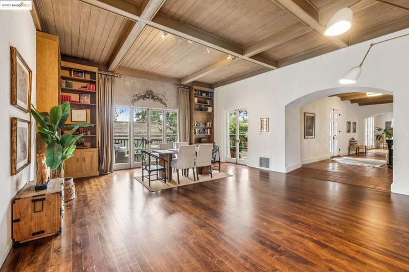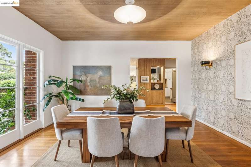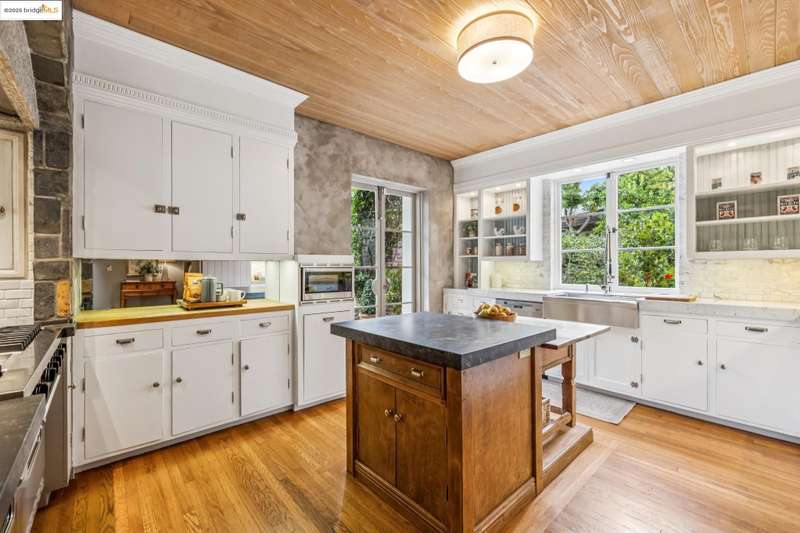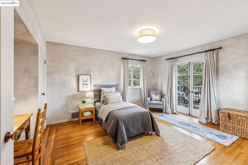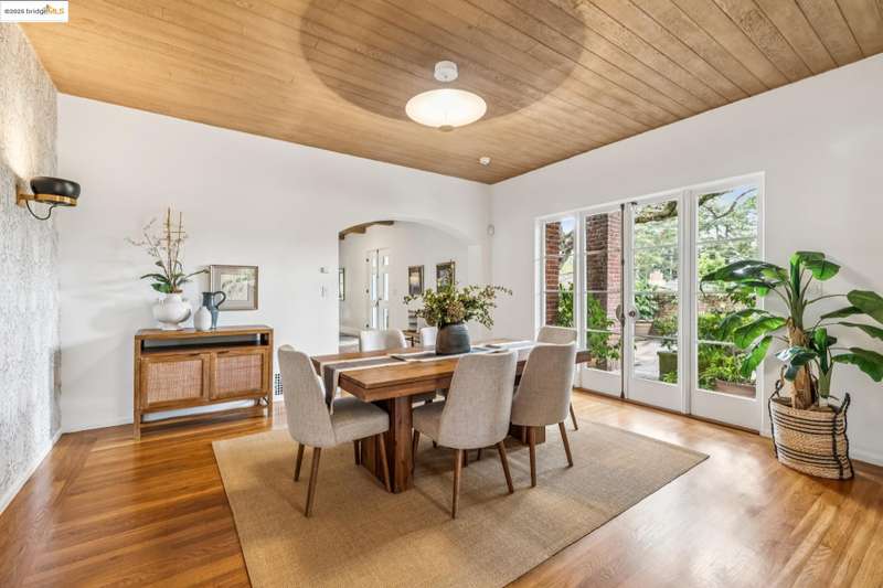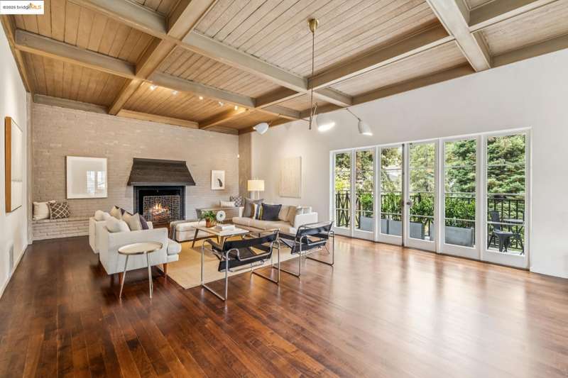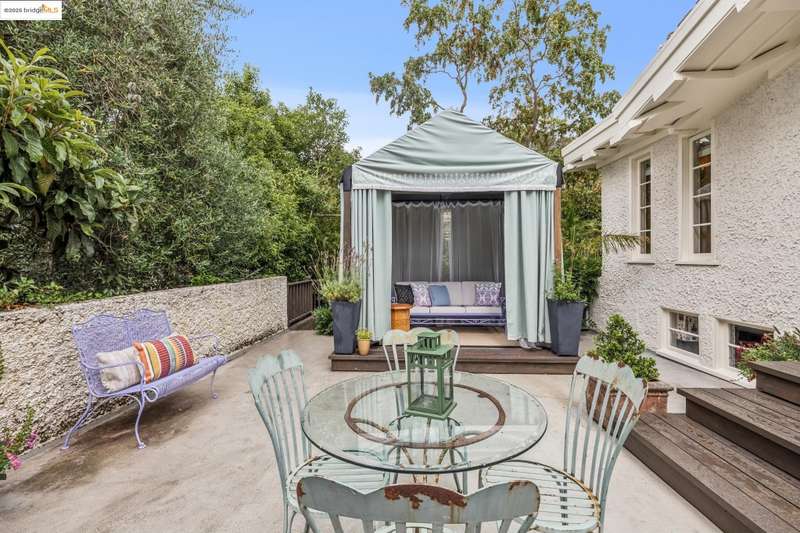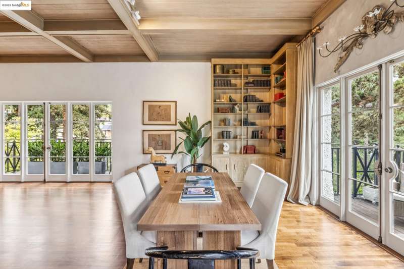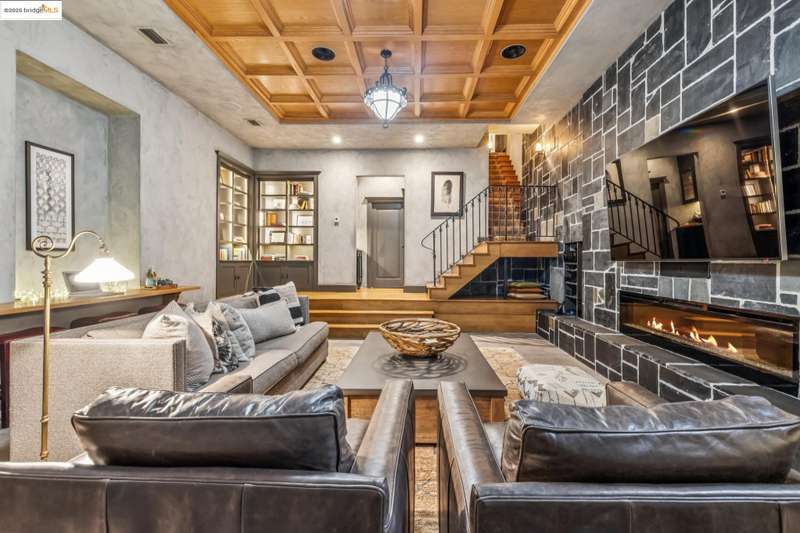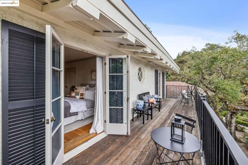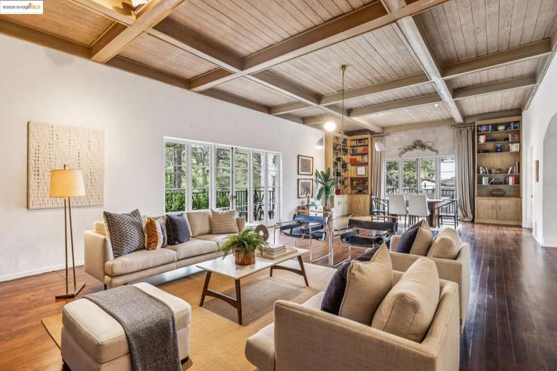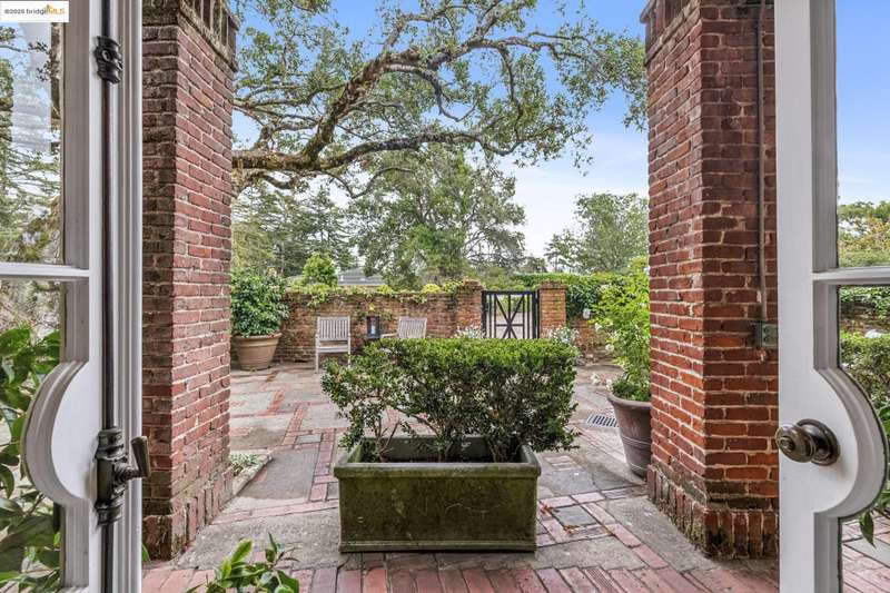 Extraordinary in so many ways...305 is part of the original Taylor Estate, which occupied this entire hillside. What you have is an amazing location at the top of the cul-de-sac, ample parking for guests in a shared Motorcourt, south facing balconies and a large courtyard, incredible spaces for entertaining, north terraced garden designed by Robert Trachtenberg. An incredible living room with 16’ ceilings, spacious dining room, super stylishly updated kitchen, pantry, full bath, laundry. 3 sets of French doors to courtyard! A bedroom and guest bath on main level are super convenient. Upstairs 3 bedrooms, 2 gorgeous baths, a private deck off primary. The lower level has high ceilings and a huge TV/media room/man cave has walls of bookcases, an electric fireplace, TV, ½ bath (upgrades made to original space done without permits). The back room offers endless possibilities as huge studio, workshop or perhaps a cool ADU. Super convenient to Claremont Hotel & Club, SF Express bus, Star Market, College Ave shops and Rockridge. Private. One-of-a-kind!