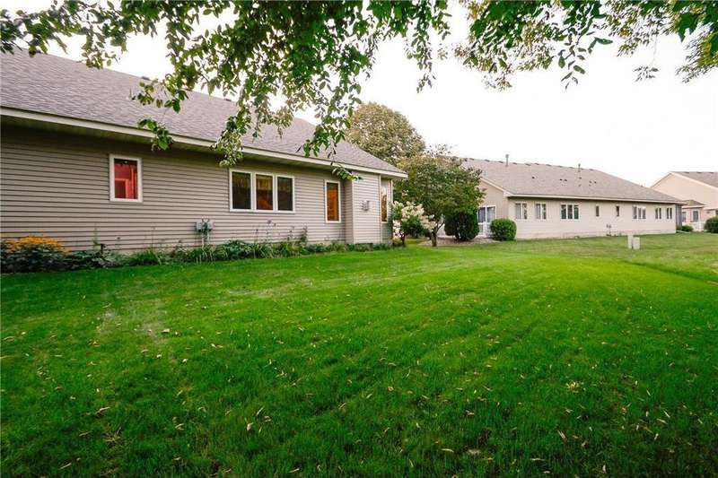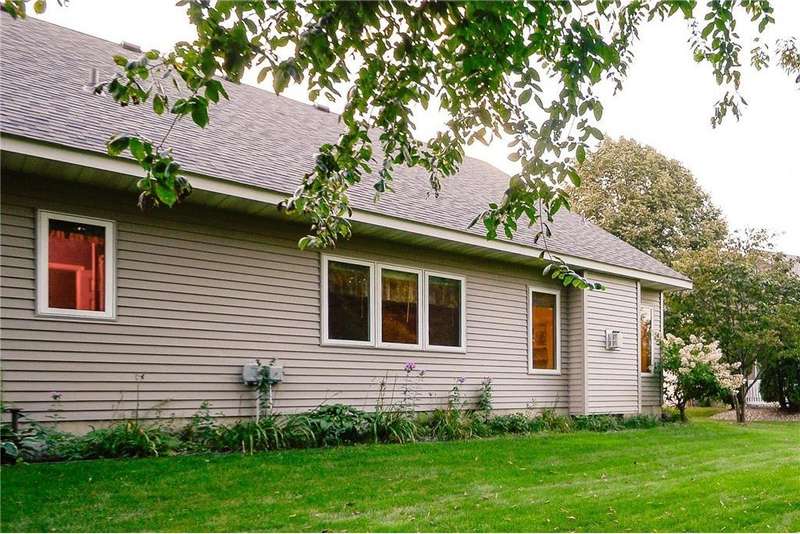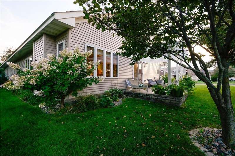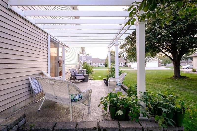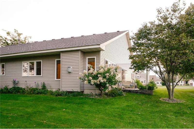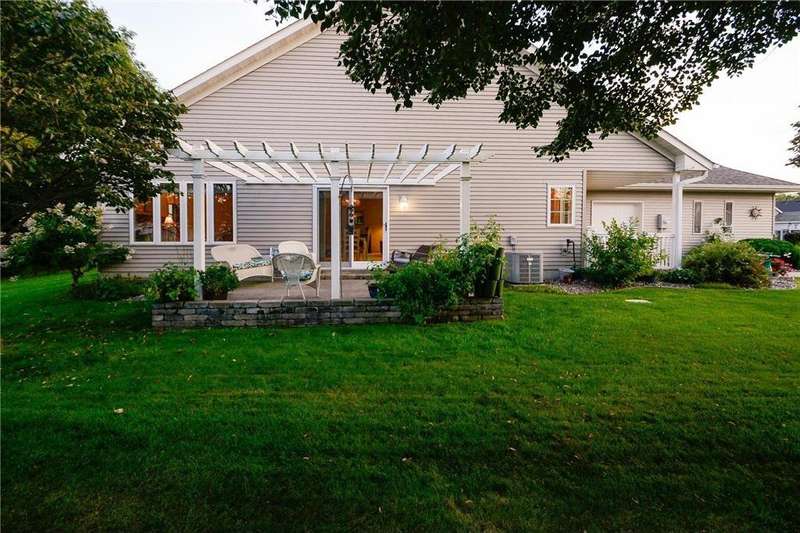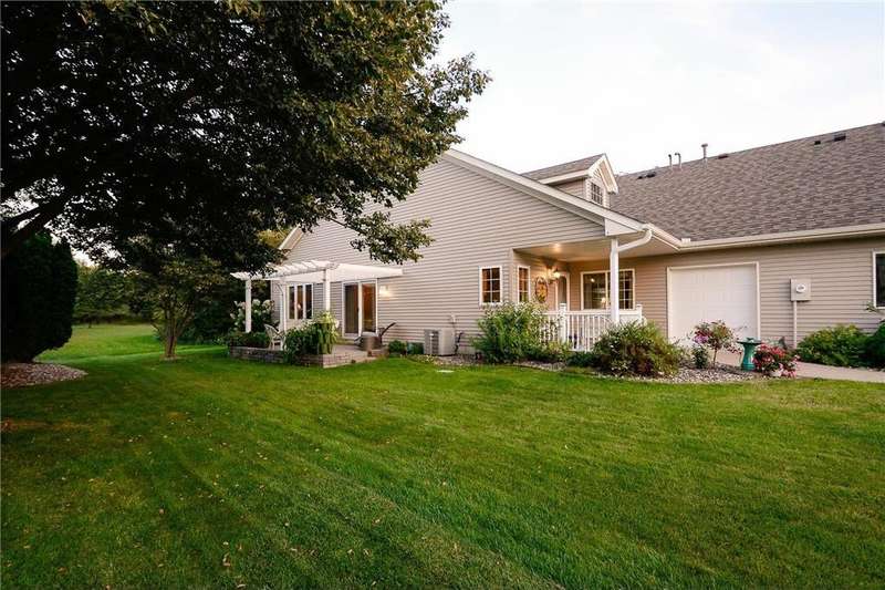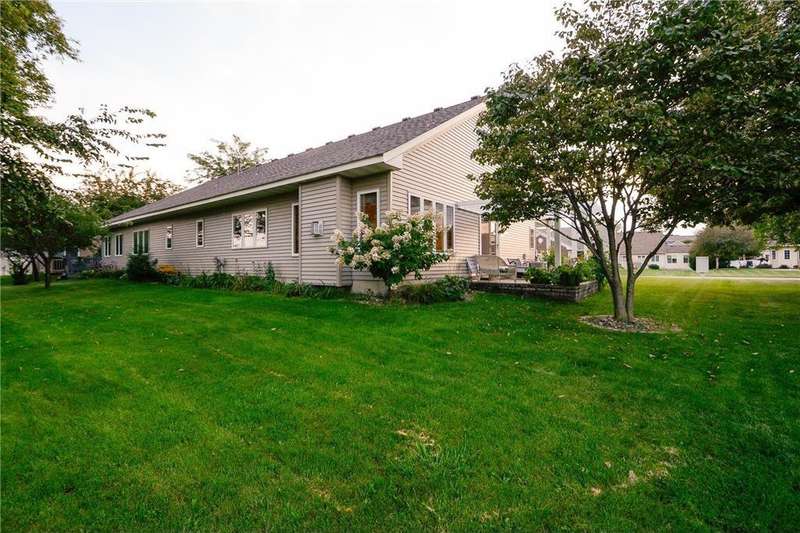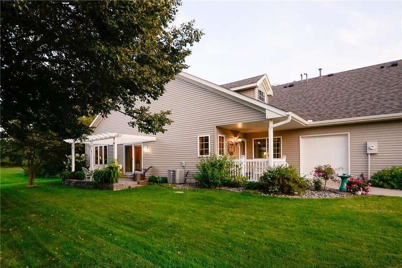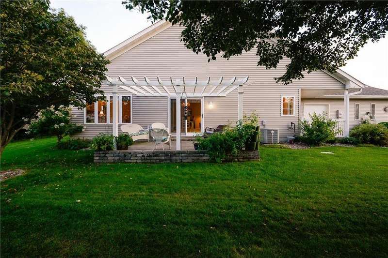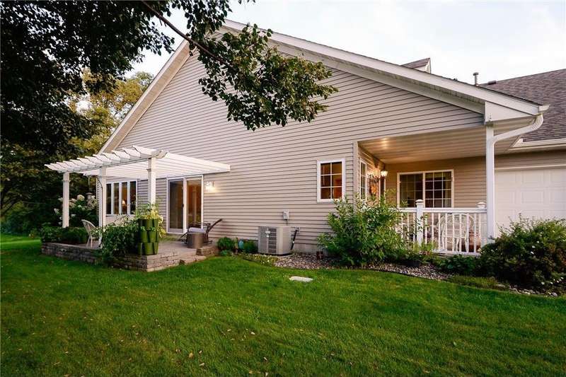 Welcome to this beautifully maintained one-level twin home in the desirable Clearwater Estates community! Offering 2 bedrooms, 2 bathrooms, and 1,502 sq ft, this home features an inviting open-concept layout with 9-foot ceilings and abundant natural light. The spacious kitchen is equipped with custom wood cabinetry, a center island, pantry, and newer slate appliances, including a GE refrigerator, microwave, and dishwasher. The sunroom with a cozy gas fireplace is the perfect place to relax, while the informal dining area opens to a private backyard oasis with an aggregate patio, pergola, lush perennials, mature trees, and no rear neighbors! The primary suite includes a full private bath and large walk-in closet, while additional features such as in-floor radiant heat, LVP flooring, 6-panel doors, and updated windows and doors add both comfort and style. The insulated and heated garage offers a workbench, water access, and a convenient golf cart door. Recent additional updates include a new roof and siding (2023) and water heater (2022). Clearwater Estates is a gated community with outstanding amenities, including a heated in-ground pool, clubhouse, scenic Mississippi River overlook walkway, and HOA-maintained grounds with internet included. Conveniently located near parks, restaurants, The Preserve Disc Golf Course, the Mississippi River and more, this property offers a quick close and comes with a one-year home warranty for peace of mind!