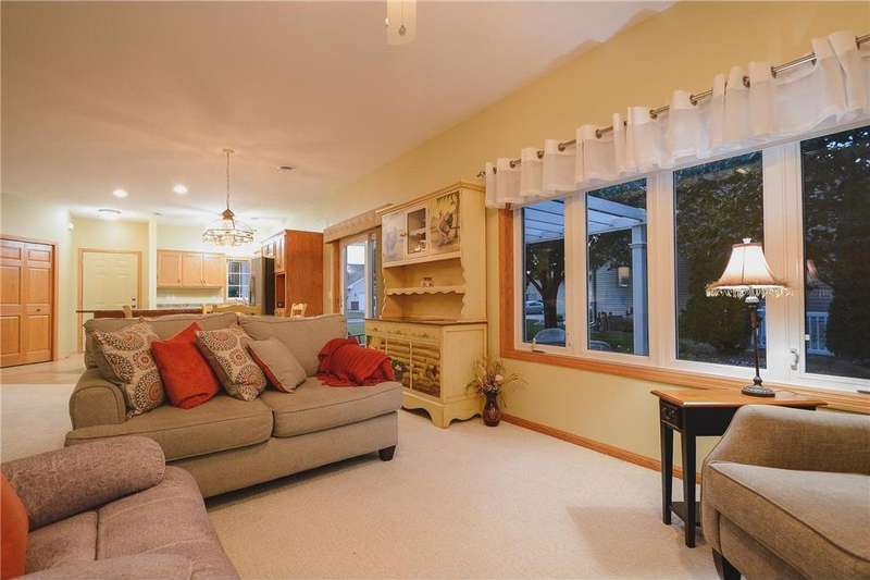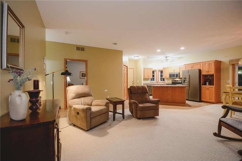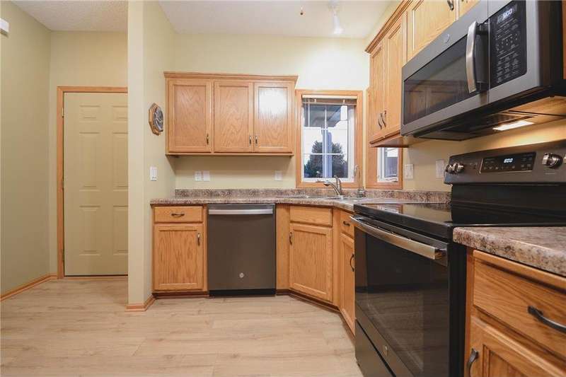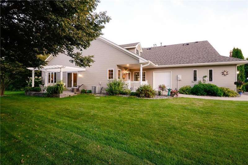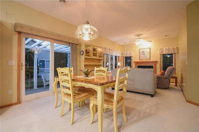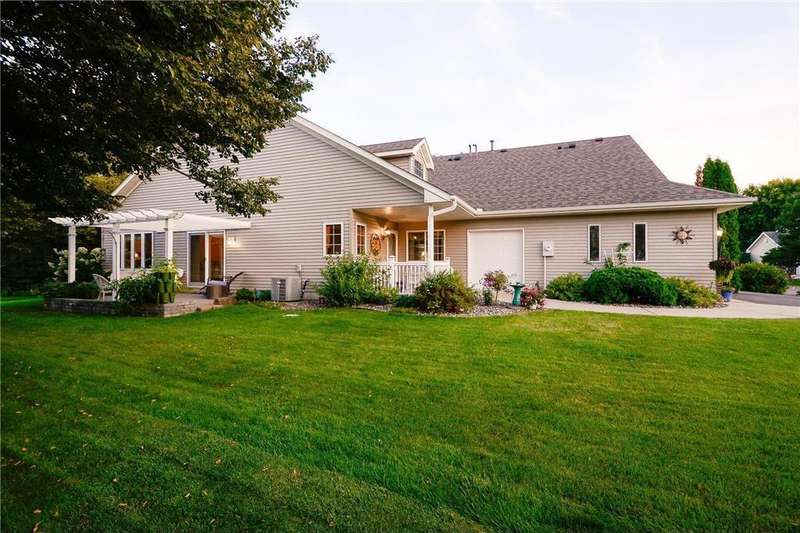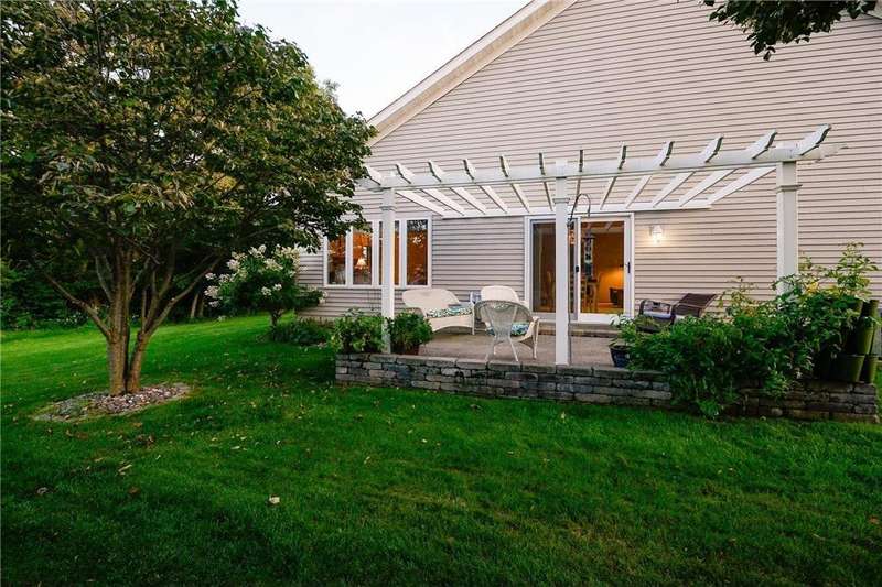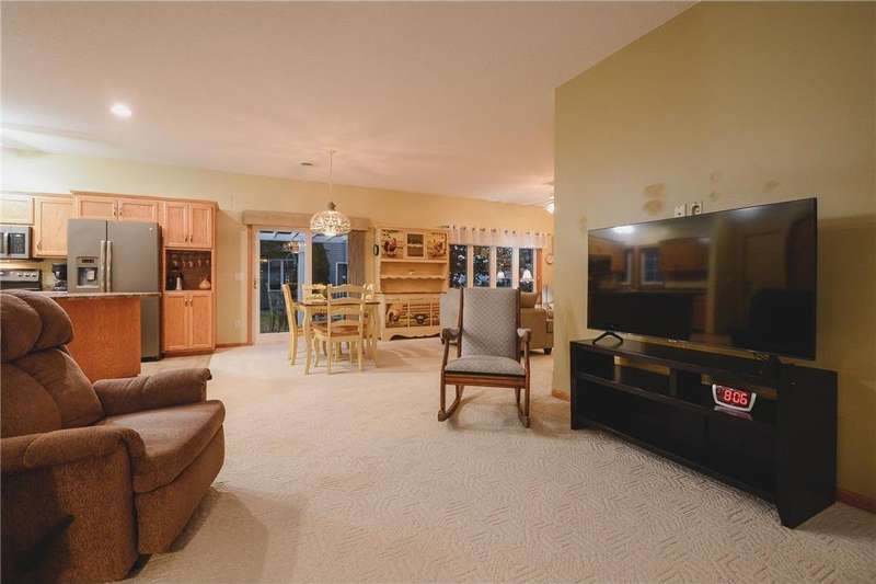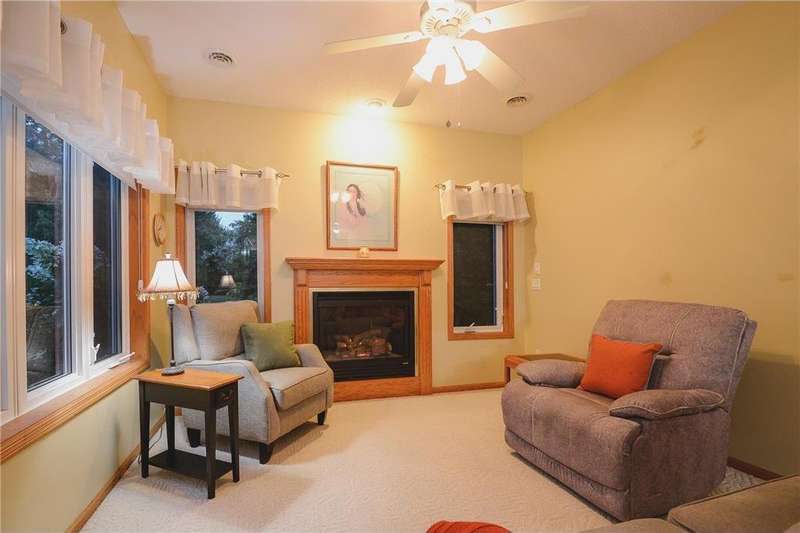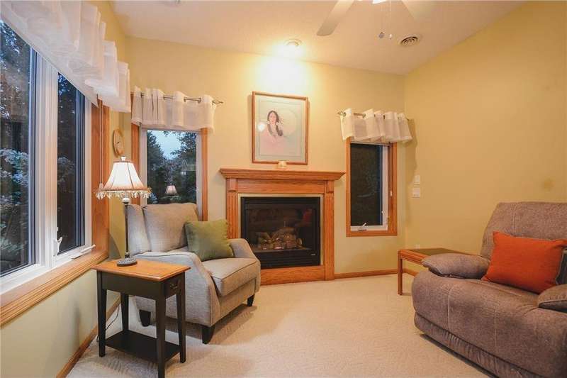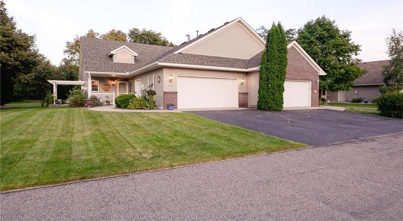 Welcome to this beautifully maintained one-level twin home in the desirable Clearwater Estates community! Offering 2 bedrooms, 2 bathrooms, and 1,502 sq ft, this home features an inviting open-concept layout with 9-foot ceilings and abundant natural light. The spacious kitchen is equipped with custom wood cabinetry, a center island, pantry, and newer slate appliances, including a GE refrigerator, microwave, and dishwasher. The sunroom with a cozy gas fireplace is the perfect place to relax, while the informal dining area opens to a private backyard oasis with an aggregate patio, pergola, lush perennials, mature trees, and no rear neighbors! The primary suite includes a full private bath and large walk-in closet, while additional features such as in-floor radiant heat, LVP flooring, 6-panel doors, and updated windows and doors add both comfort and style. The insulated and heated garage offers a workbench, water access, and a convenient golf cart door. Recent additional updates include a new roof and siding (2023) and water heater (2022). Clearwater Estates is a gated community with outstanding amenities, including a heated in-ground pool, clubhouse, scenic Mississippi River overlook walkway, and HOA-maintained grounds with internet included. Conveniently located near parks, restaurants, The Preserve Disc Golf Course, the Mississippi River and more, this property offers a quick close and comes with a one-year home warranty for peace of mind!