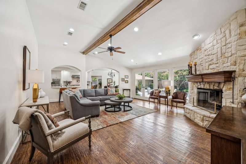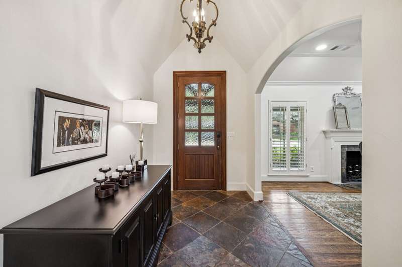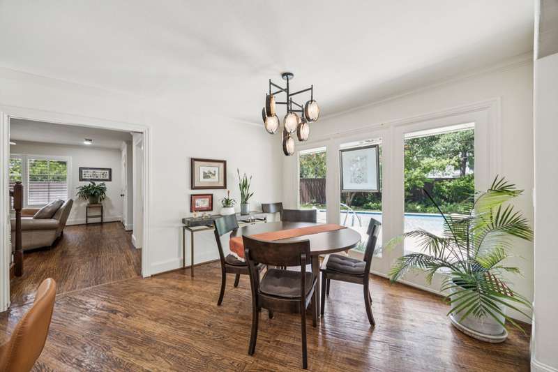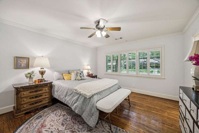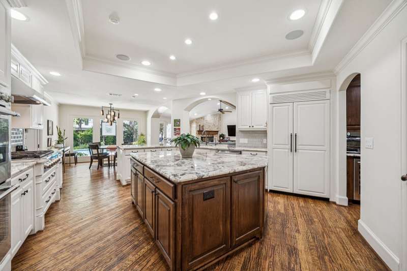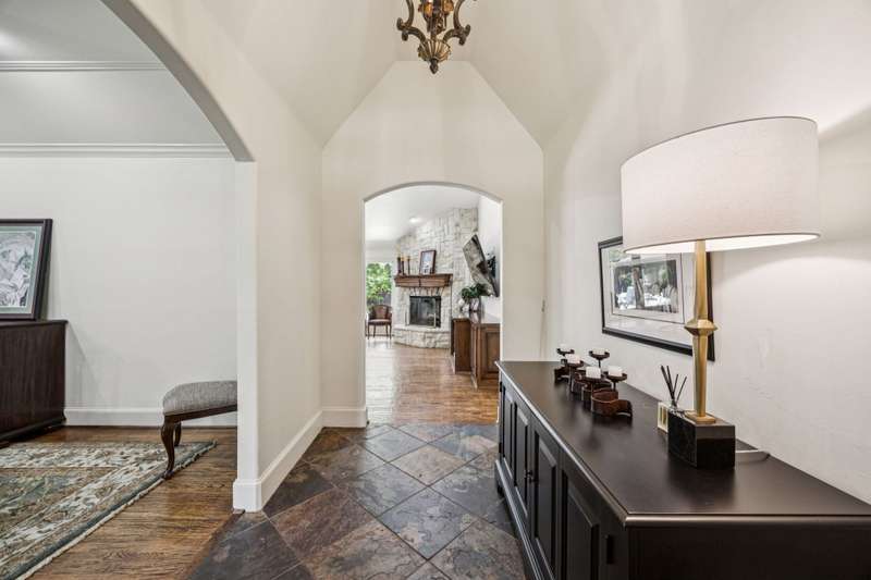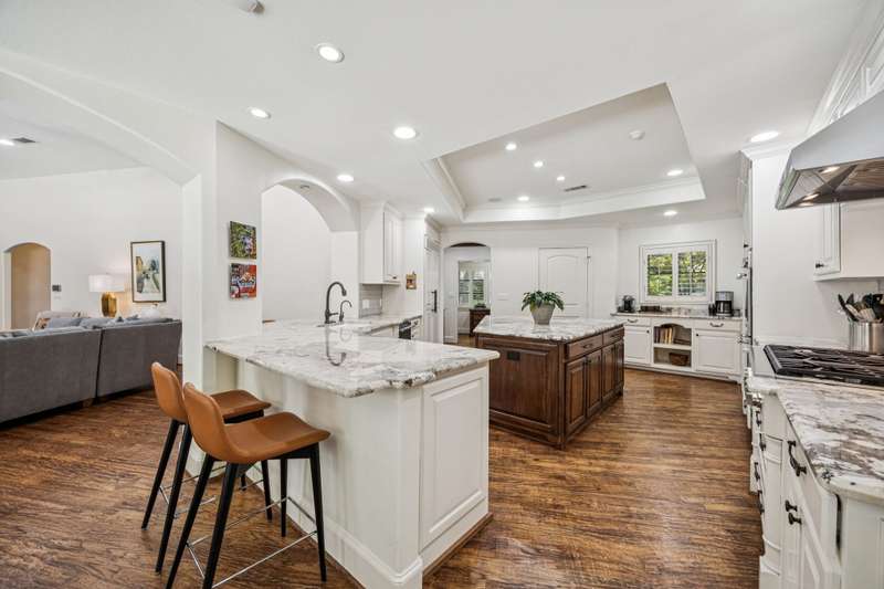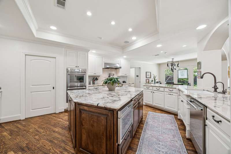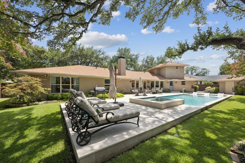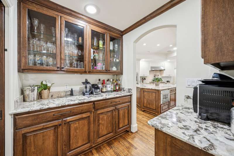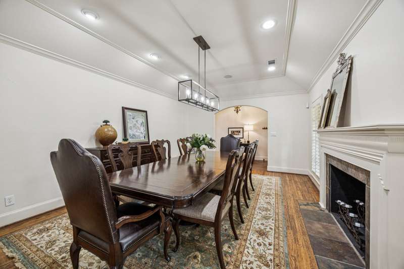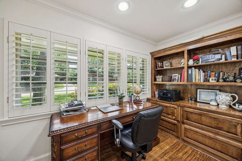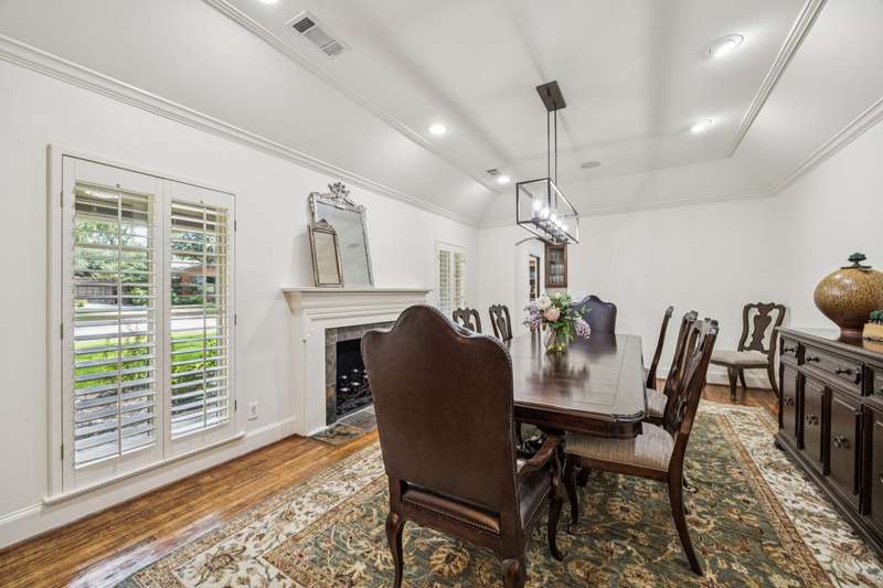 Meticulously maintained in desirable Eudora Estates on oversized lot with inviting front covered seating porch, grand FOYER, arched doorways and custom features throughout. Generous size FORMAL DINING at front of home comfortably accommodates a large dining table, decorative chandelier, recessed lighting, tray ceiling and appealing faux fireplace. Eat-in KITCHEN w BREAKFAST BAR, stainless appliances, granite counters, tile backsplash, 6-burner Thermador gas cooktop, vent, double ovens, dishwasher & microwave, built-in Jenn Aire refrigerator, center island w storage, walk-in pantry, Butler's pantry w custom cabinets and wine chiller. BREAKFAST w wall of windows to maximize natural light, overlooks sprawling backyard & pool. OFFICE at front of home with wall of windows and built-in bookshelves w storage drawers. FAMILY room at rear of home boasts decorative wood beam, oversized stone gas-starter fireplace, built-in entertainment cabinets, rear access doors and windows with motorized shades with views of pool and backyard. PRIMARY ensuite with abundance of natural light overlooks backyard features granite counters, separate vanities, linen closet, ceramic tile, walk-in shower w glass door and panels, soaking tub w large window above, and walk-in closet. Upstairs boasts 4th BEDROOM w private full BATH and add'l LIVING. LAUNDRY w utility sink, storage closets, and room for second refrigerator. MUD room w wall of custom built-ins. Inviting private backyard features expansive heated diving POOL and spa, wrought-iron fence, custom wood arbors, ornatmental trees, and custom stone fire pit perfect for entertaining. Notable features include sculpted hardwood floors, vaulted ceilings, wood shutters, motorized shades, built-in bookcases, recessed lighting, alarm system, sprinker system, roof replaced in 2023, Rinnai tankless water heater, exterior lighting, mature landscaping, gated driveway, and so much more.