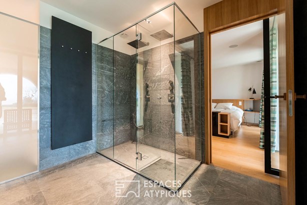 On the ground floor, a vast living area opens onto a double reception space and an open-plan kitchen, enhanced by sumptuous materials and top-of-the-line equipment. Large openings give direct access to the terraces, offering an ideal setting to contemplate the scenery.