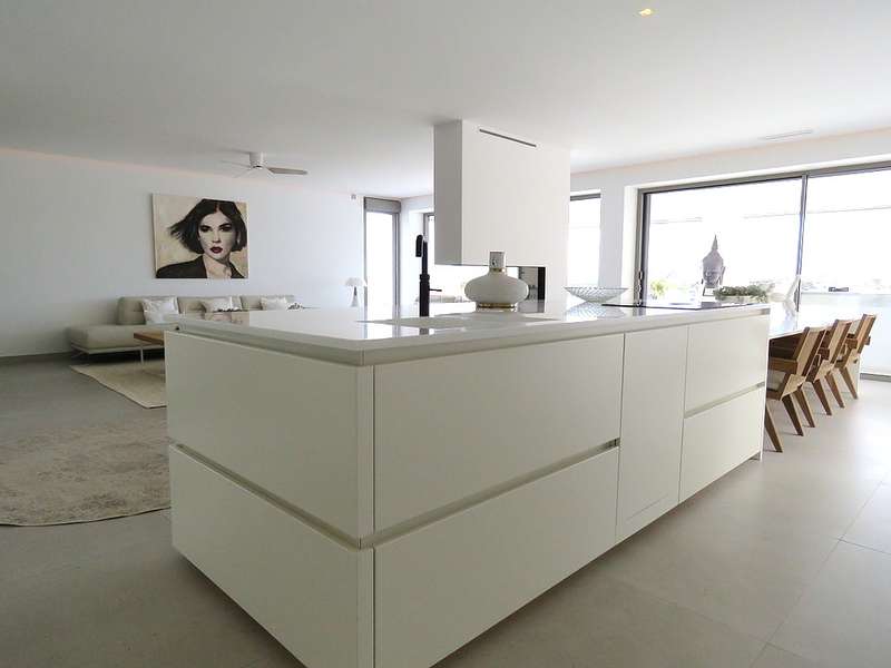 Inside the modern villa on the ground floor, you have a large fully equipped open-plan kitchen with an island feature and its own separate laundry/ storage room, a large study/ office room, a bathroom, a lift that can access all floors, and a spacious living area with large windows that overlook the private pool and allow in ample natural light.