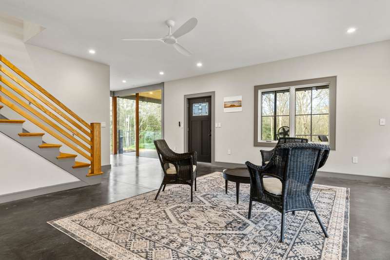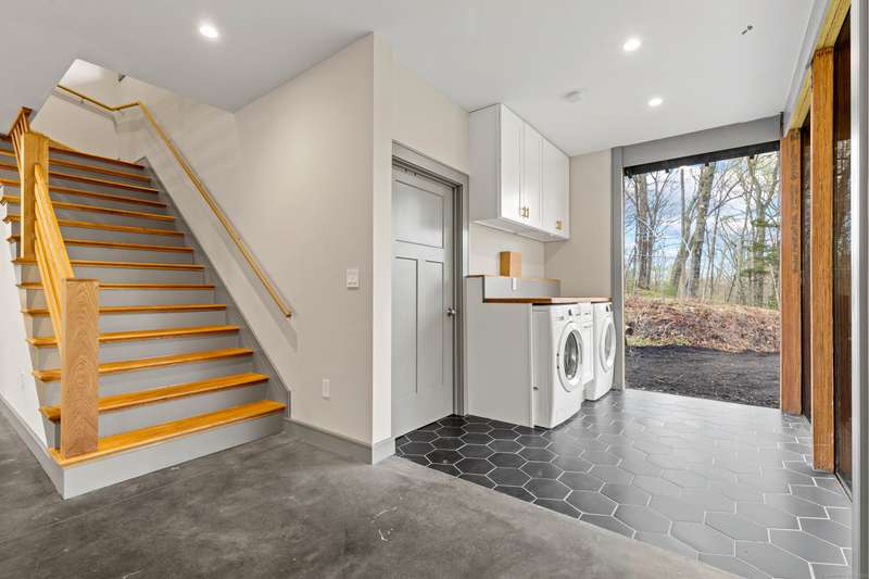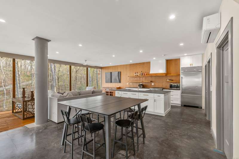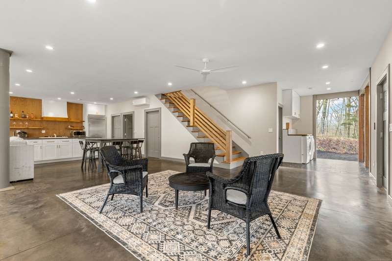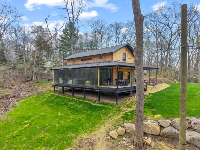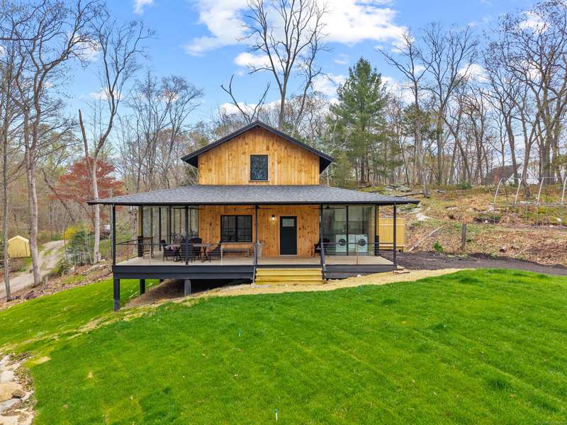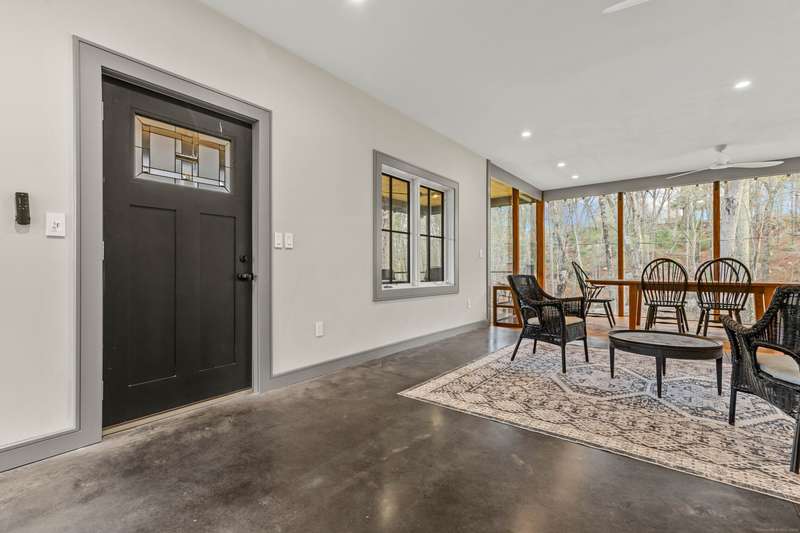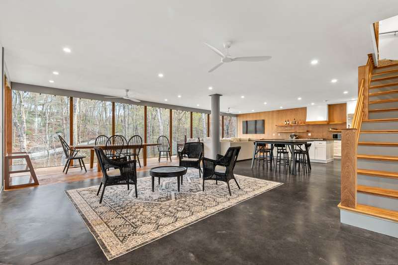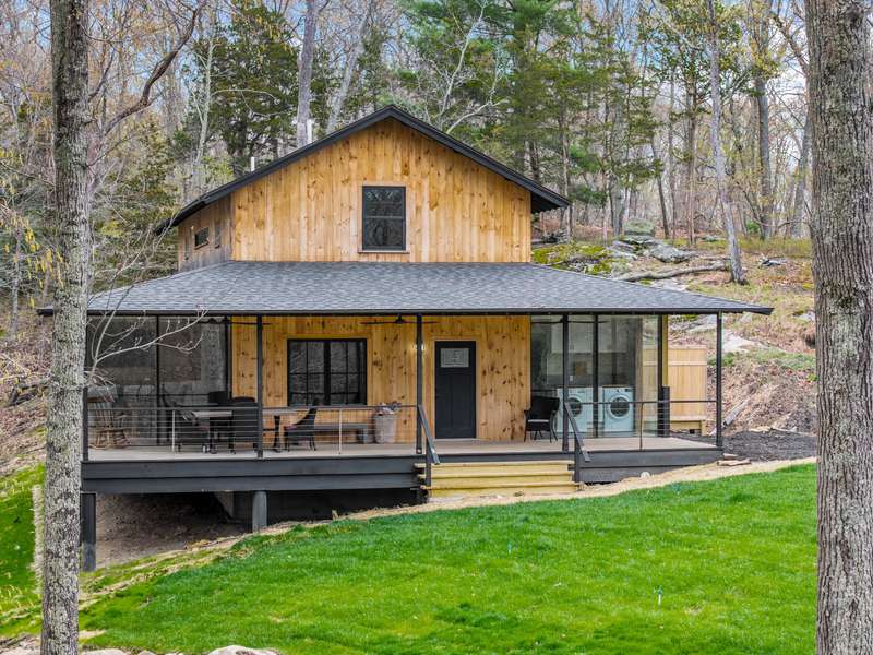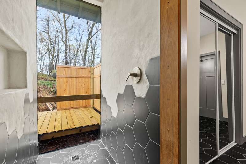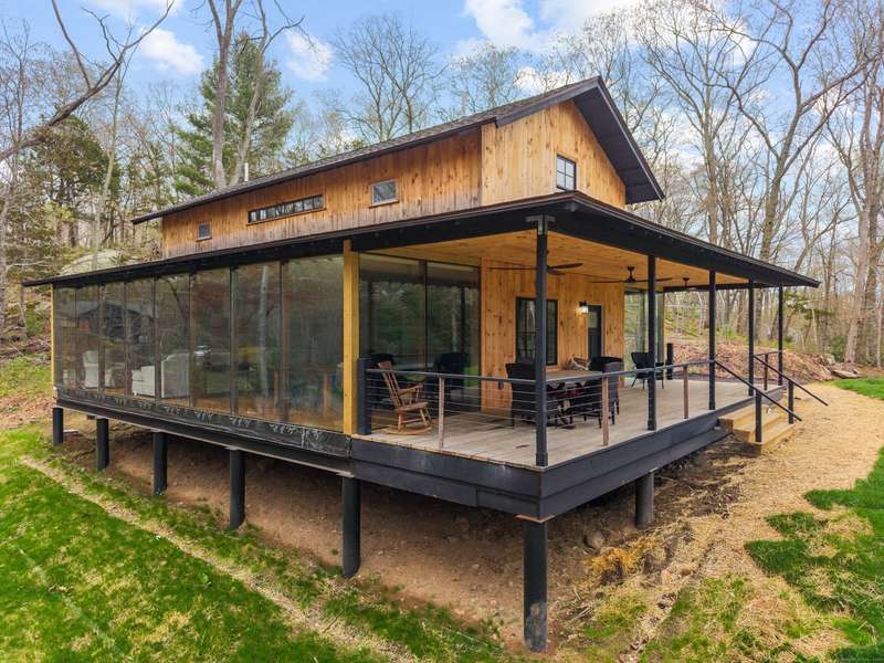 Set into the woods of Clinton, this 2,400 sq ft modern farmhouse is designed for the discerning, uninhibited buyer. With bold lines, glass walls, and a wide-open floor plan, it blurs the line between indoor and outdoor living. Inspired by Guilford's iconic Little Red Shack, the home celebrates transparency, minimalism, and architectural bravery. The main level features floor-to-ceiling glass, polished concrete floors, warm wood accents, and a sleek kitchen with floating shelves. The en suite primary bedroom is on the first floor and opens to the outdoors for a private retreat experience. Upstairs offers two more bedrooms, a stylish full bath, and a lofted second living area. Designer tile work, clean lines, and modern lighting complete the look. Just down the street are the Jesse Buell Woods, offering access to rugged hiking trails, perfect for adventurous buyers looking to connect with nature. This is not your average shoreline home-it's a livable work of art, nestled in the trees an