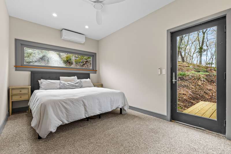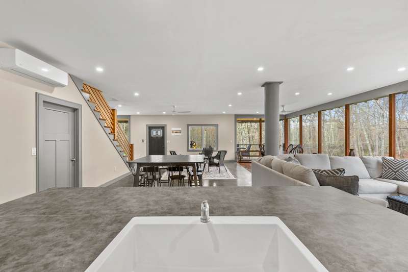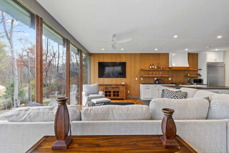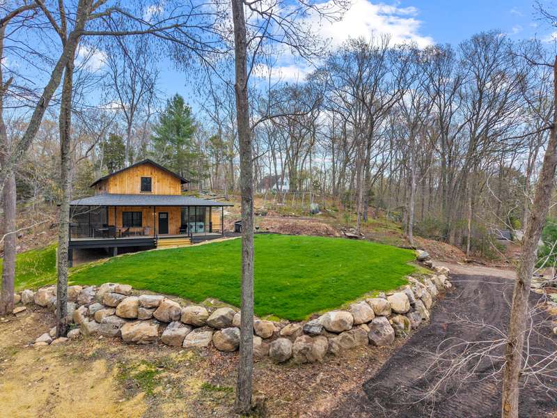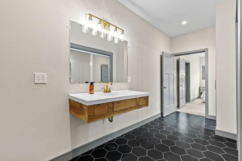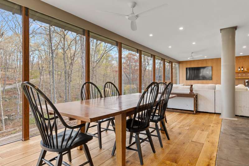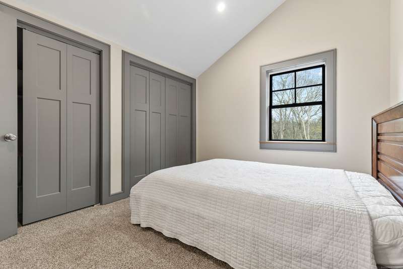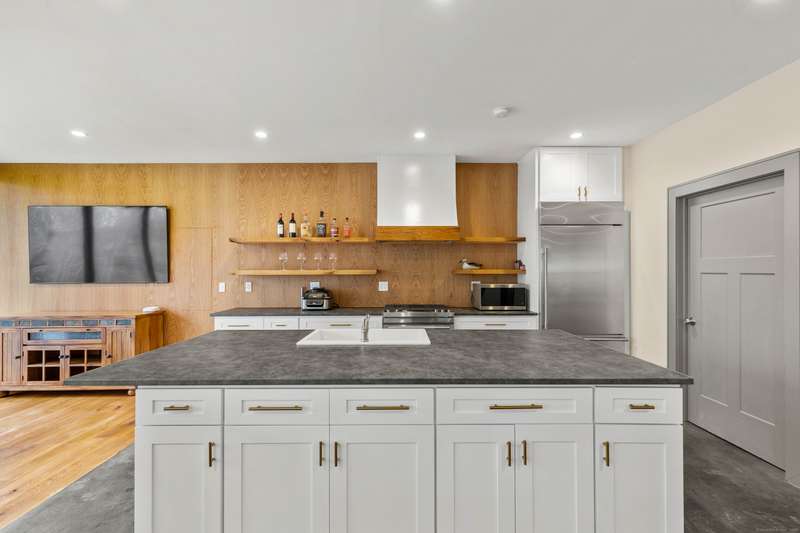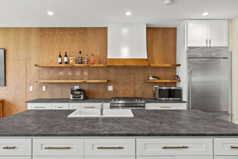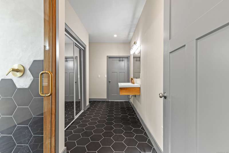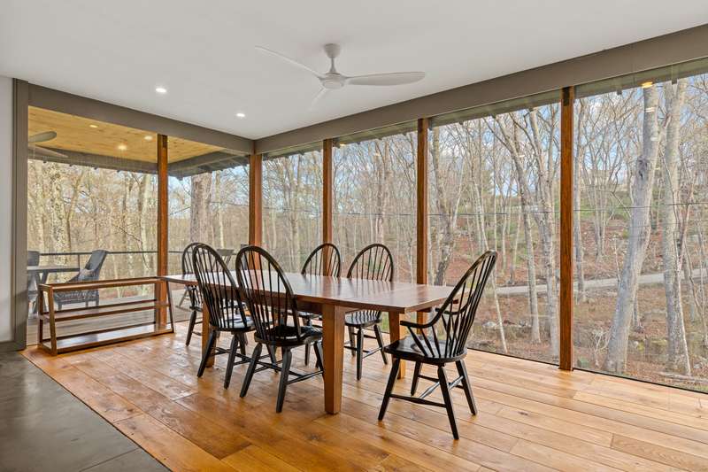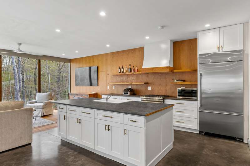 Set into the woods of Clinton, this 2,400 sq ft modern farmhouse is designed for the discerning, uninhibited buyer. With bold lines, glass walls, and a wide-open floor plan, it blurs the line between indoor and outdoor living. Inspired by Guilford's iconic Little Red Shack, the home celebrates transparency, minimalism, and architectural bravery. The main level features floor-to-ceiling glass, polished concrete floors, warm wood accents, and a sleek kitchen with floating shelves. The en suite primary bedroom is on the first floor and opens to the outdoors for a private retreat experience. Upstairs offers two more bedrooms, a stylish full bath, and a lofted second living area. Designer tile work, clean lines, and modern lighting complete the look. Just down the street are the Jesse Buell Woods, offering access to rugged hiking trails, perfect for adventurous buyers looking to connect with nature. This is not your average shoreline home-it's a livable work of art, nestled in the trees an