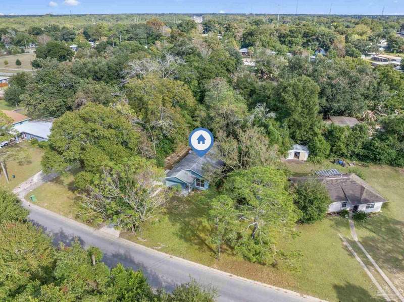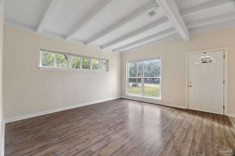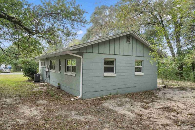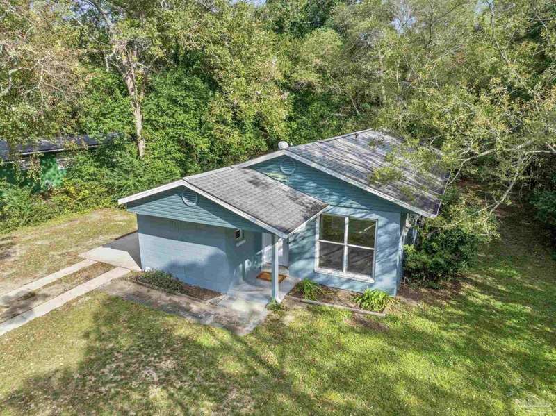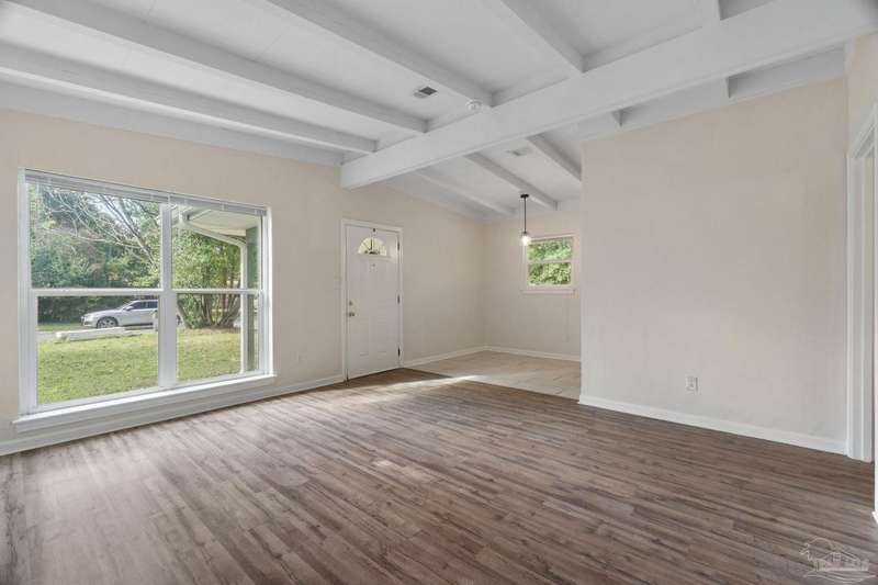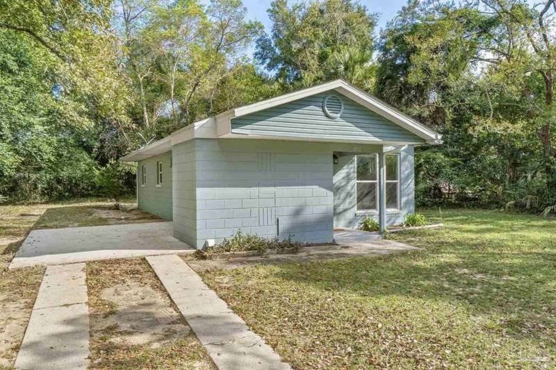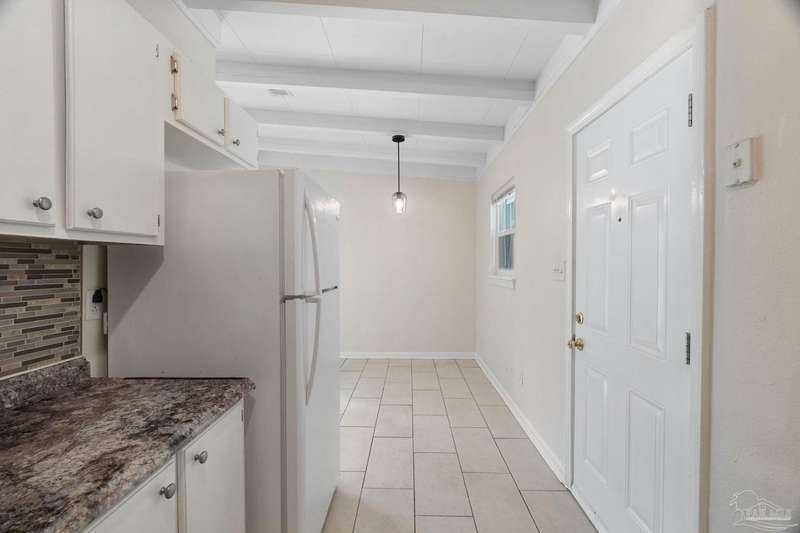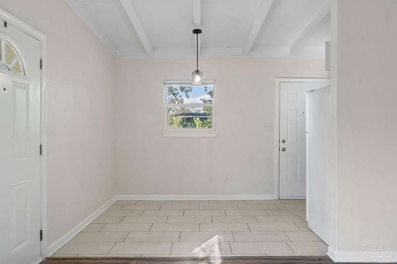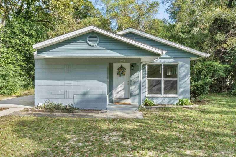 Prepare to fall head over heels for this move-in-ready single-family home in the heart of Pensacola, FL. This mid-century modern property blends character and comfort with vaulted ceilings, exposed beams, and an inviting layout that feels open the moment you step inside. With 3 bedrooms, 1.5 baths, and 1,012 square feet, it's an excellent fit for first-time buyers looking to build equity or investors seeking a low-maintenance rental in a consistently high-demand area of West Pensacola. Inside, you'll find fresh paint, double-pane energy-efficient windows, and updated lighting throughout. The kitchen offers real wood cabinetry, a glass tile backsplash, and 12 x 24 tile flooring. A separate laundry room includes washer/dryer hookups and a brand-new water heater. The living and sleeping areas feature low-maintenance luxury vinyl plank flooring, while the hallway provides convenient built-in storage and the 2018 HVAC supports year-round comfort. Both bathrooms include updated pedestal sinks, mirrors, and lighting, and the main bath features an improved tub/shower combo. Two bedrooms have newer ceiling fans. Outdoors, the .2456-acre lot includes shade trees, an open concrete patio, and plenty of room for weekend projects and gatherings. This property is minutes to Downtown Pensacola, NAS Pensacola, parks, shopping, and dining, offering a great blend of affordability and access. With a full roof replacement available with an acceptable offer, many big-ticket items are already handled. Whether you're entering the housing market or expanding your investment portfolio, this updated Pensacola home delivers value, style, and potential at a price point that's increasingly rare. Come see why this opportunity stands out.