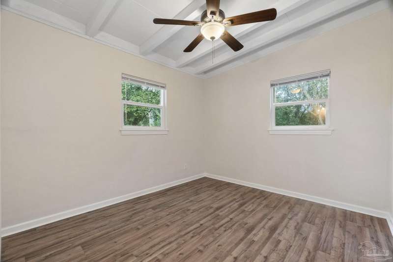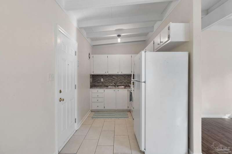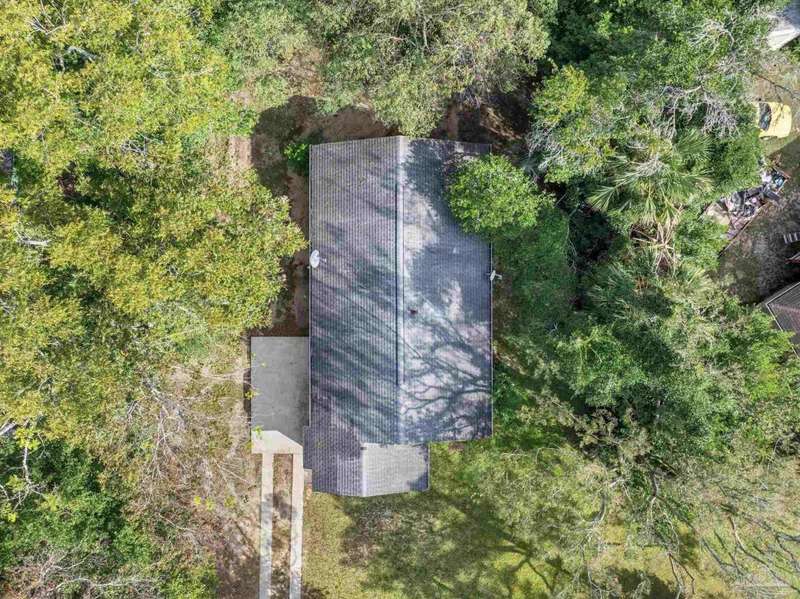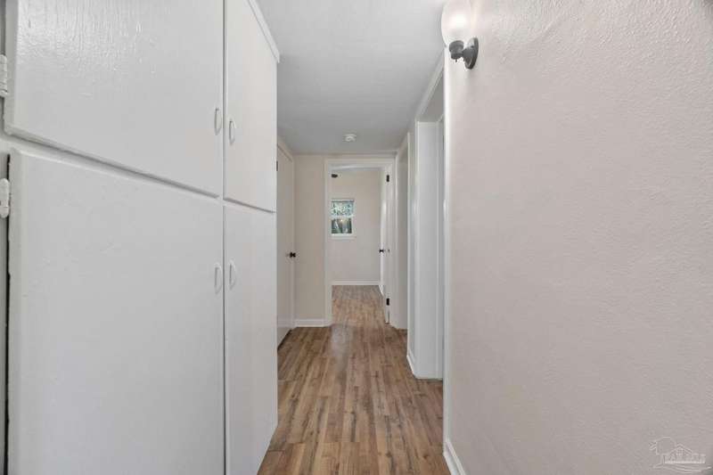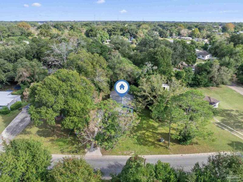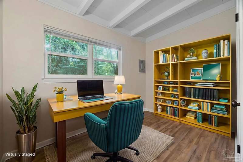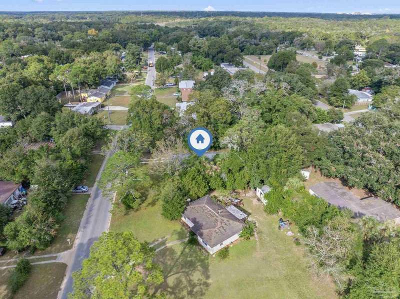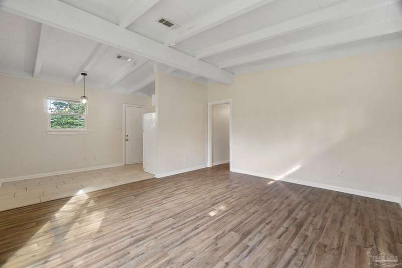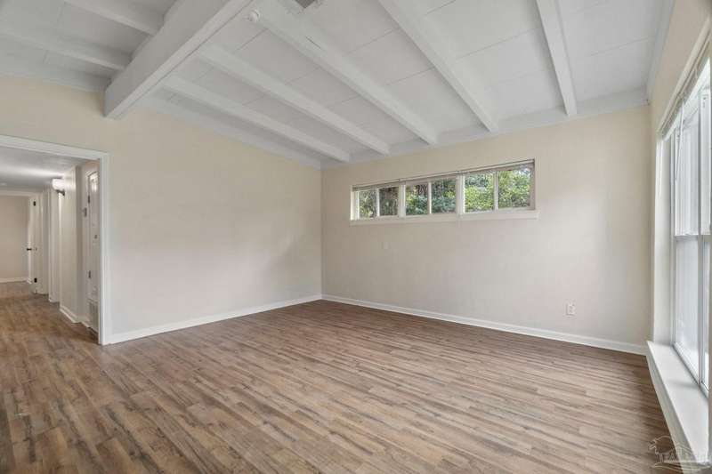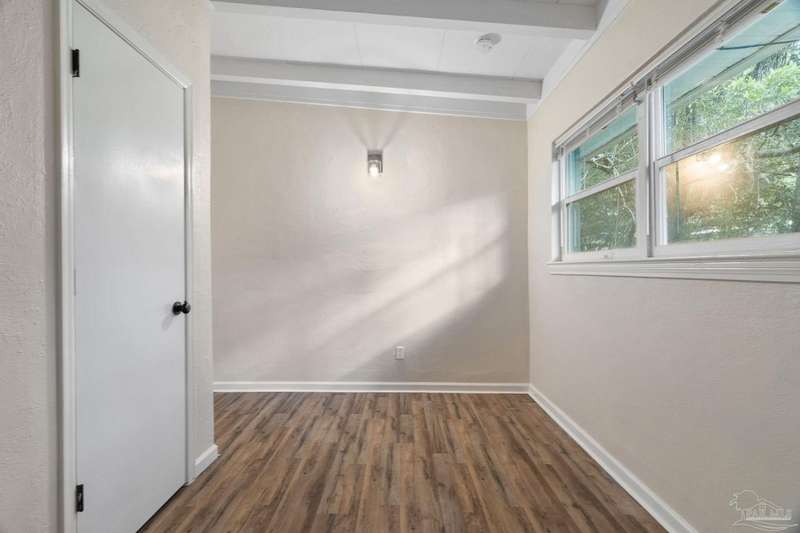Prepare to fall head over heels for this move-in-ready single-family home in the heart of Pensacola, FL. This mid-century modern property blends character and comfort with vaulted ceilings, exposed beams, and an inviting layout that feels open the moment you step inside. With 3 bedrooms, 1.5 baths, and 1,012 square feet, it's an excellent fit for first-time buyers looking to build equity or investors seeking a low-maintenance rental in a consistently high-demand area of West Pensacola. Inside, you'll find fresh paint, double-pane energy-efficient windows, and updated lighting throughout. The kitchen offers real wood cabinetry, a glass tile backsplash, and 12 x 24 tile flooring. A separate laundry room includes washer/dryer hookups and a brand-new water heater. The living and sleeping areas feature low-maintenance luxury vinyl plank flooring, while the hallway provides convenient built-in storage and the 2018 HVAC supports year-round comfort. Both bathrooms include updated pedestal sinks, mirrors, and lighting, and the main bath features an improved tub/shower combo. Two bedrooms have newer ceiling fans. Outdoors, the .2456-acre lot includes shade trees, an open concrete patio, and plenty of room for weekend projects and gatherings. This property is minutes to Downtown Pensacola, NAS Pensacola, parks, shopping, and dining, offering a great blend of affordability and access. With a full roof replacement available with an acceptable offer, many big-ticket items are already handled. Whether you're entering the housing market or expanding your investment portfolio, this updated Pensacola home delivers value, style, and potential at a price point that's increasingly rare. Come see why this opportunity stands out.