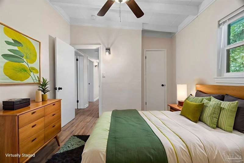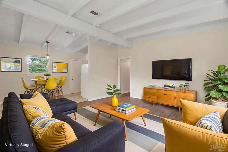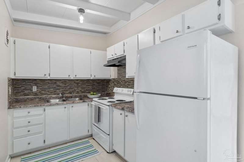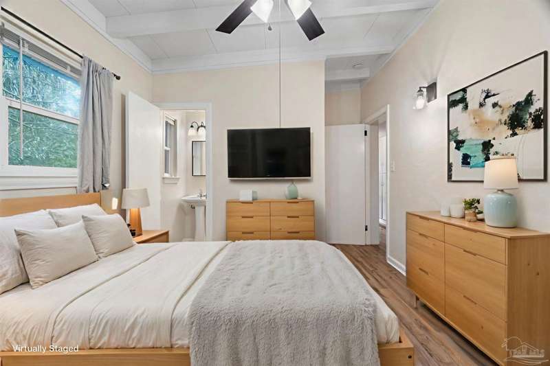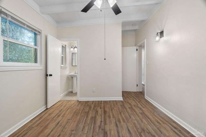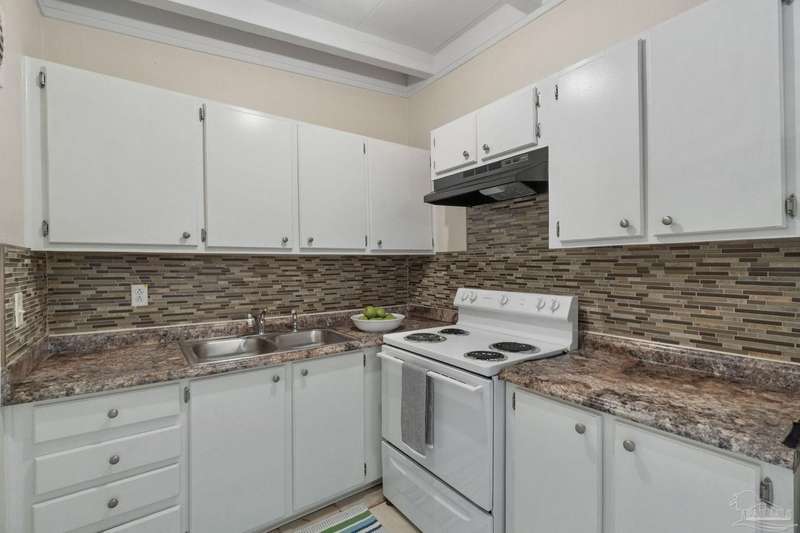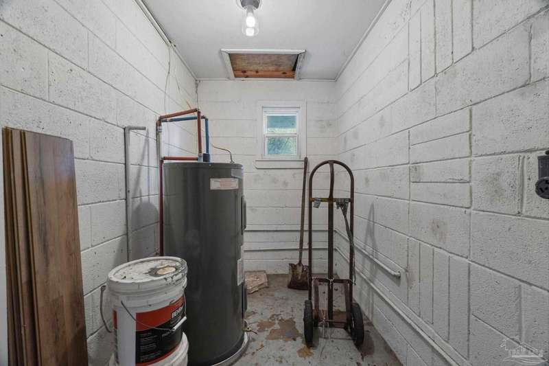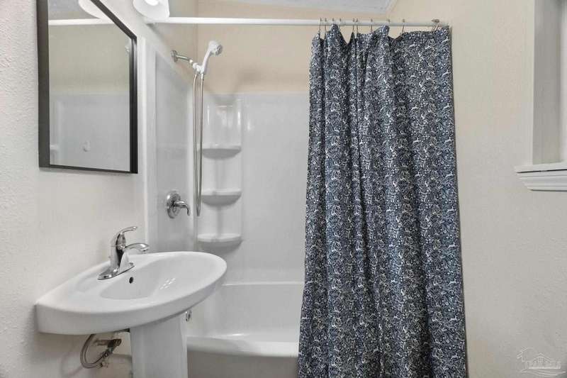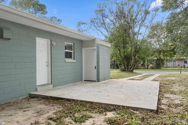 Prepare to fall head over heels for this move-in-ready single-family home in the heart of Pensacola, FL. This mid-century modern property blends character and comfort with vaulted ceilings, exposed beams, and an inviting layout that feels open the moment you step inside. With 3 bedrooms, 1.5 baths, and 1,012 square feet, it's an excellent fit for first-time buyers looking to build equity or investors seeking a low-maintenance rental in a consistently high-demand area of West Pensacola. Inside, you'll find fresh paint, double-pane energy-efficient windows, and updated lighting throughout. The kitchen offers real wood cabinetry, a glass tile backsplash, and 12 x 24 tile flooring. A separate laundry room includes washer/dryer hookups and a brand-new water heater. The living and sleeping areas feature low-maintenance luxury vinyl plank flooring, while the hallway provides convenient built-in storage and the 2018 HVAC supports year-round comfort. Both bathrooms include updated pedestal sinks, mirrors, and lighting, and the main bath features an improved tub/shower combo. Two bedrooms have newer ceiling fans. Outdoors, the .2456-acre lot includes shade trees, an open concrete patio, and plenty of room for weekend projects and gatherings. This property is minutes to Downtown Pensacola, NAS Pensacola, parks, shopping, and dining, offering a great blend of affordability and access. With a full roof replacement available with an acceptable offer, many big-ticket items are already handled. Whether you're entering the housing market or expanding your investment portfolio, this updated Pensacola home delivers value, style, and potential at a price point that's increasingly rare. Come see why this opportunity stands out.