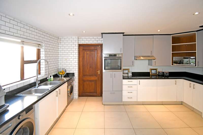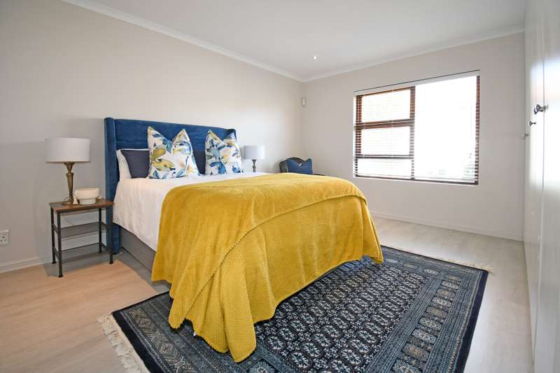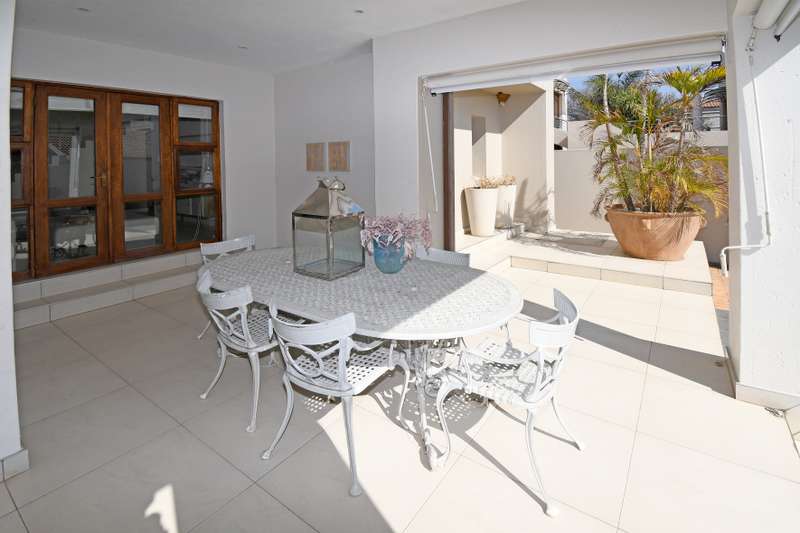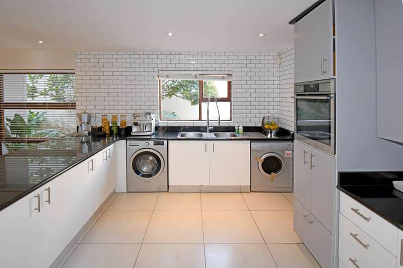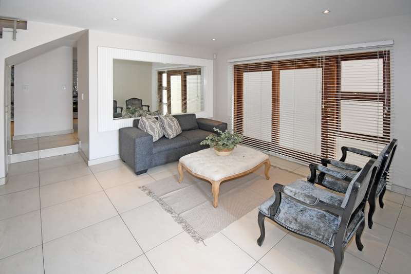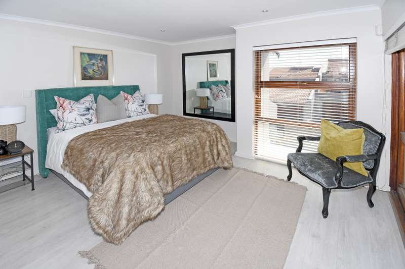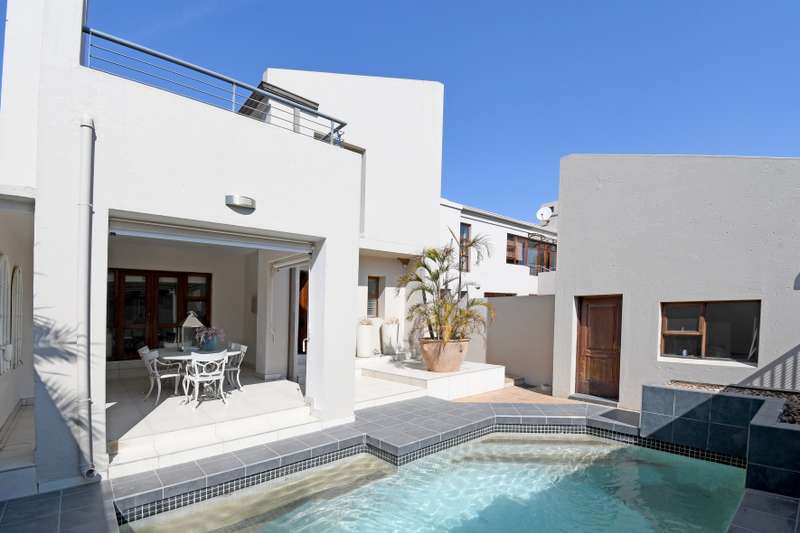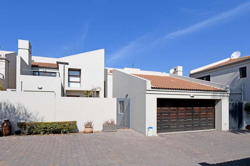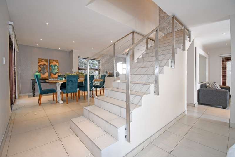 Perfect lock up and go with exceptional security. A young modern contemporary cluster in a centrally positioned complex. The open plan living areas lounge, dining room , family room open onto the covered patio with braai and pool. A free flowing open kitchen with granite tops, eye level oven, space for a double door fridge and 2 major appliances. The feature staircase leads to three sunny bedrooms and two exotic bathrooms. MES has access to the upstairs open patio. Double garage.