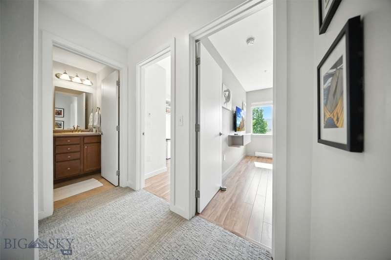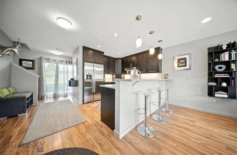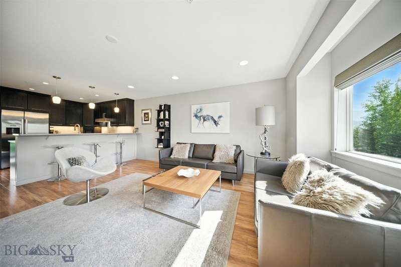 Welcome to this beautifully upgraded 3 bedroom, 2.5 bath Morning Sun condominium in Big Sky's Meadow Village. Perfectly positioned in the front row of the neighborhood, this desirable end unit offers extra privacy with no adjoining unit on one side and sits directly across from trail access to Big Sky's popular Crail Ranch Trail. With 1,348 sq. ft., this condominium combines thoughtful design with high-quality finishes. The residence is being sold fully furnished and features a one-car garage plus a large owner's storage unit. The inviting main living area opens to a private patio with hot tub, ideal for relaxing after a day of adventure. Upstairs, the en-suite primary bedroom includes its own private deck, perfect for enjoying Big Sky's fresh mountain air. The interior showcases many pieces of curated furniture from BoConcepts, a UK-based Danish design brand known for its modern, European aesthetic. The furnishings strike the perfect balance of contemporary style, space efficiency, and high-end craftsmanship, giving the home a refined yet comfortable atmosphere that feels both sleek and welcoming. Additional upgrades include new quartz countertops and cabinetry in the kitchen, upgraded appliances, solid core doors, stylish new light fixtures, and more. Set within a small, quiet complex, this condominium blends convenience, comfort, and sophisticated design in one of Big Sky's most sought-after Meadow Village locations.