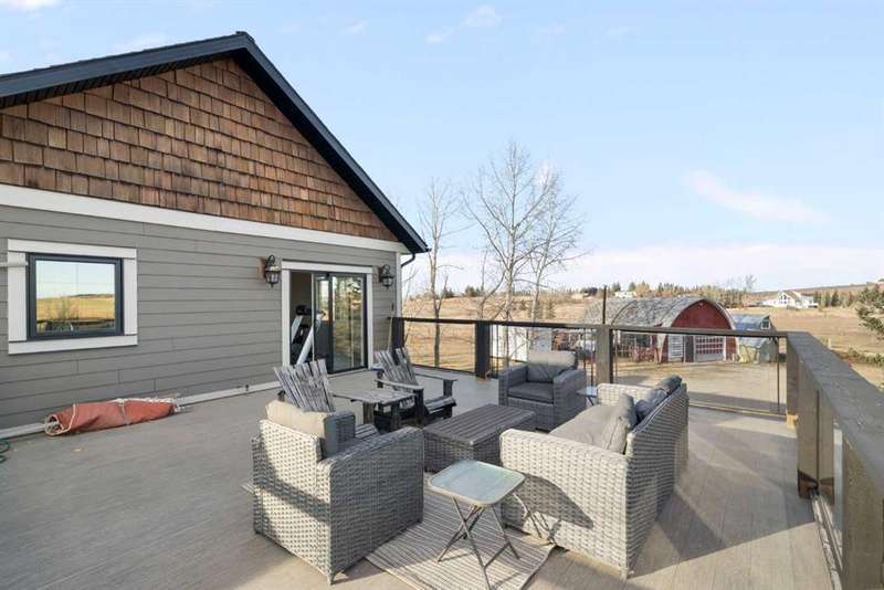 A lifestyle most only dream of! Historic Rocky Mountain views - just 8 minutes to Cochrane! Gorgeous custom-designed two-storey home featuring 4 bedrooms and 3.5 baths, with over 4900 sqft of developed living, AND 1,200 sq.ft. of wraparound decking on two levels. The main floor offers a smart, functional layout with three spacious bedrooms, including a massive primary retreat complete with a huge walk-in closet and luxurious 4-piece ensuite. Two additional bedrooms share another 4-piece bathroom with convenient main-floor laundry. Upstairs, the panoramic mountain views steal the show. The open-concept living space features 20-ft beamed ceilings, a cozy fireplace with built-in bench seating, and direct access to the south-facing deck. The chef-inspired kitchen showcases a full-size Sub-Zero fridge and freezer, granite island with seating, pot-filler over a Wolf six-burner gas range, walk-in pantry, and thoughtful design for everyday family life or large gatherings. The dining area, surrounded by three walls of windows, opens through French doors to another expansive deck — perfect for entertaining or soaking up the scenery. The walkout lower level expands your living options with a spacious one-bedroom suite (approx. 1,450 sq.ft.) featuring an open kitchen, dining, and living area, plus a media room/office, 3-piece bath, and laundry. A private entry makes it ideal for extended family, a caregiver, and successful short/long-term rental income. An interior locking door provides flexibility and security. Lots of options here. The oversized two-storey heated garage with attached carport ensures ample parking and storage. Outdoors, this fully fenced property includes manual entry gates, a quonset, and a charming barn with box and standing stalls, tack room, and loft (no power). Multiple paddocks, pastures with auto-waterers, two horse shelters, and a fenced dog run complete the setup. Enjoy peaceful rural living just minutes from Cochrane — with school bus service, shopping, and entertainment nearby. A short drive takes you to the Rockies and Alberta’s best outdoor playground. Book your private viewing today — this property truly needs to be experienced in person.