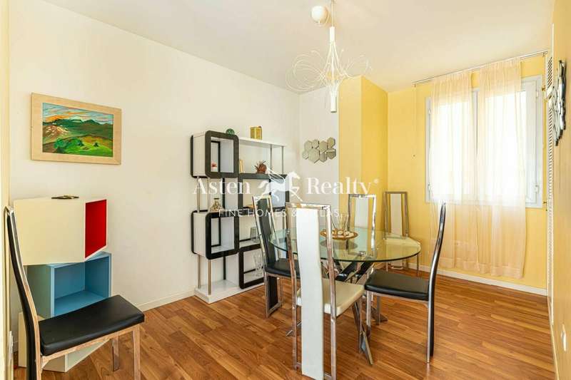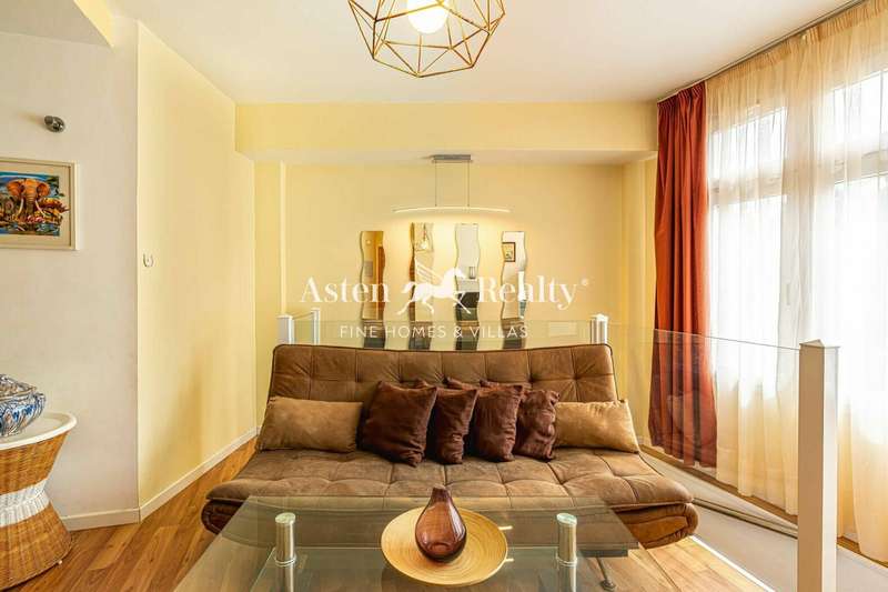 Inside, the main floor offers a cosy living room with dining area, a fully equipped kitchen with modern appliances, and a guest toilet. An elegant wooden staircase leads to the lower level with 3 bedrooms and a spacious bathroom. The smallest room opens onto a patio, perfect for a washing machine and dryer. The apartment is in excellent condition, with dark flooring, white doors, and stylish modern furnishings.