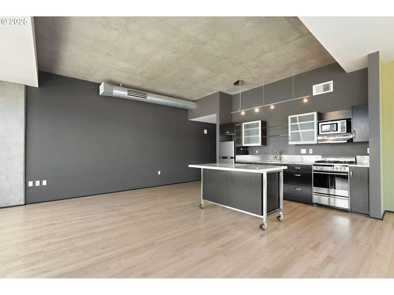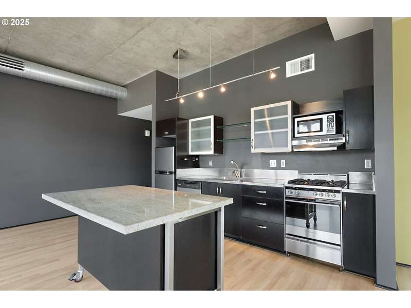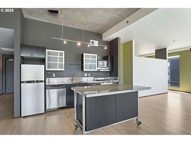Industrial-chic condo in the heart of the Pearl District with sweeping views of the city, West Hills, and spectacular sunsets. Walls of floor-to-ceiling windows for incredible natural light + newly refinished hardwood floors & high concrete ceilings for an edgy modern vibe. Open, flexible layout where you can easily dedicate living, dining & work-from-home spaces. Sleek, streamlined kitchen with a rolling island/eating bar & stainless steel appliances, including a Fisher & Paykel gas range & brand new refrigerator. Generously sized, private bedroom area with double closets, plus additional storage space in the adjoining bath & laundry room. Custom window shades throughout. Building features include secure entry & parking, and a fantastic community room with kitchen, games, library, and patio w/BBQ area. Ditch the car-dependent life & savor a WalkScore of 98, where restaurants, galleries, boutiques, shopping, and Portland’s streetcar are just outside your door!