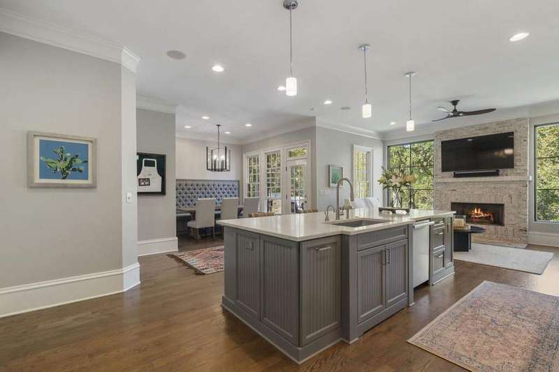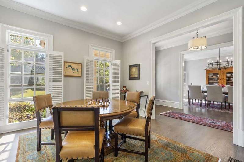 This exceptional Monte Hewett home is perfectly situated on a quiet cul-de-sac in the heart of North Buckhead, and offers a rare combination of architectural sophistication, timeless craftsmanship, and modern livability. Surrounded by beautifully landscaped grounds, this four-level residence is designed for both elegant entertaining and comfortable everyday living. A gracious front porch with gas lanterns welcomes guests into a light-filled interior with 10-foot ceilings on both the main and terrace levels. The stunning gourmet kitchen features walls of windows, quartz countertops, a large center island, new premium appliances, and a breakfast area with custom built-in banquette that opens to an outdoor dining area and kitchen, creating seamless indoor-outdoor flow. The kitchen flows into the keeping room with fireplace, the perfect spot for relaxed gatherings. The spacious family room showcases coffered ceilings, a fireplace, and custom built-ins, while the screened porch overlooks the manicured backyard and a peaceful nature preserve in the distance. A butler's pantry with ice maker connects to the formal dining room, easily accommodating twelve guests. A front living room offers flexible use as a music, game, or Mah Jongg room. Completing the main level are a mudroom with abundant storage and two stylish powder baths. Upstairs, the luxurious primary suite features a fireplace, private sitting room, and a spa-like bath with double vanities, soaking tub, separate shower, and an expansive walk-in closet. Three spacious secondary bedrooms, two full baths, and a landing area with a built-in reading nook complete this level. The fourth floor offers exceptional flexibility-ideal as a media room, home office, craft room, or play space. The terrace level is a true extension of the home, featuring a daylight media/family room with custom cabinetry, temperature-controlled wine cellar, game room, exercise room (optional 6th bedroom), guest suite, 1.5 baths, office, and French doors leading to a private backyard patioIdeally located within walking distance to Sarah Smith Elementary, and moments from PATH400, Chastain Park, and Buckhead's finest shopping, dining, and entertainment, this exquisite home offers an unparalleled lifestyle in one of Atlanta's most coveted neighborhoods.