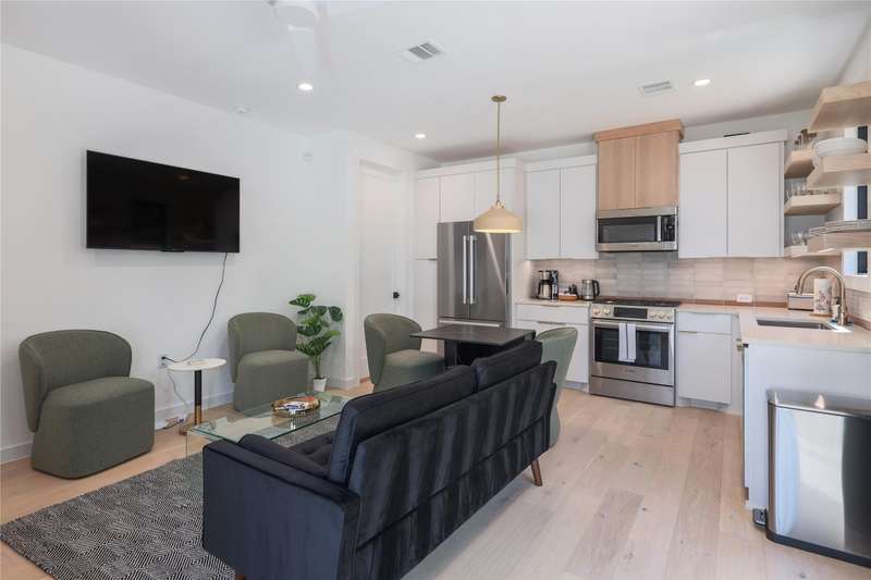 This little gem will make you smile. Come see this Saturday for the 1st showings EVER. This jewel has been occupied constantly occupied since day one on market. Expertly designed to be right-sized and highly functional, all the perfectly curated pieces can convey. Clever built ins and handsome finishes accompany full size appliances in this little house that lives large. The DT Skyline views from your rooftop deck will remind you that you're just a few blocks to downtown Austin. Two full baths, laundry adjacent to bedrooms with good closets, everything fits just so. Cash cow ADU for main house, guest house, office, STR to pay your taxes - so many possibilities.