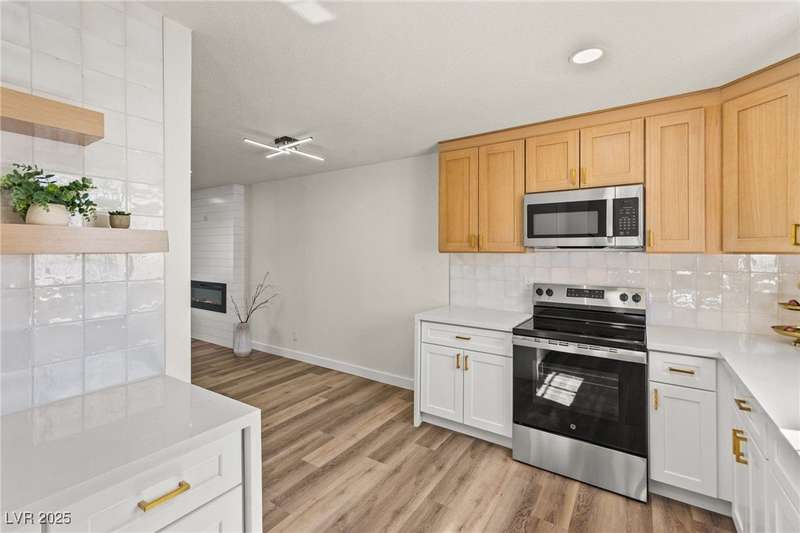Welcome home! This completely remodeled townhome offers luxury living with stylish yet relaxing comfort. This two-bedroom, two-and-a-half-bath home features an open layout with all new tasteful finishes, new kitchen appliances, and LVP flooring throughout. The living room boasts an elegant fireplace feature, and each of the two bedrooms includes a private en-suite bathroom. Additional amenities include a large private back patio and a two-car garage. The townhome is nestled in one of Las Vegas's desirable communities, known for its mature landscaping and abundant real grass. Residents also enjoy a community pool, clubhouse, and tennis court. Turn-key and easy to show; schedule your private tour today!