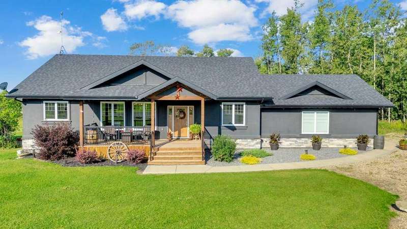 Are you dreaming of wide-open space, fresh country air, and a place where you can enjoy a life of quality and comfort? Currently set up for horses, this property offers countless options with excellent highway access! Located about 20 minutes NE of Rimbey, AB, this 78.5 acres boasts a beautiful 4 bed, 3 bath bungalow with oversized attached garage, 1,600 sq. ft. shop, corrals with cross-fenced high-producing pasture, a landscaped yard, greenhouse, pergola, and more. Every aspect of the Custom-Built Smart Home has been thoughtfully designed by people who understand life in the country. Details that make living easy include a walk-through butler’s pantry leading to the kitchen, conveniently located just off the oversized garage. The open-concept floor plan features a large dining and living area, showcasing the chef’s kitchen with its large island and 6-burner gas stove with electric oven. The primary suite includes an ensuite with access to the main level laundry, a walk-in closet, and extra touches like a towel warmer. Also on the main level: a spacious office with Murphy Bed, a 3-pc bath, and a bright sunroom added in 2024. Downstairs you’ll find three good-sized bedrooms, a 4-pc bath, and a huge rec room with 3 TV hook-ups, a gas fireplace framed in historic reclaimed wood from Germany, and even a hidden workout/bonus room tucked behind a barn door. Smart light fixtures, blackout blinds on south windows, central vac with dustpan, ample storage, and wiring for a hot tub make this home a pleasure to live in. Outside, the property shines with 4 separate pastures, pipe pens, auto waterers, and handling system. And let’s not forget the shop: 1,600 sq. ft. of space with radiant heat, plumbed for in-floor, both 10' & 14' doors, a cement apron, and RV plug-in. There is so much more here than words can capture—you won’t want to miss this opportunity for country living in style and comfort!