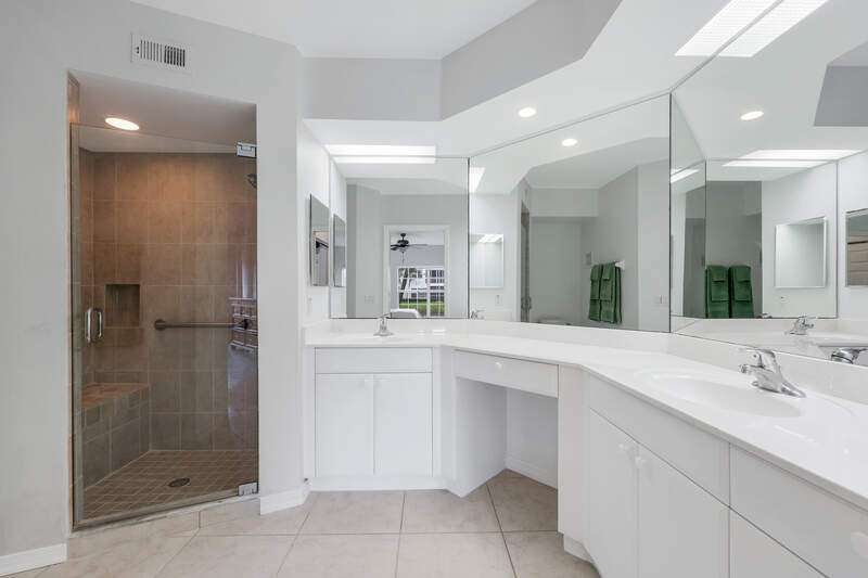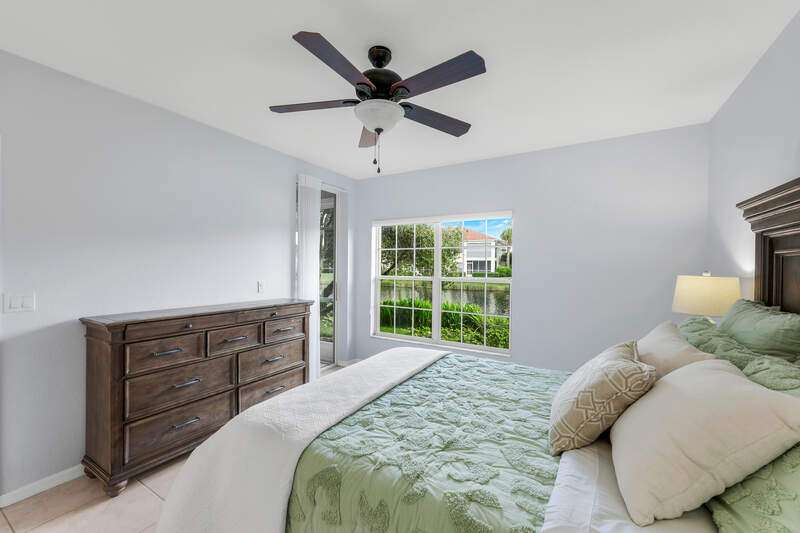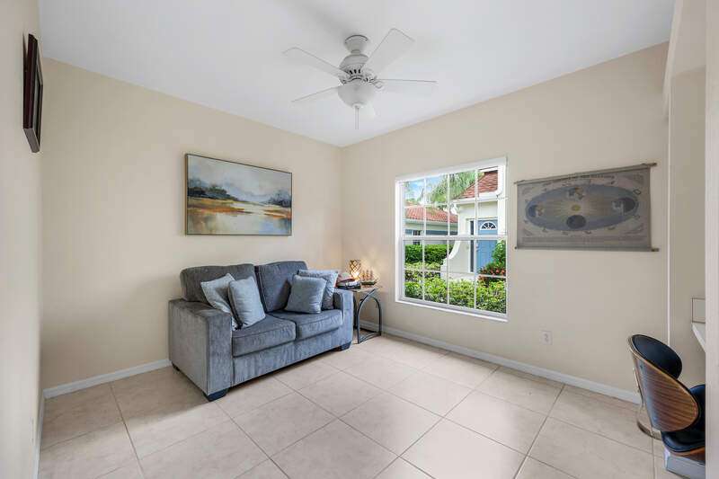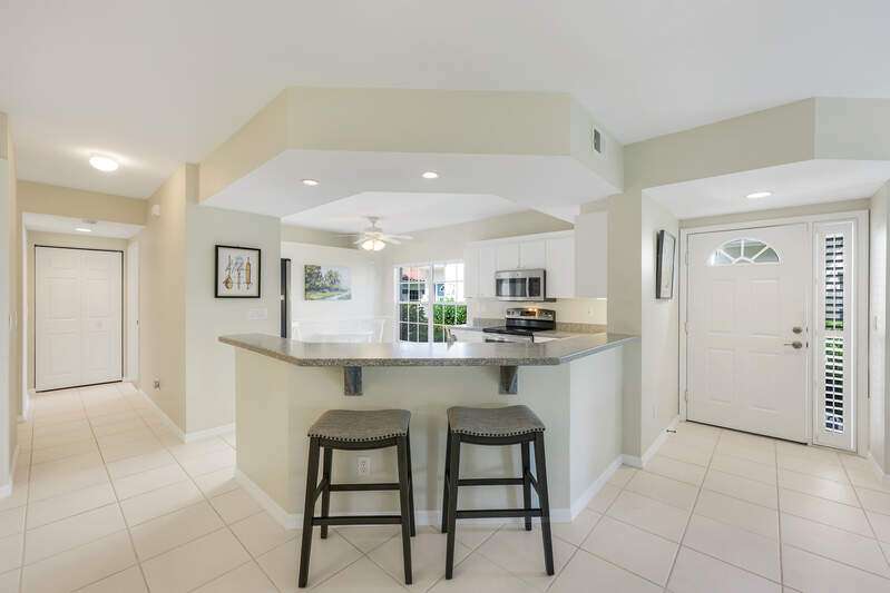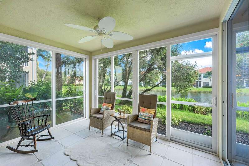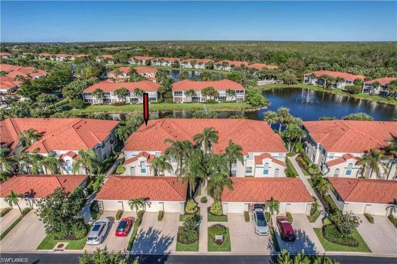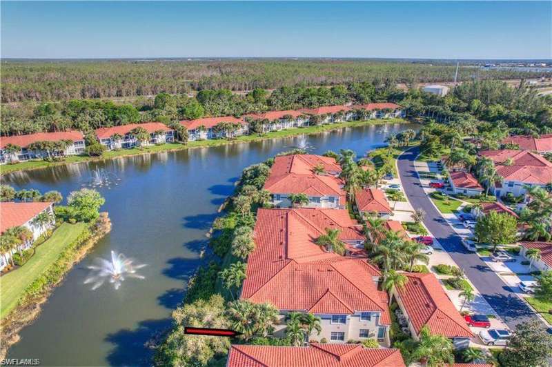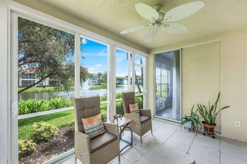 Offered TURNKEY! This meticulously maintained first-floor condo blends comfort, style, and convenience in one perfect package. Step inside and you're immediately greeted by an abundance of natural light and a welcoming open floor plan. Elegant large-format tile flows seamlessly throughout, paired with a calming, neutral color palette that suits any decor. The open kitchen is ideal for both casual mornings and entertaining, featuring a charming breakfast nook, crisp white cabinetry, gleaming granite countertops, stainless steel appliances, and generous storage. Toward the front of the home, you'll find a spacious guest bedroom, a versatile flex room (perfect as a third bedroom, office, or den), and a stylish guest bath. At the rear, the primary suite offers serene lake and fountain views, along with two large closets and a spa-like ensuite bath boasting dual vanities and a walk-in shower. The enclosed lanai, fitted with IMPACT sliding glass doors, expands your living space and allows you to relax rain or shine. For added peace of mind, the community's stone-coated steel roofs were replaced in 2020-built for both beauty and long-term durability. Resort-Style Living at Lighthouse Bay Enjoy a gated community loaded with amenities: 5 pools, including a lap pool, 2.5 miles of scenic walking/jogging paths, Robust bocce program, Tennis courts with an on-site pro, 2 boat houses, fitness center, sauna, clubhouse, and library, Arts & Learning Center and more! As a bonus, a Bronze Membership to The Brooks Commons Club is included, giving you access to a private restaurant, enrichment center, pickleball courts, lively social events, and more. Just minutes to Coconut Point Mall, top dining, entertainment, SWFL International Airport, and the white-sand beaches of Southwest Florida.