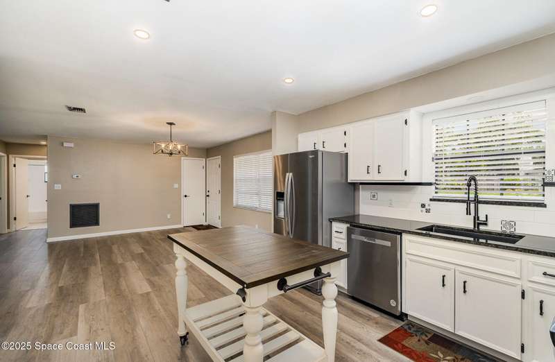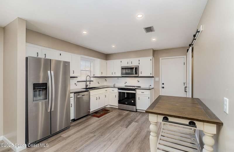 MOVE right into this beautifully RENOVATED ranch-style home with 2 CAR garage, set in a quiet, FAMILY FRIENDLY neighborhood. A NEW Gable ROOF (2024), FRESH PAINT inside and out, and wood-look WATERPROOF flooring pair perfectly with plush bedroom carpet and MODERN tiled baths. The kitchen shines with NEW stainless steel appliances, GRANITE counters and a PANTRY tucked behind a CHIC BARN DOOR. Enjoy the OPEN-CONCEPT layout, RECESSED LIGHTING in living areas, CEILING FANS in every bedroom, and CUSTOM CLOSET SHELVING. Relax on the EXPANSIVE glass-enclosed PORCH or take in the curb appeal with its charming front overhang. Minutes from schools, the Intracoastal, and Fay Lake Parkthis home blends style, comfort, and convenience.