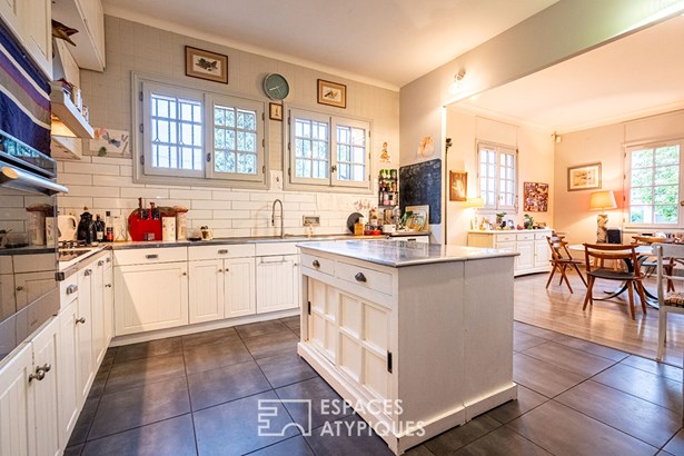 From the moment you step inside, the tone is set: the house combines timeless charm with modern comfort. A spacious hallway leads to a fully equipped independent kitchen, a convivial dining room, and a large, light-filled living area enhanced by a fireplace and direct access to a terrace overlooking the landscaped park. The night area includes a master suite with dressing room and bathroom, as well as two bedrooms sharing a shower room. A second hallway with an office nook leads to two additional large bedrooms, a shower room, and a separate toilet.