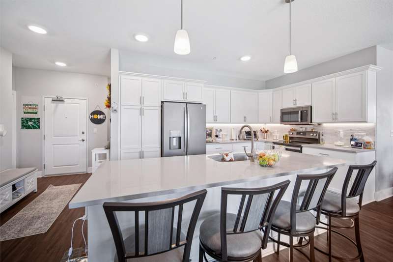 Welcome to Aventura - an active 55+ community in the heart of West Des Moines! This spacious 2-bedroom, 2-bath, corner-unit condo offers 1,630 sq ft of comfort and style on the ground floor, northwest corner of the building. The gourmet kitchen features an 8-ft island, abundant cabinetry, and quartz countertops throughout. A bright office/den with French doors provides the perfect workspace. Enjoy easy access outdoors through sliders to a covered patio that opens directly to the parking area. Additional conveniences include designated underground parking in a heated garage and a private storage room just down the hall. Experience maintenance-free living with top-tier amenities - modern fitness center, golf simulator, elegant community kitchen, and a vibrant calendar of social activities. A clean, stylish entryway and thoughtfully designed common areas enhance the upscale welcoming feel. Discover comfort, connection, and carefree living at Aventura!