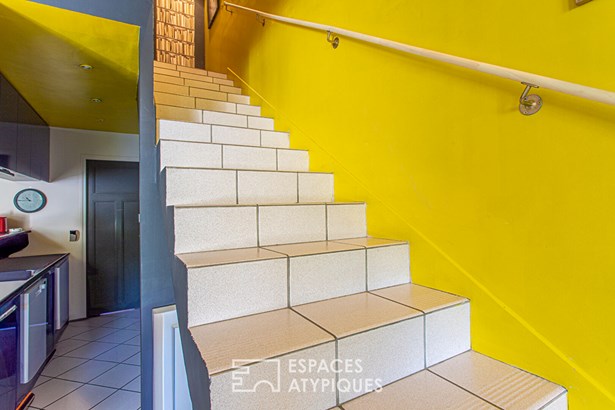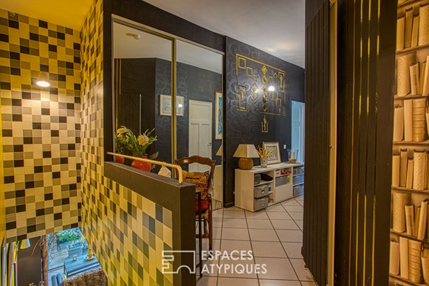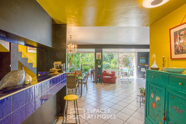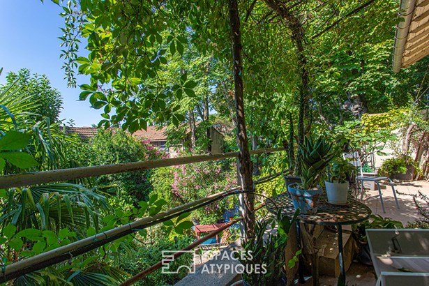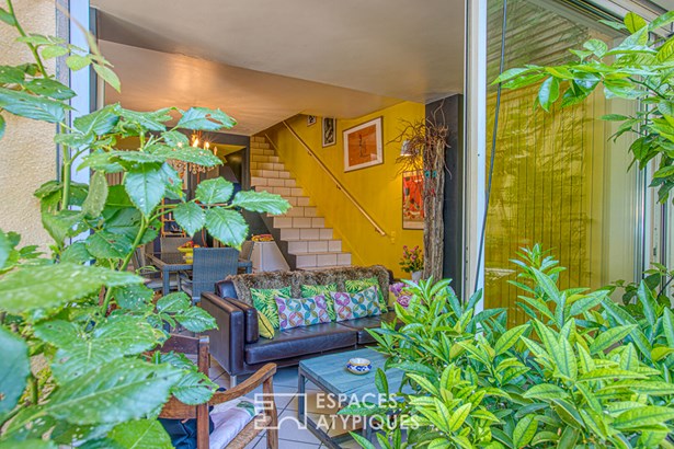 From the entrance, the originality of the place is evident: bold hues and meticulously thought-out decor invite you to discover an extraordinary interior. The spectacular living room opens through two large bay windows onto a timeless hanging garden. This true living space was designed as a place of sharing and light, combining generous volume and a warm atmosphere. An integrated garage, directly accessible from the interior, as well as clever storage and a toilet complete this level with practicality.
