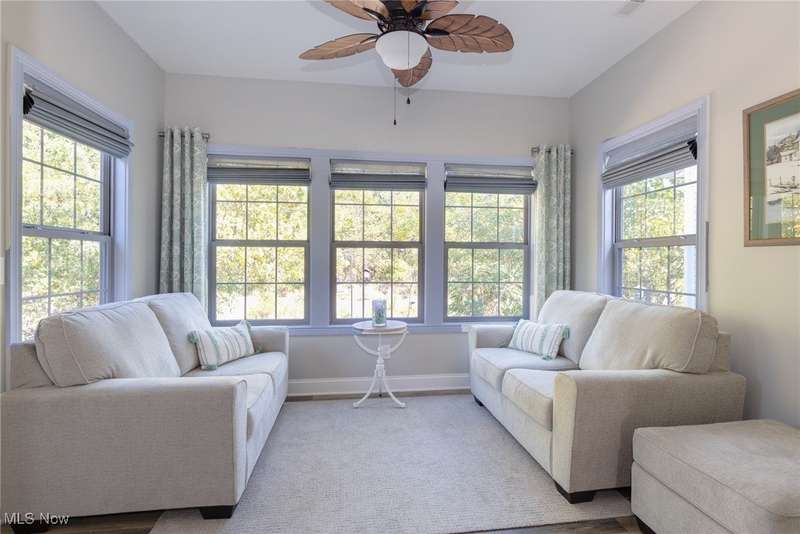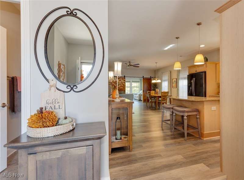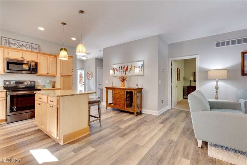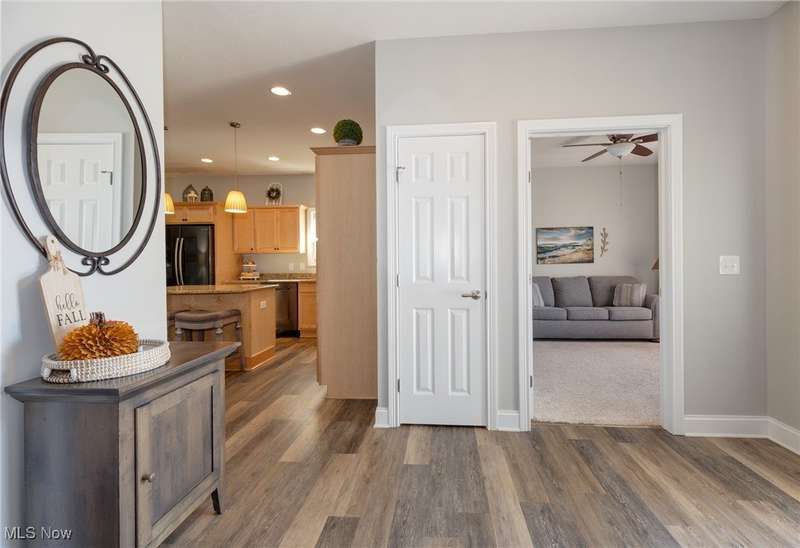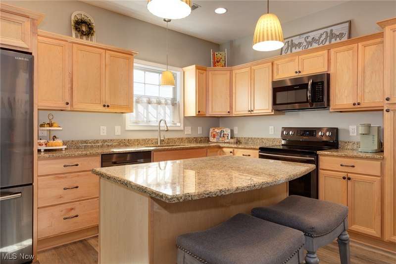 Welcome to Seville and this beautifully maintained 2016-built ranch offering the perfect blend of comfort and style. This 3-bedroom, 2-bath, pond waterfront home features an open floor plan with 9 ft. ceilings, and abundant natural light throughout. The family room is anchored by a cozy gas fireplace, while the upgraded kitchen offers maple-finish cabinets, granite countertops, and luxury vinyl flooring that flows through the main living areas. The four-season sunroom with barn doors is a peaceful retreat, complete with custom blinds and gorgeous views of the pond and trees that provide privacy. Step outside to the patio to enjoy nature at its best with this waterfront location! The spacious owners' suite includes a huge walk-in closet and a private bath with an upgraded one-piece shower. The second full bath is generously sized, making it ideal for family or guests. Fresh, neutral paint throughout enhances the bright and airy feel. The garage includes more than parking. Within the garage is an enclosed, heated workshop/craft area with its own sink ... perfect for hobbies or extra storage year-round. Outdoor living is easy with a covered front porch and a private backyard setting. Located in an ideal spot within the development, this home offers tranquility while being just minutes from I-71, Route 224, and the charming shops and dining of downtown Seville. A low monthly HOA of just $125 per month covers, among other things, landscaping and snow removal, providing ease and peace of mind. With thoughtful upgrades, one-floor living, and an unbeatable location, this home is ready to welcome you!