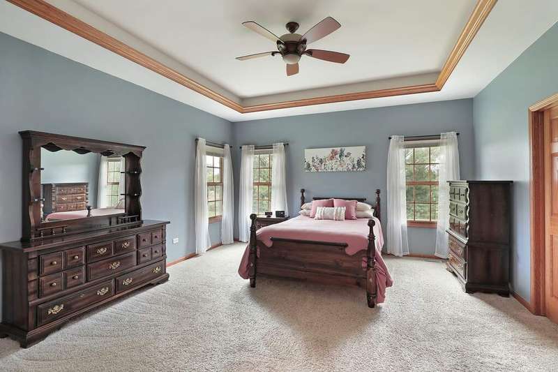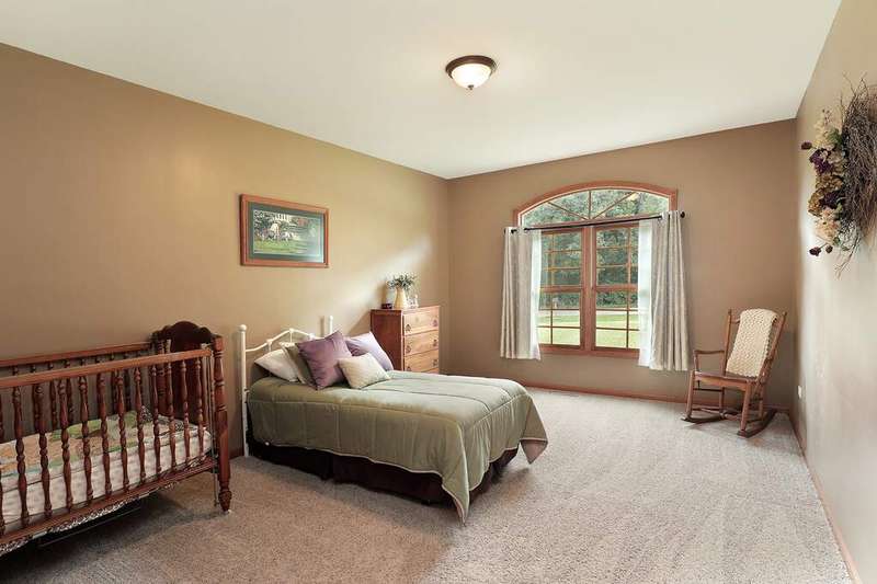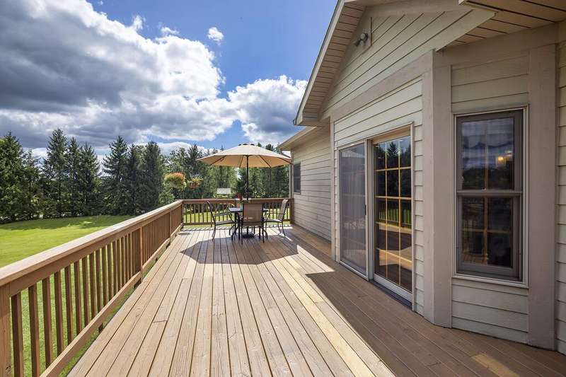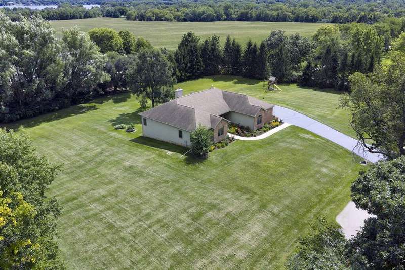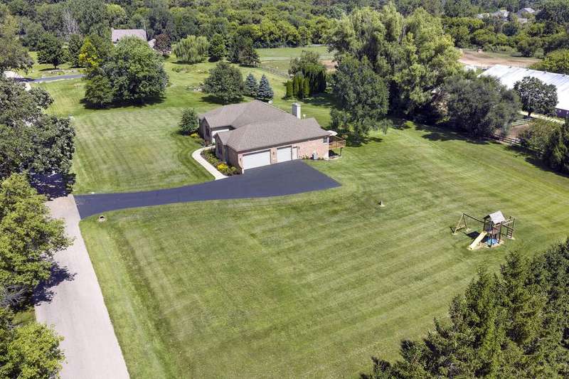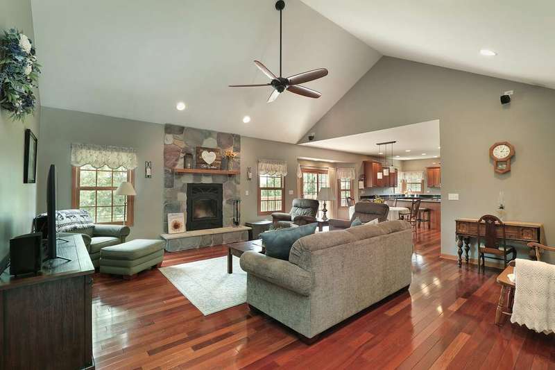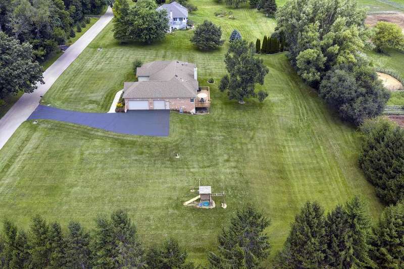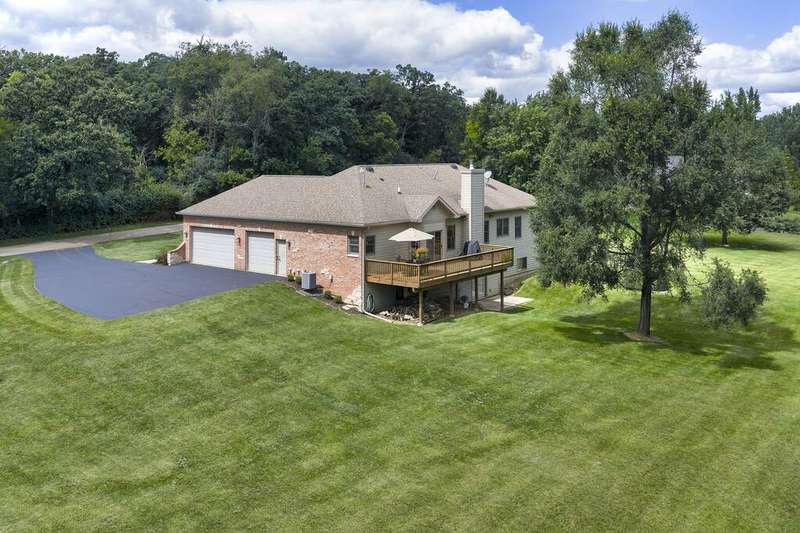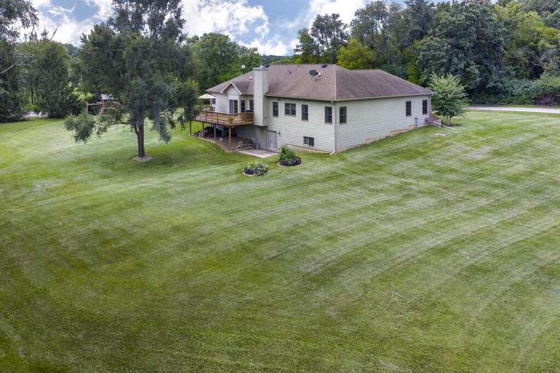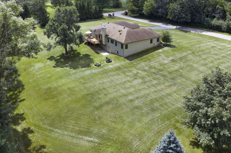 Rare and highly desirable Ranch sitting on a lush 2 Acre Lot with beautiful views out of every window. Enjoy the open-concept layout featuring 9 ft ceilings throughout, a fantastic great room with vaulted ceilings, and a stunning stone fireplace which is the heart of the home. Spacious kitchen with ample cabinet space, granite countertops, and a huge walk in pantry. Step out onto the deck and take in the fresh country air and peaceful setting. A lovely home office sits at the front of the home with views of the perennial gardens. The primary suite with trey ceilings is a luxurious retreat showcasing a whirlpool soaking tub, oversized shower, and a spacious walk in closet in addition to a standard closet. The main level also includes 2 more generous sized bedrooms and full bath as well as a half bath off the living room. The light-filled lower level offers a true walk-out basement with French Doors and is ready for your personal touch. 4th bedroom downstairs (does not have a window) and full bath as well. Solid, 6 panel doors. 3 car garage is heated with an extra tall ceiling in addition to massive storage accessed by a pull down stair. New on demand tankless hot water heater (2024) New oven/range. (Gas line to range available).