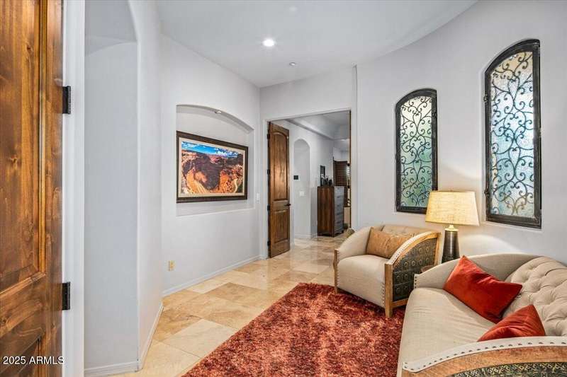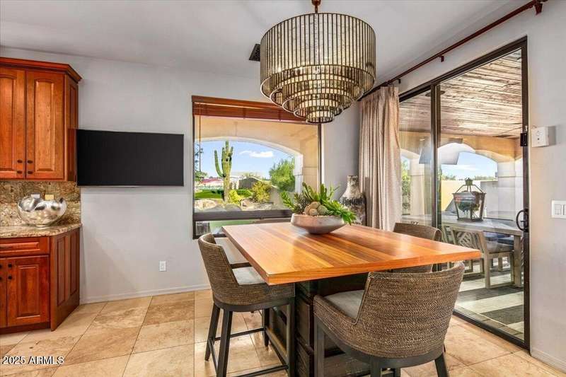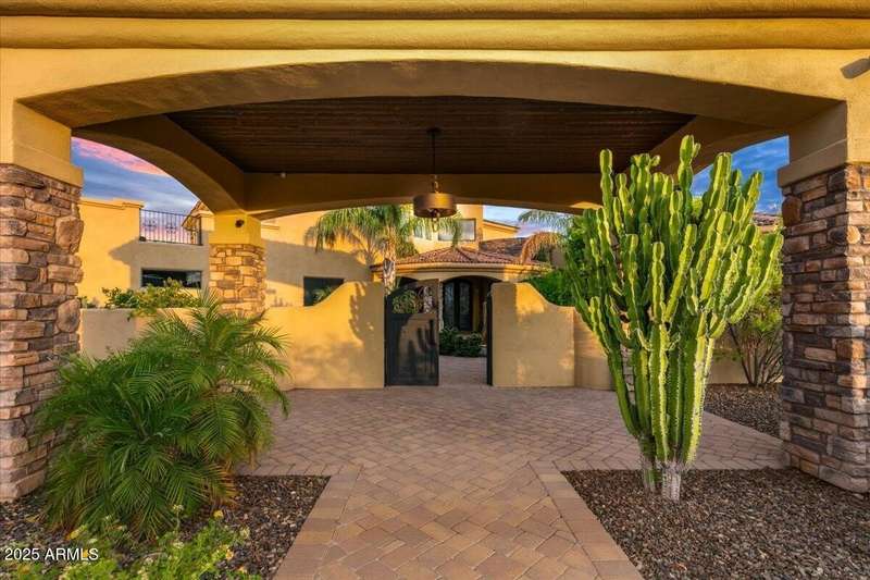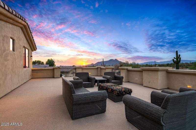 Set on over an acre in North Scottsdale, this expansive 4,985 sq ft estate captures the essence of high-desert living with panoramic mountain views, twinkling city lights, and unforgettable Arizona sunsets. With 4 bedrooms, 3.5 bathrooms, and a thoughtfully designed dual-level layout, the home combines refined luxury with everyday comfort - perfect for both entertaining and a quiet retreat. The primary suite is conveniently located on the main level and features a cozy fireplace, private entry, and spa-like bathroom. Sun-warmed stone floors and walls of glass blur the line between indoors and out, while smart-home technology and designer finishes add effortless sophistication throughout. At the heart of the home is a chef's kitchen designed for both function and style, complete with three ovens, an eight-burner gas range with pot filler, quartz countertops, custom cabinetry, and a pass-through window for seamless patio dining. Multiple living areas flow naturally from the kitchen, including a temperature-controlled wine cellar and a custom-designed owner's closet that elevates everyday living. The outdoor spaces rival any luxury resort. Relax by the heated pool and spa with spillover edge, enjoy alfresco dining beneath the palapa, or unwind by the reflection fountain. A splash pad, private putting green, and multiple patios create endless opportunities for recreation and relaxation under Scottsdale's year-round sunshine. Additional highlights include an oversized garage with epoxy floors, extended driveway with RV parking, and no HOA restrictions, giving you the freedom to enjoy the property to its fullest. Every detail has been thoughtfully curated, from reclaimed wood accents and pendant lighting to 9'+ flat ceilings and integrated Control4 home automation. Offering a rare blend of privacy, natural beauty, and timeless design, this exceptional residence is not only an ideal family home, it also presents strong potential as a luxury income-producing property.