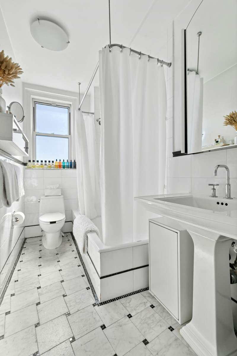 The windowed bathroom has been updated with new floors and tiles. ;