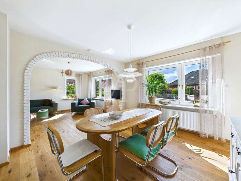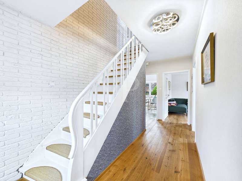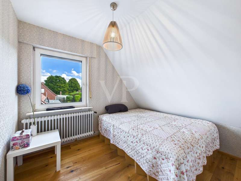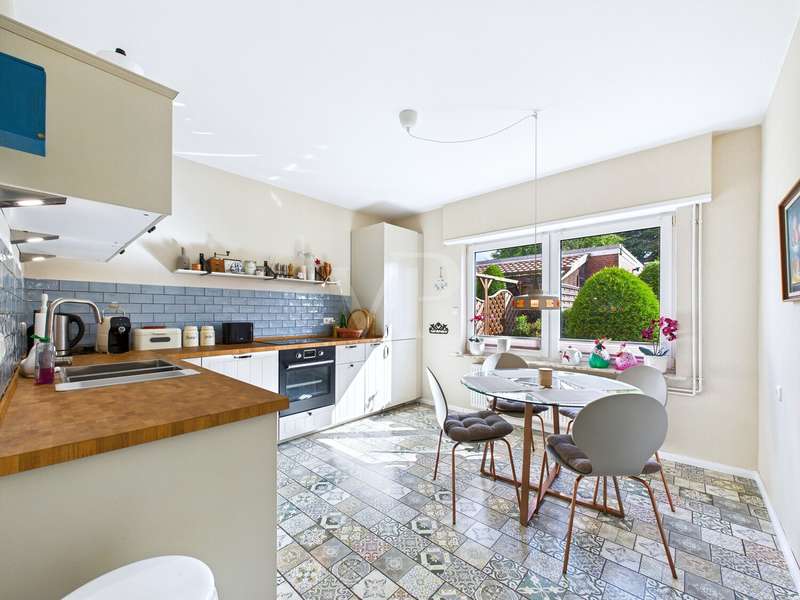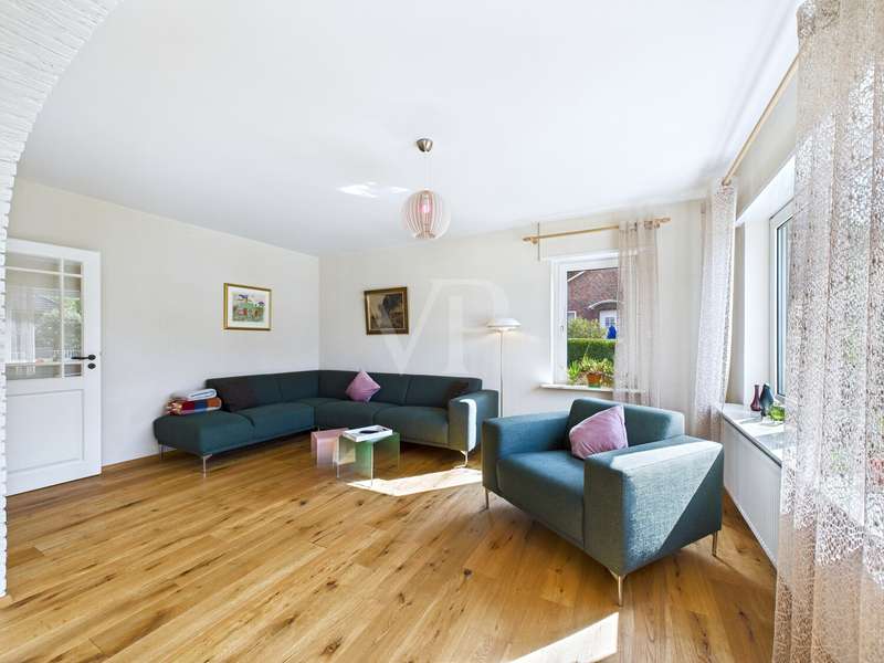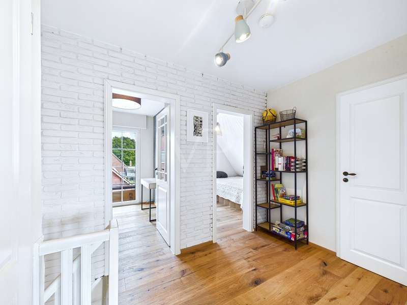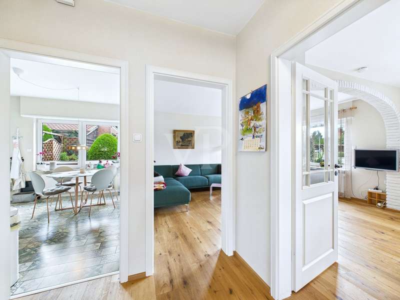 This modernized detached house was built around 1965 on a plot of approx. 718 m² in a central location in Westerholt. The bright and well-designed rooms are spread over a living space of approx. 115 m². Upon entering the property, you first enter the bright hallway, which leads to the spacious living and dining area on your right. Next to the living and dining area you will find the recently fitted kitchen, which lends a cozy and timeless character thanks to the bright motif tiled floor in combination with the as-new fitted kitchen. At the end of the hallway, you enter a second hallway. This leads on to the bathroom and a guest WC. The bathroom has a walk-in shower and was renovated in 2019. Complemented by a window element into the garden, the hallway benefits from sufficient natural light and also offers an unobstructed view of the garden and the sunny terrace. At the same time, two further rooms can be reached from the rear part of the hallway, which can be used individually as a storage or hobby room, for example. The top floor of the property can be reached via a real wood staircase, which is located in the front hallway. The staircase has also been treated with great care and was freshly sanded and repainted some time ago. There is a spacious bedroom on the top floor. Opposite, two further rooms, which are ideal for use as children's or guest rooms, round off the floor plan. To complete the space on offer, the WC located here has been extended with a bathtub and completely modernized. A side room offers further storage space and access to the attic. The property is equipped with external blinds. These can be controlled electrically on the first floor. The property has been continuously modernized in recent years. In addition to the bathroom, the roof was renewed and insulated in 2017. High-quality real wood parquet was laid in the bedrooms and living rooms. Outside, the offer is complemented by a partially covered sun terrace and a balcony. From the terrace, you can access a garden shed, which offers further space for individual uses. The garage next to the property is equipped with an electric sectional door. Come and see this charming property for yourself!