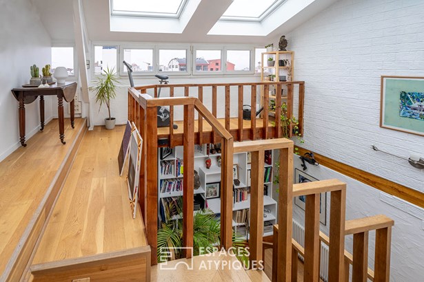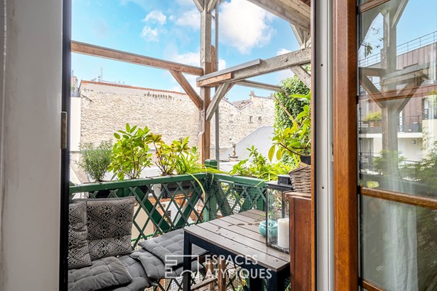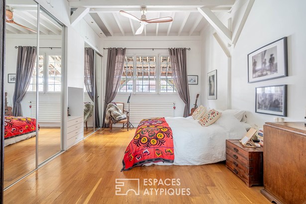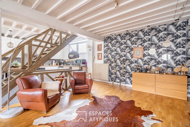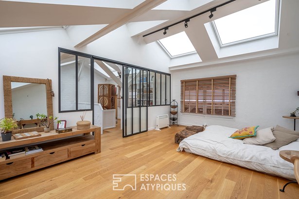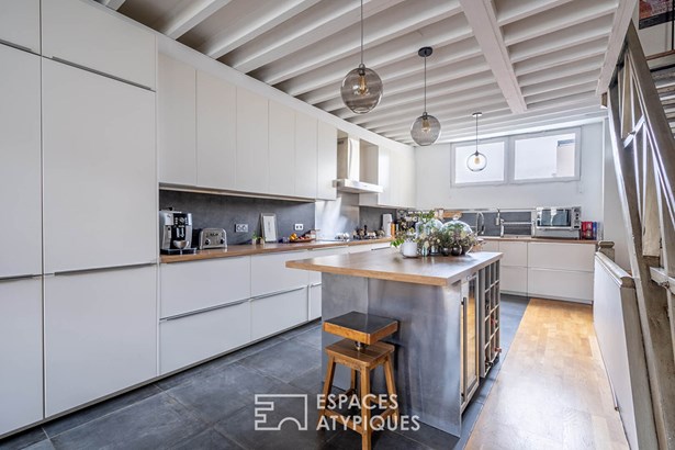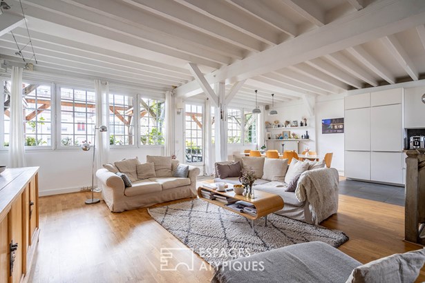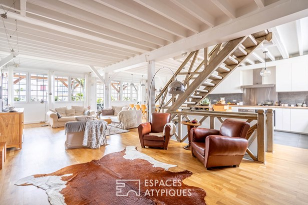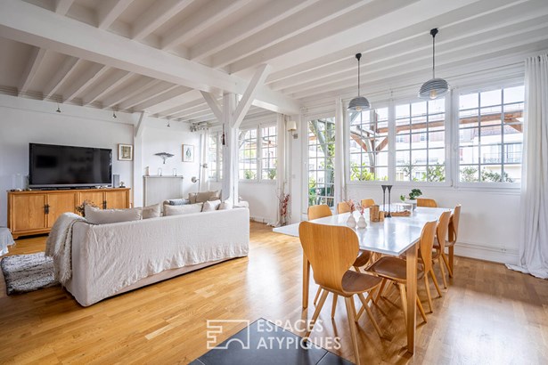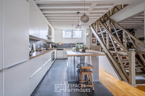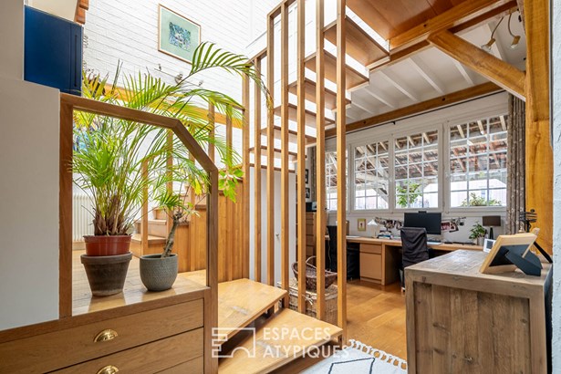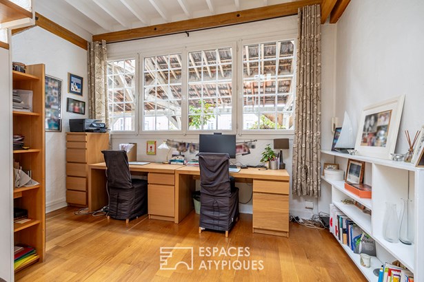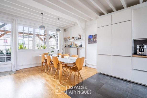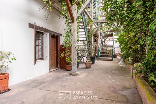 Located near Porte Chaumont and the heart of Pre Saint Gervais, nestled in a private tree-lined courtyard, is a 202 m2 (192.52 m2) loft built on three levels.