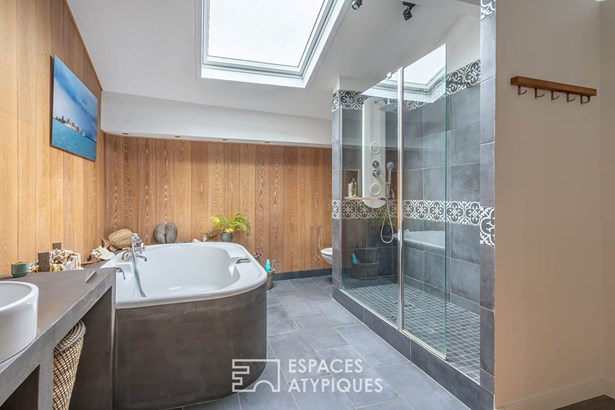 The tasteful decor, the choice of materials and natural tones such as wood combined with cement tiles, combined with modern materials and numerous openings, give the space a cozy and contemporary feel, ideal for entertaining and family life.